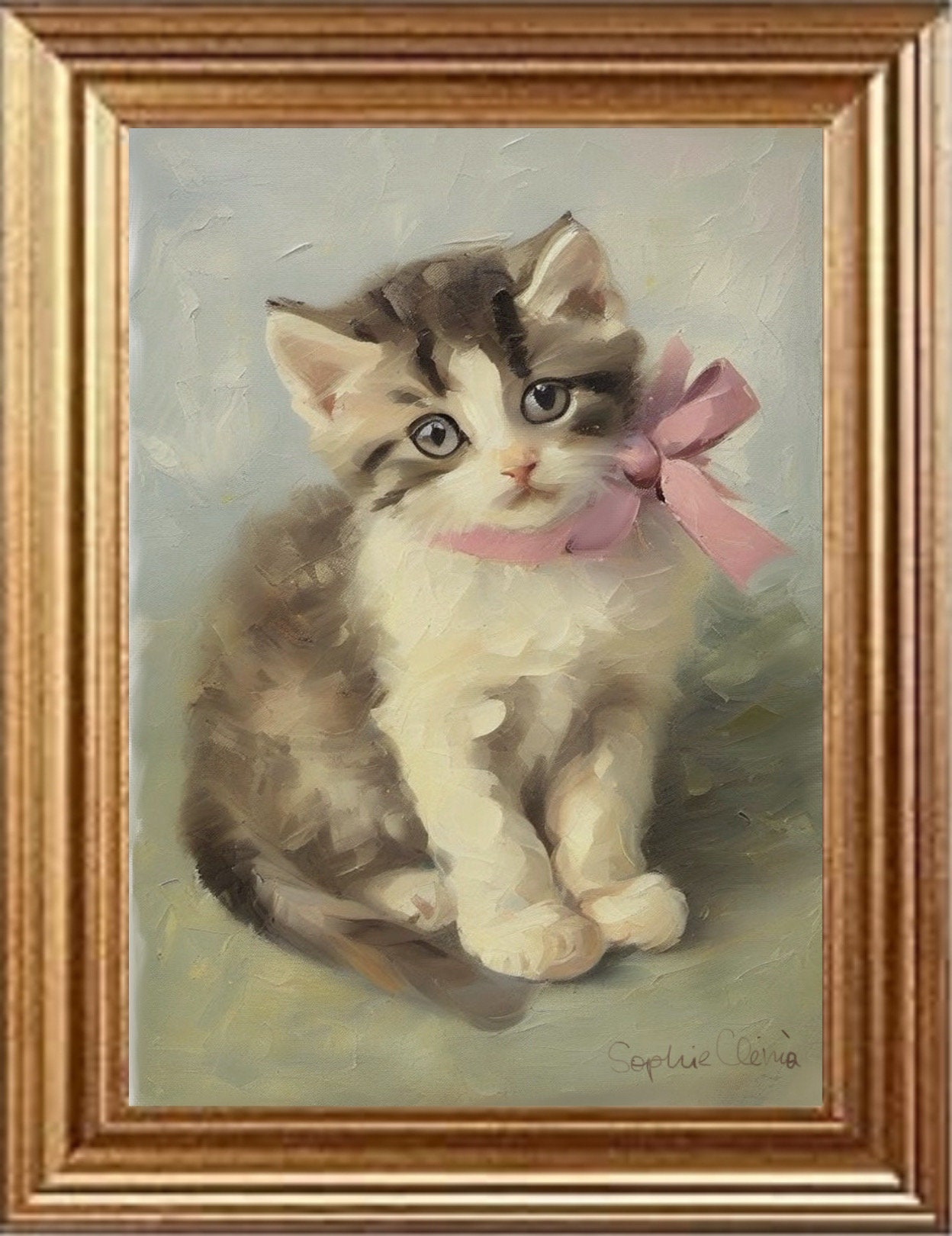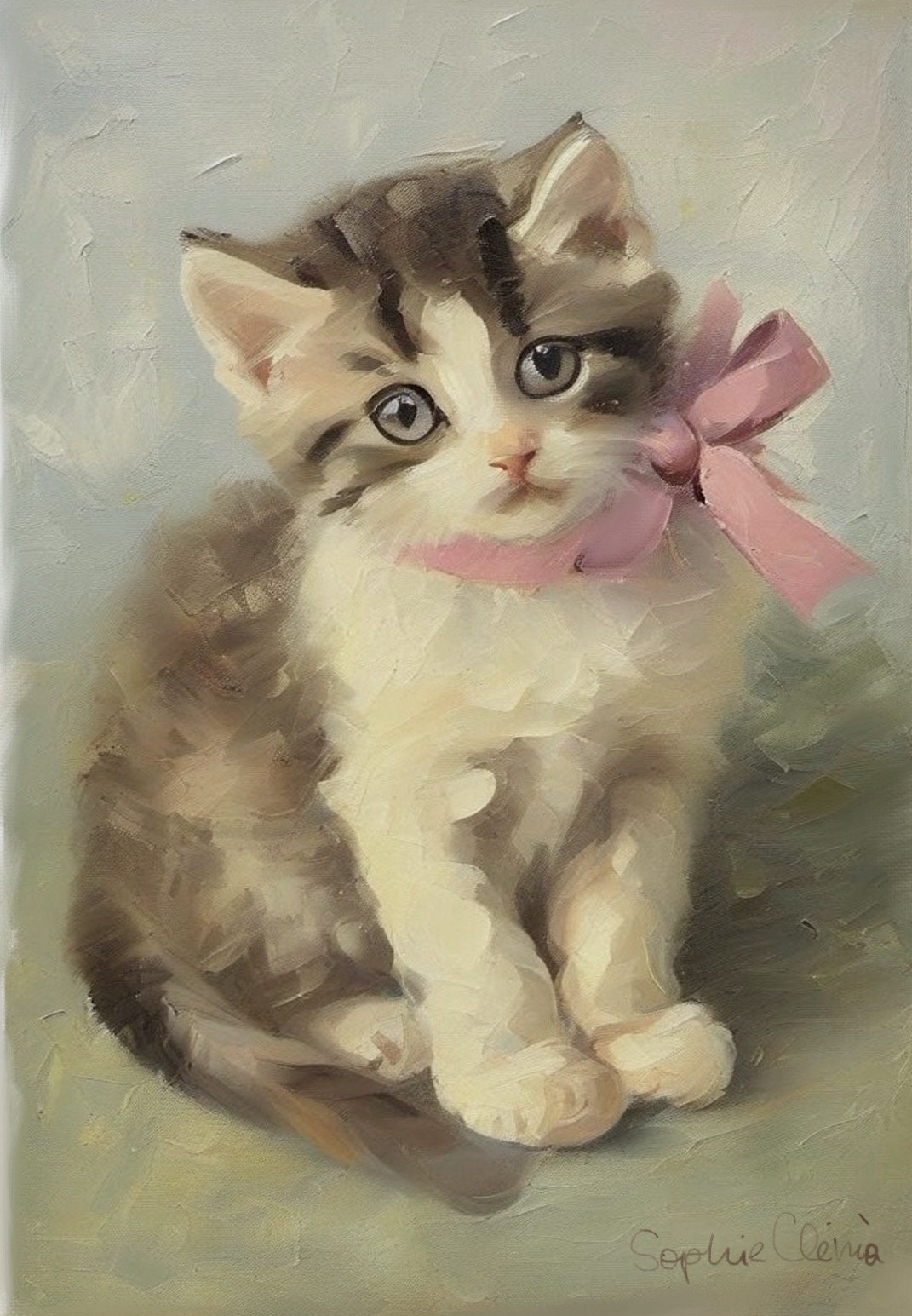 PLEASE NOTE SIZES ARE IN CM. Cute kitten with pink bow print of my original oil painting. Fun and whimsical piece. Paper prints include border for framing, canvas prints ship ready stretched and UV varnished, Paper prints are shipped rolled in a hard cardboard tube.