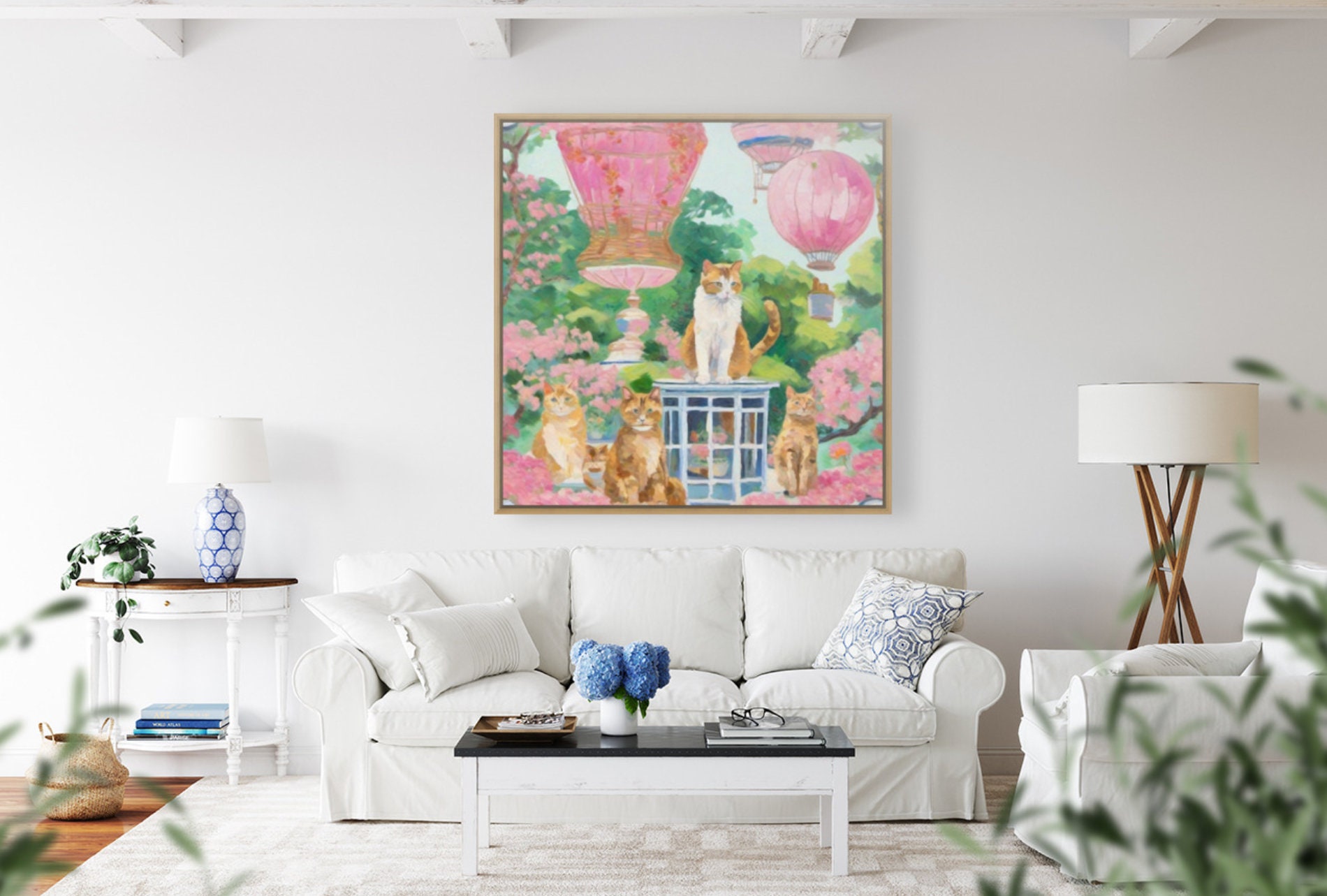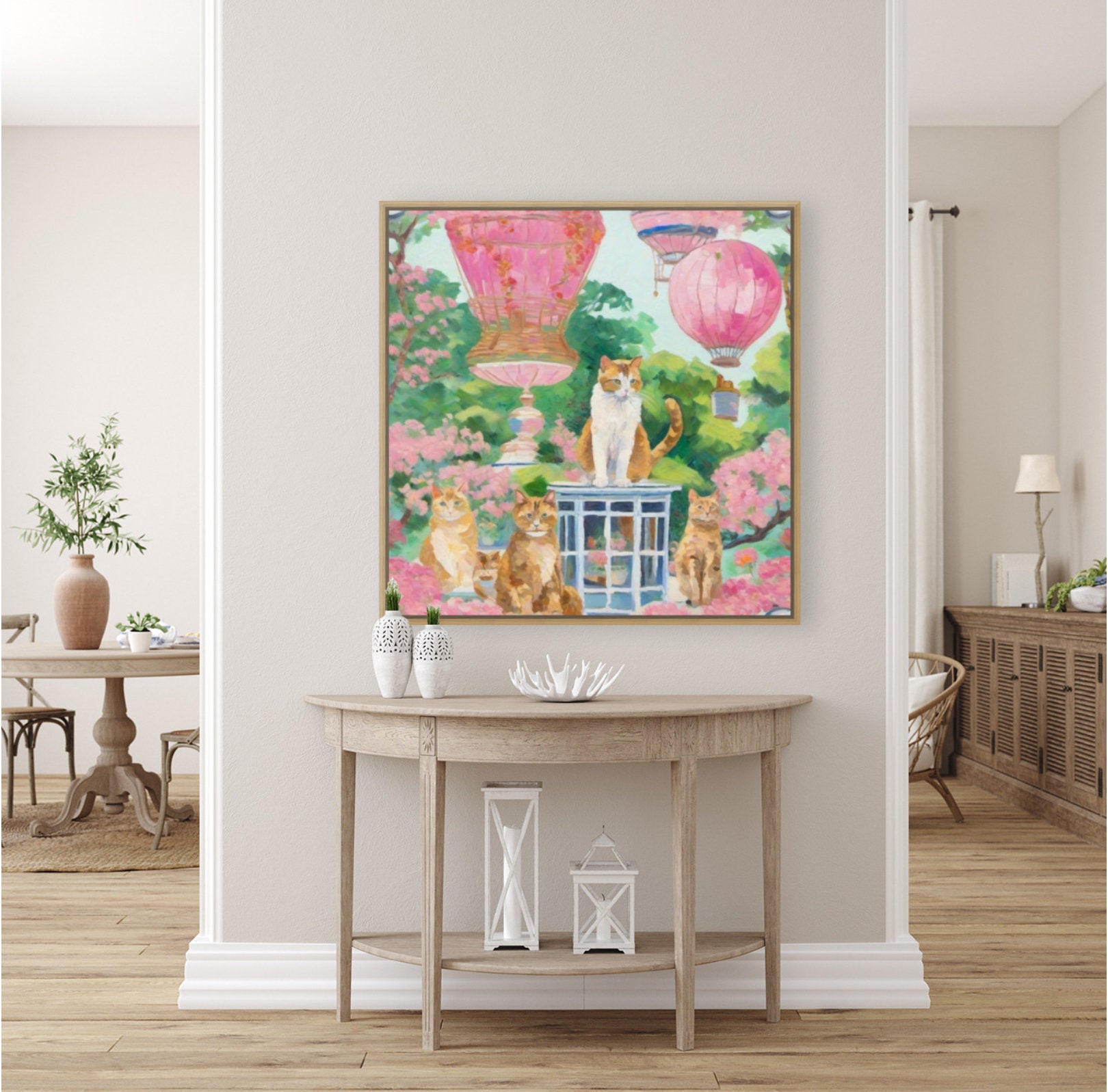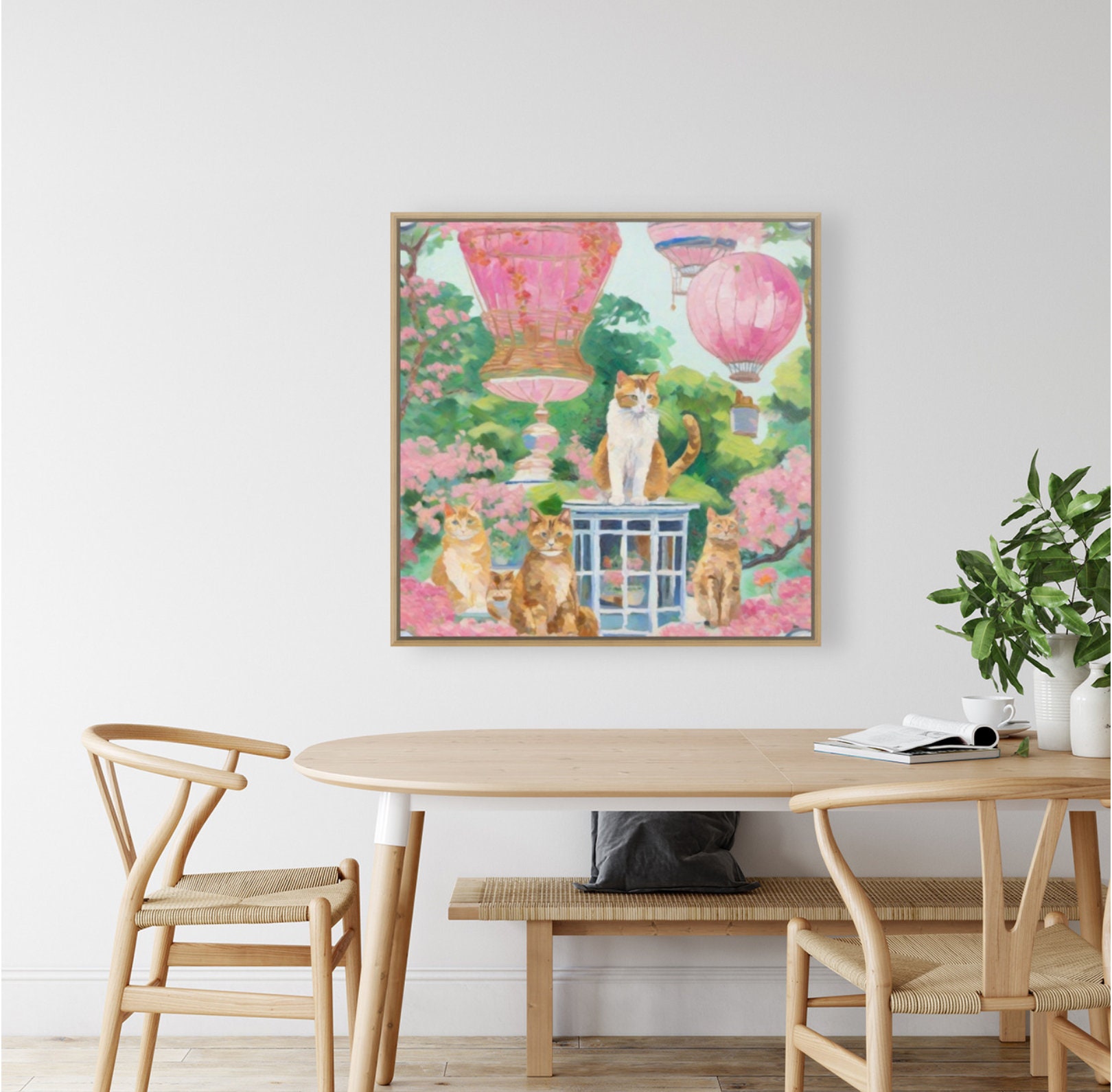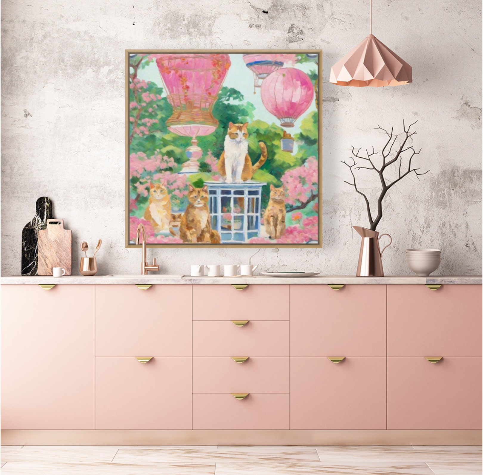 Whimsical Cats Art Print: Pink Hot Air Balloons, Grandmillennial Style