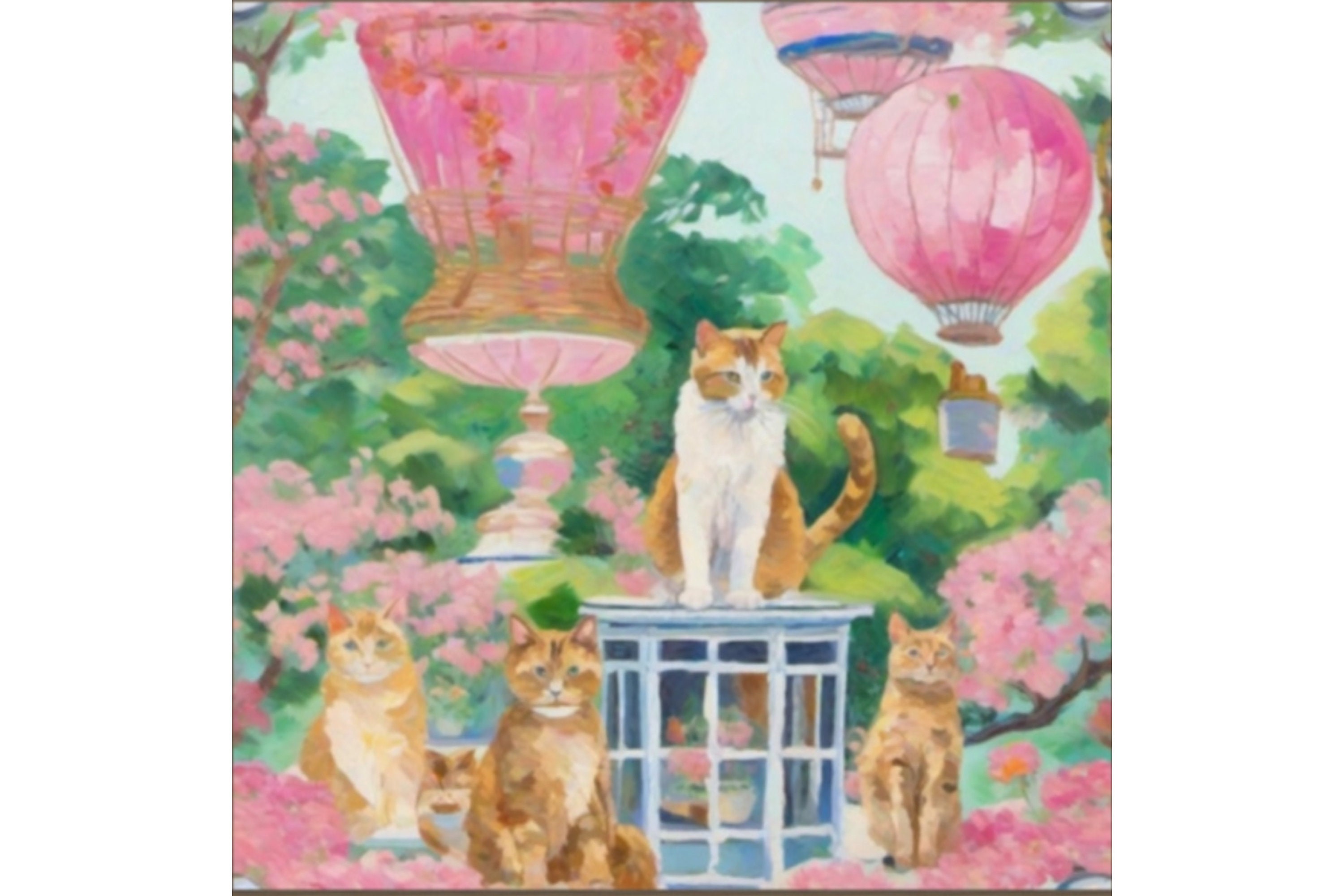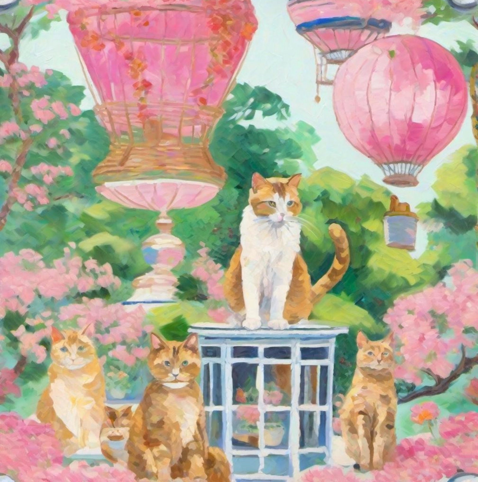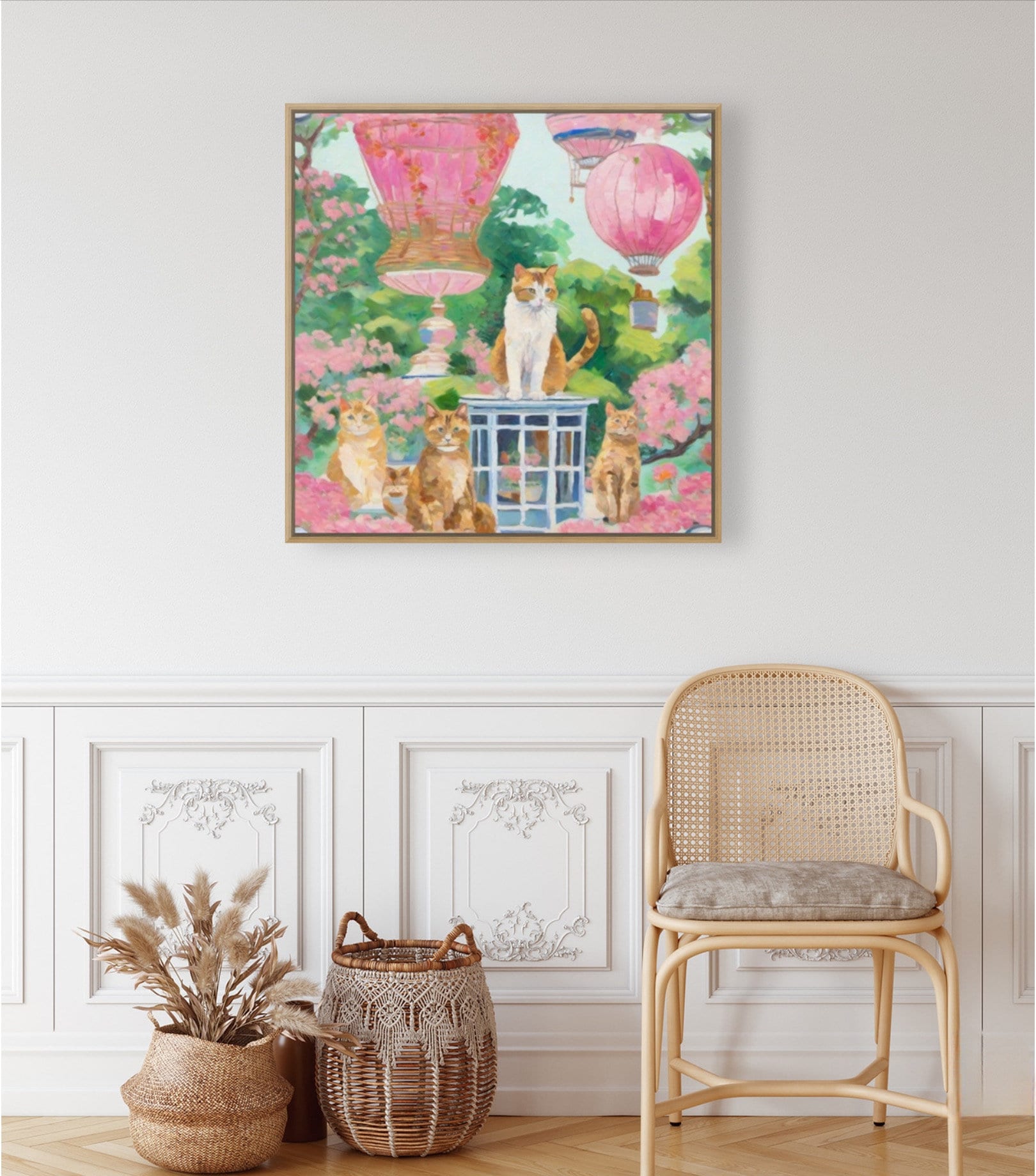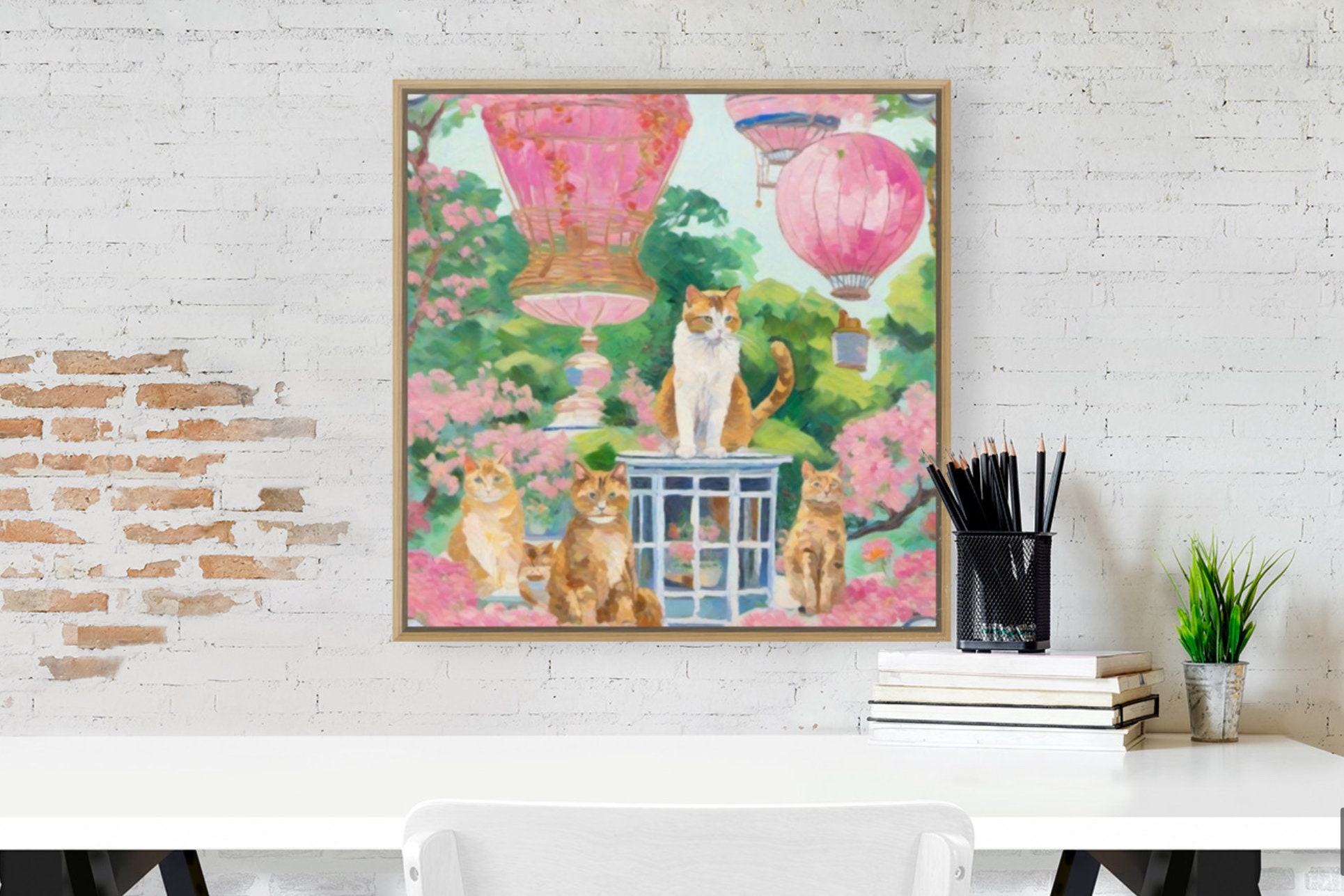 Whimsical Cats Art Print: Pink Hot Air Balloons, Grandmillennial Style