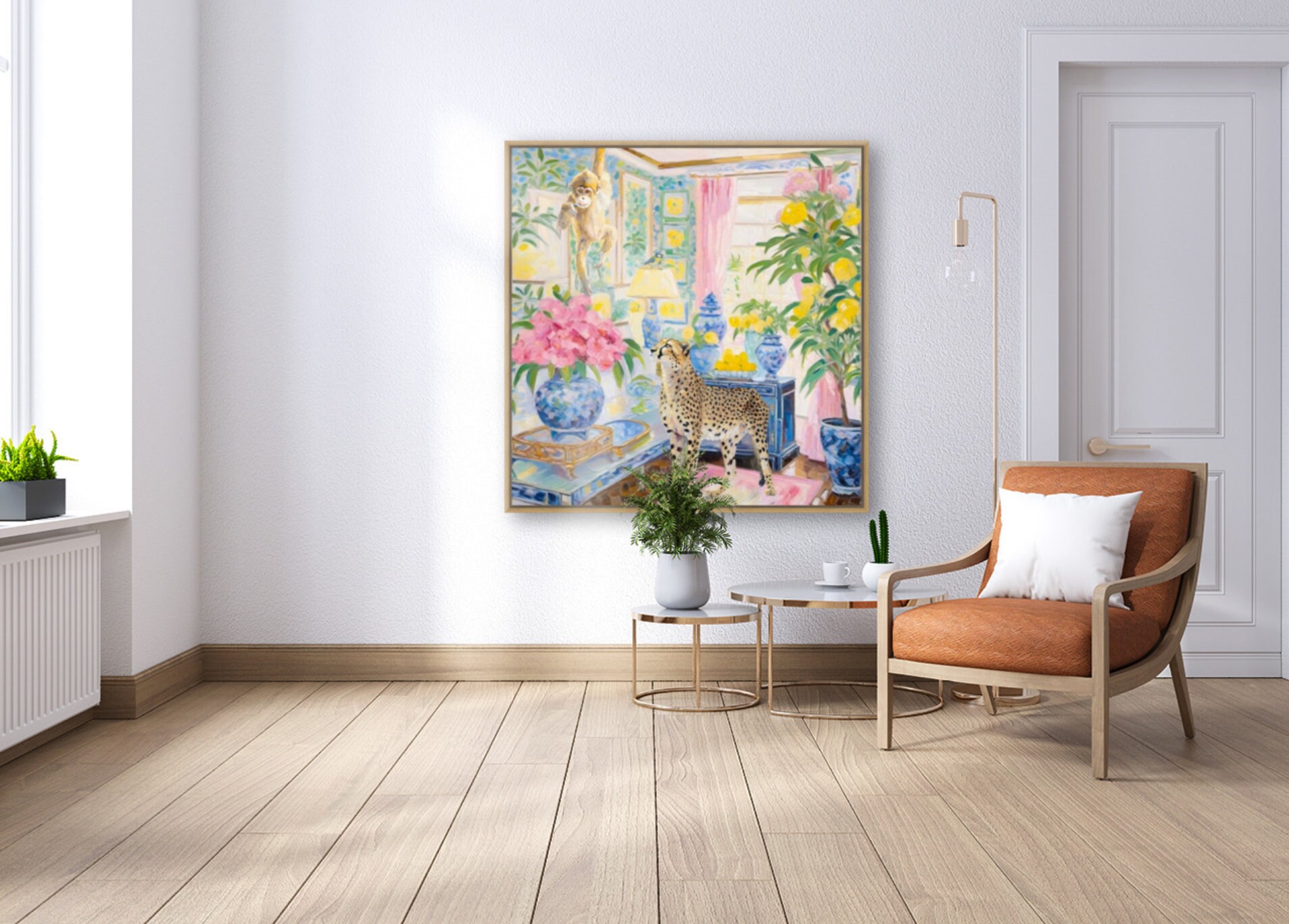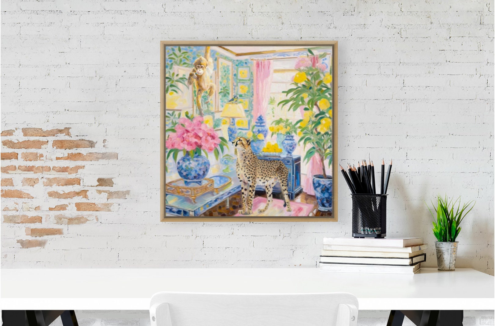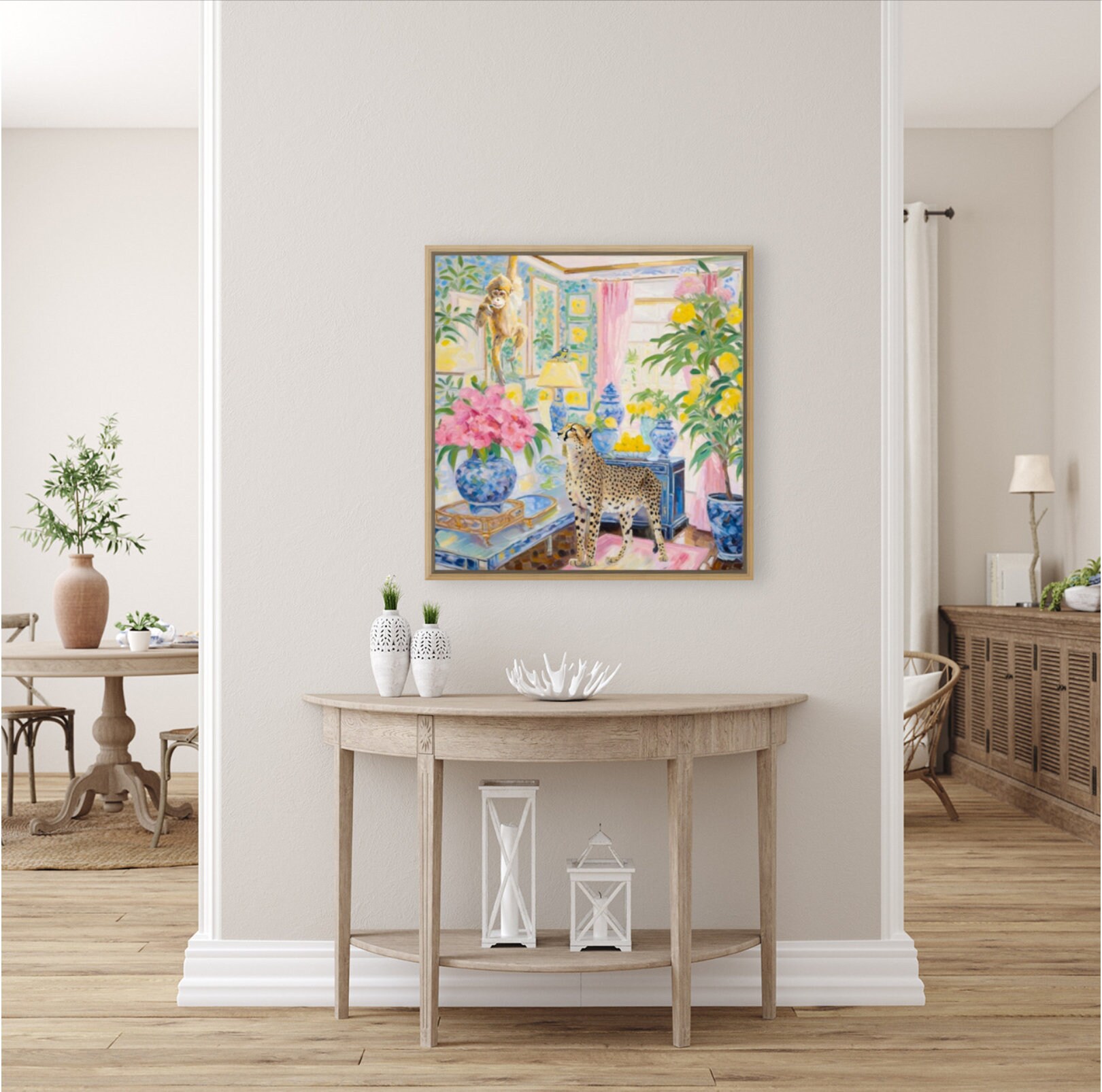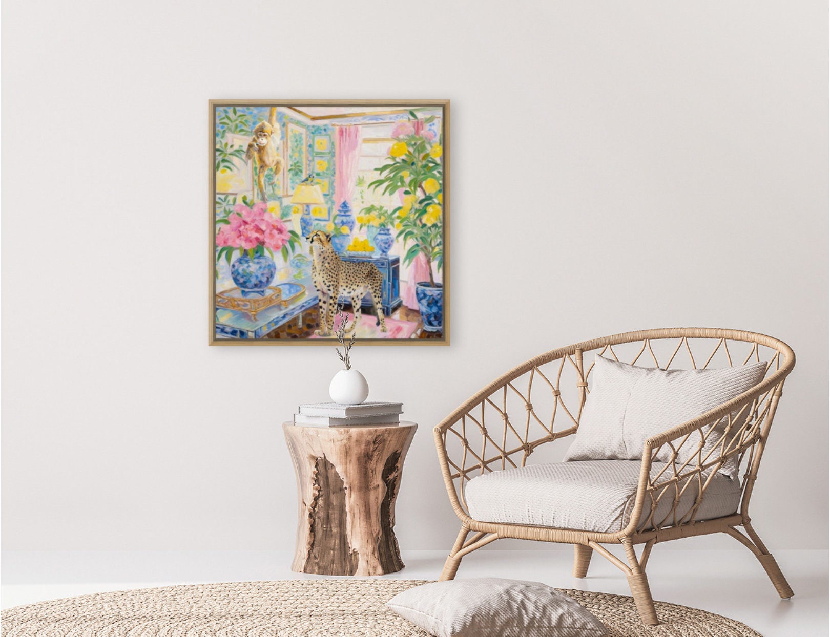 Grandmillennial art, Minding the cheeky monkey, preppy cheetah print