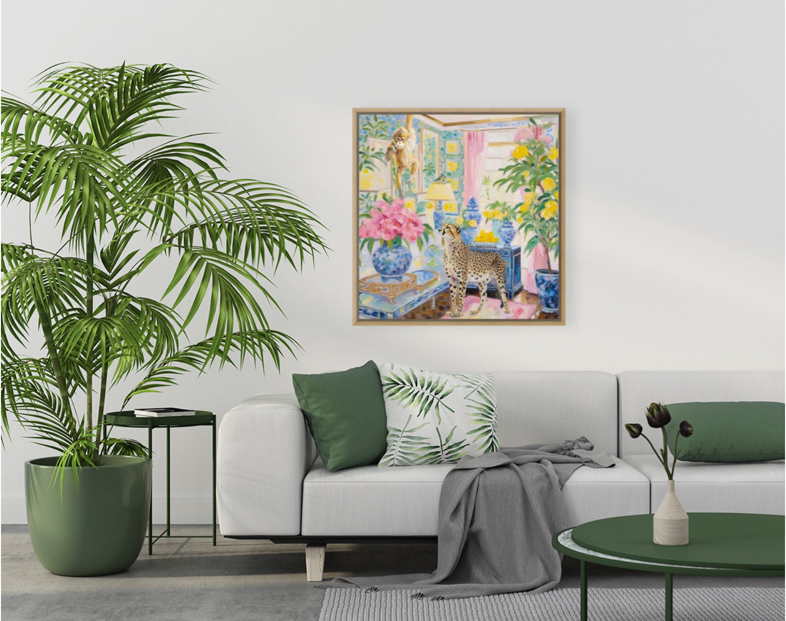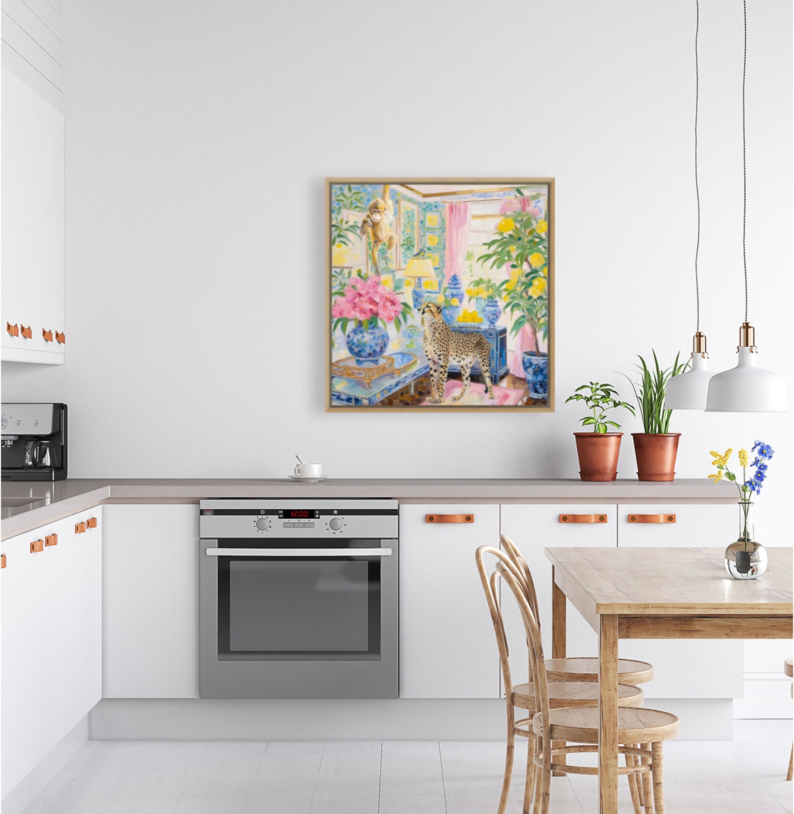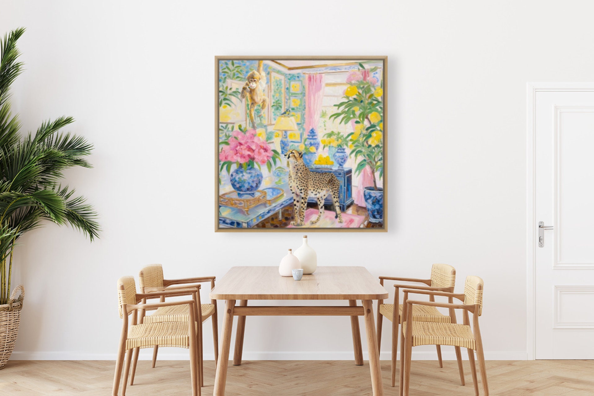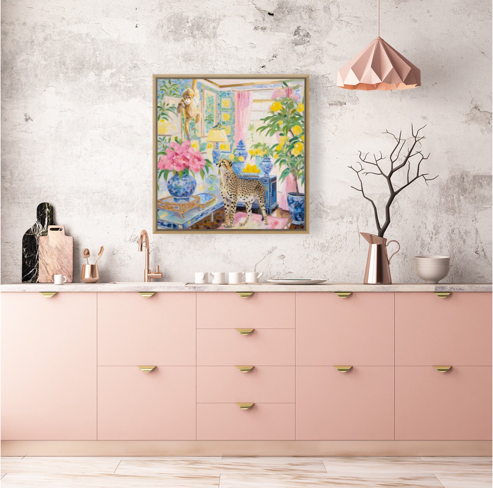 Grandmillennial art, Minding the cheeky monkey, preppy cheetah print