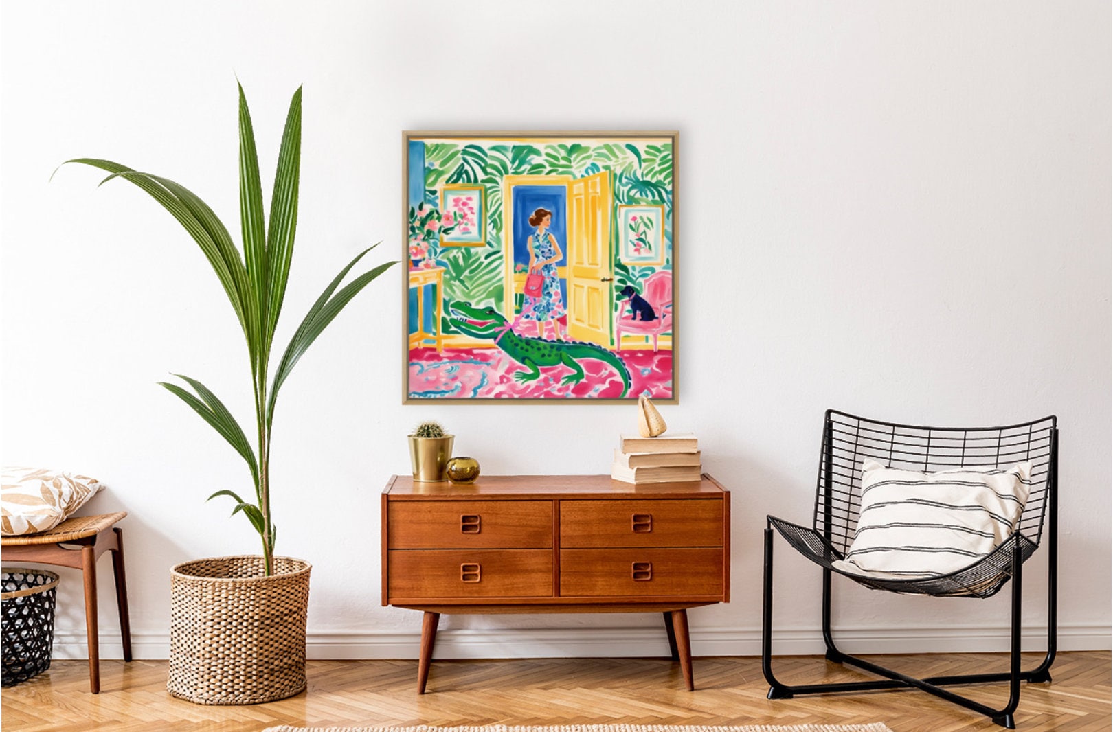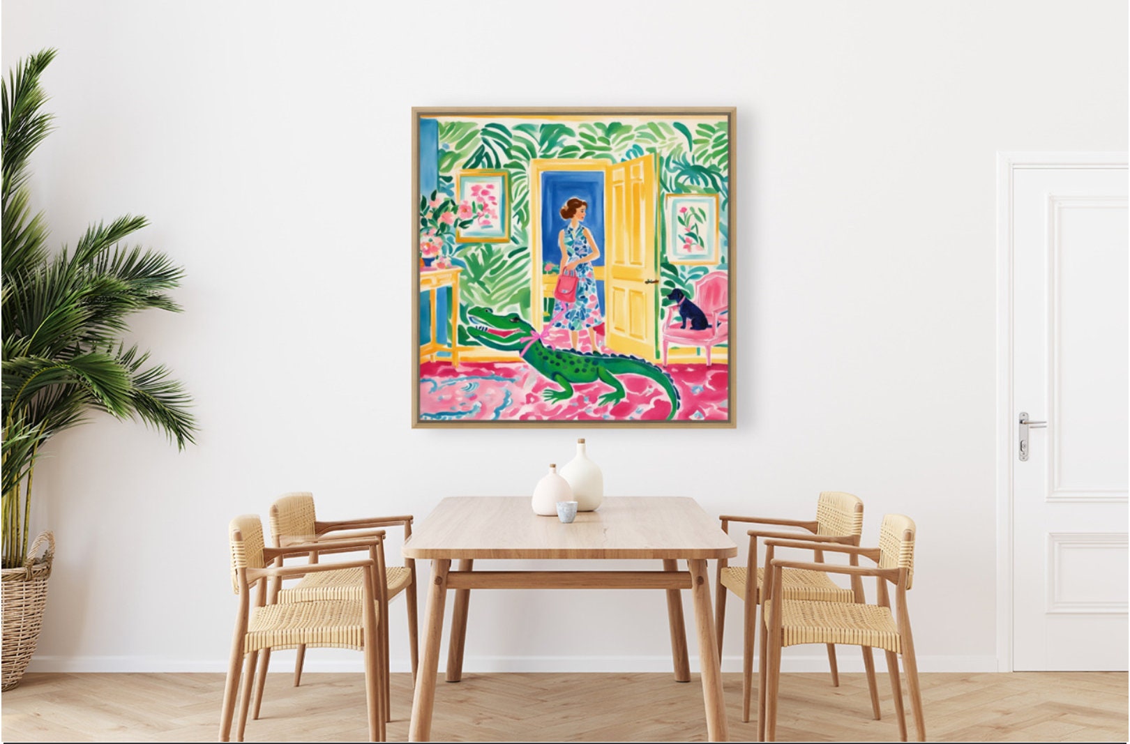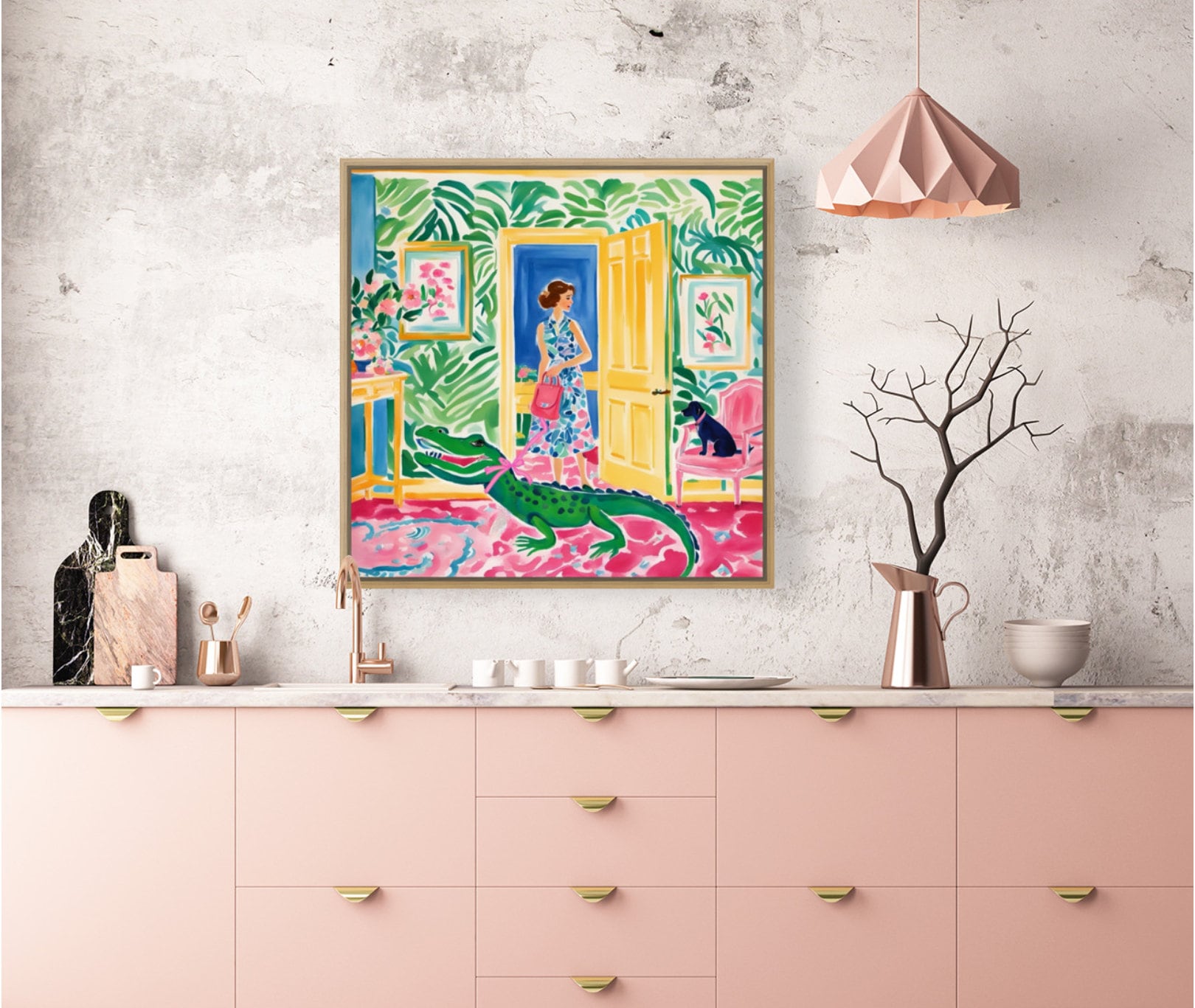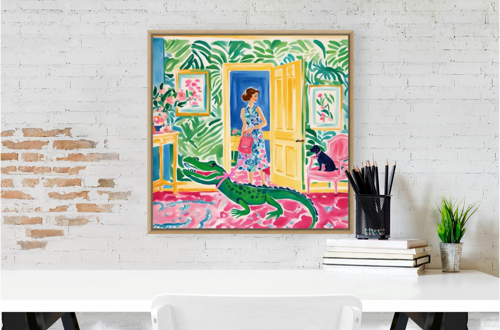 Grandmillennial art, Taking gator for a walk, whimsical fine art print