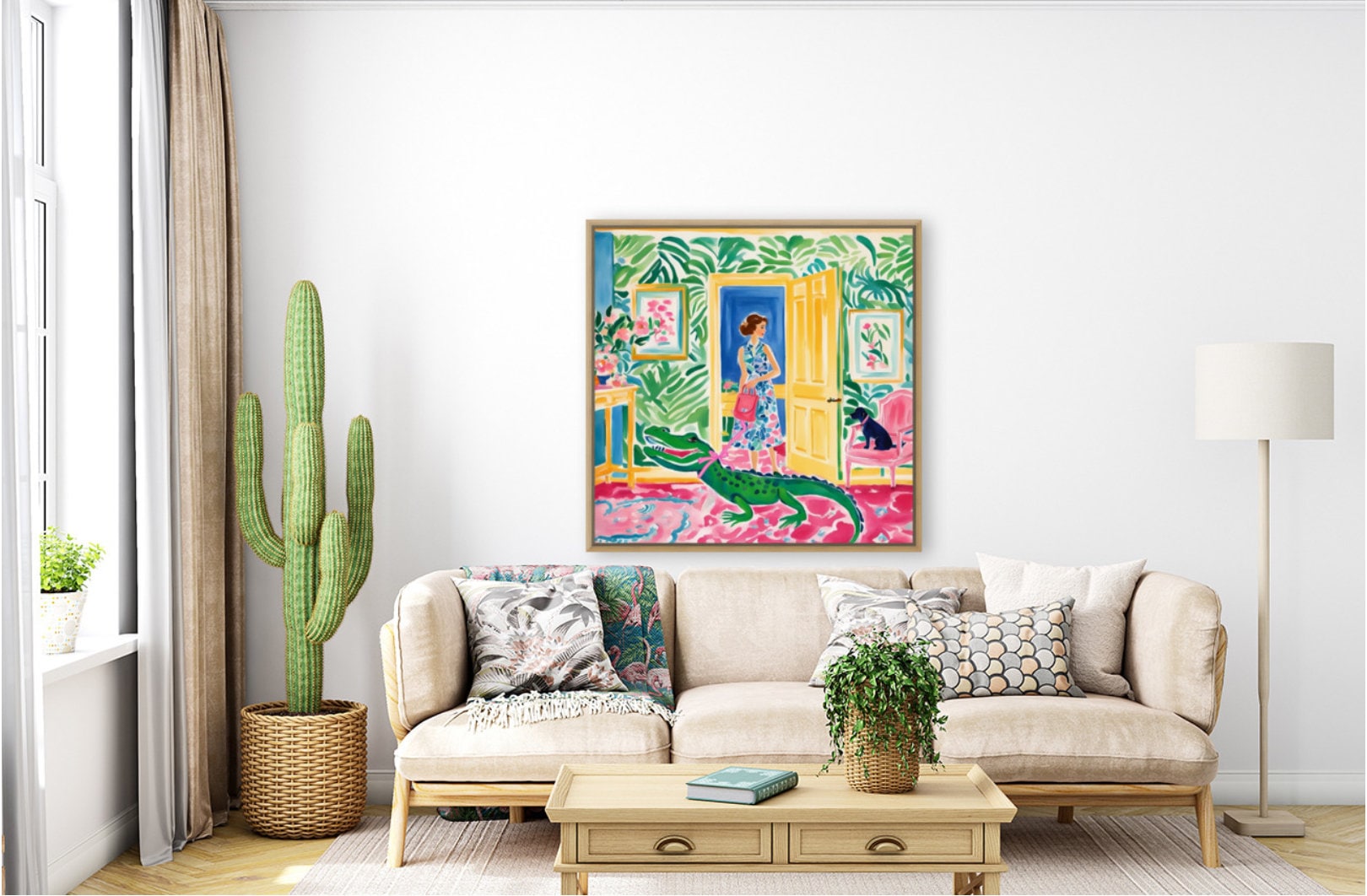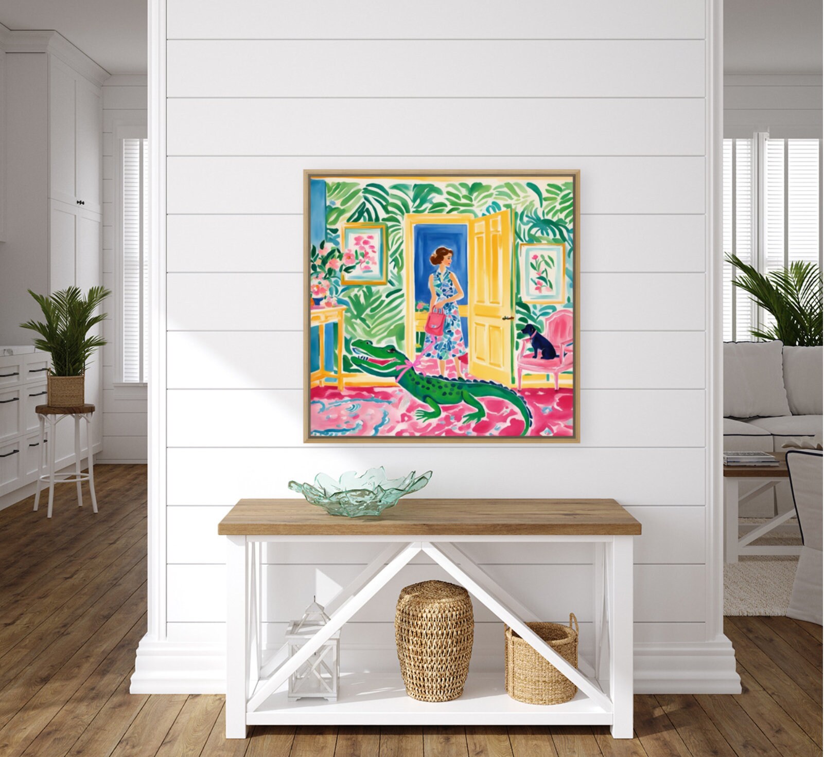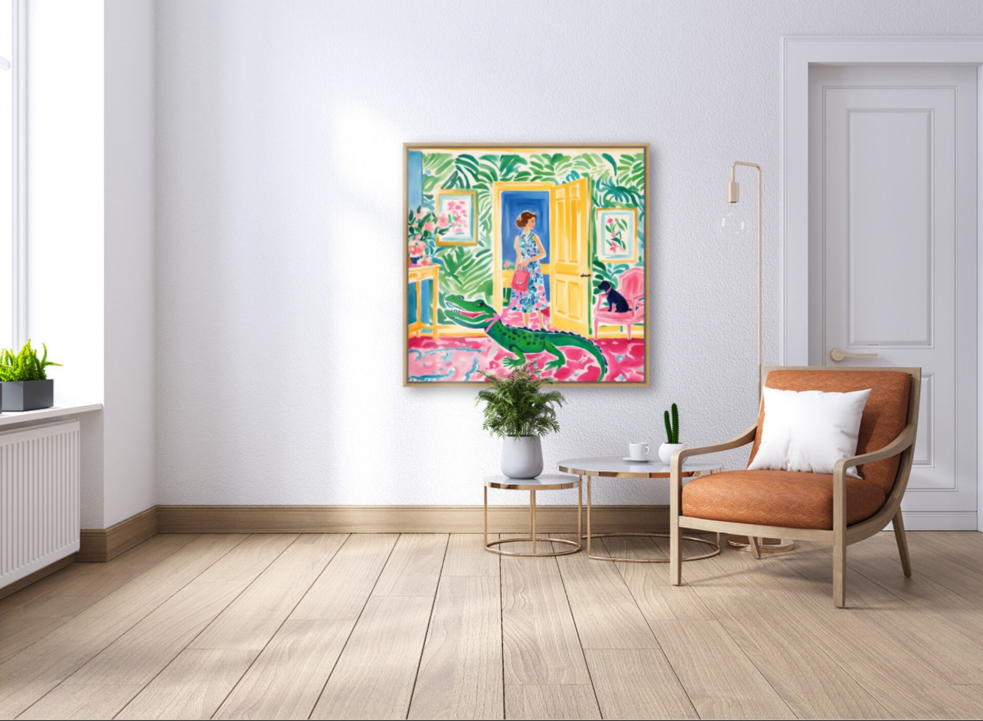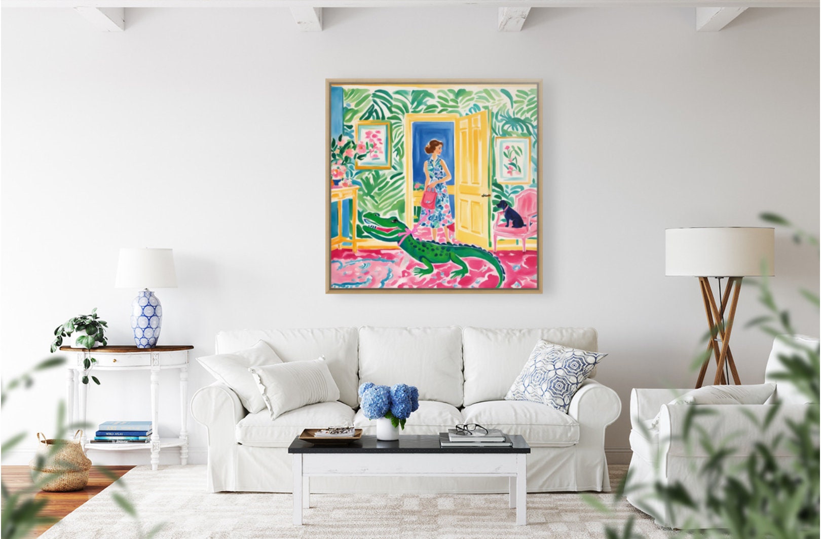 Grandmillennial art, Taking gator for a walk, whimsical fine art print