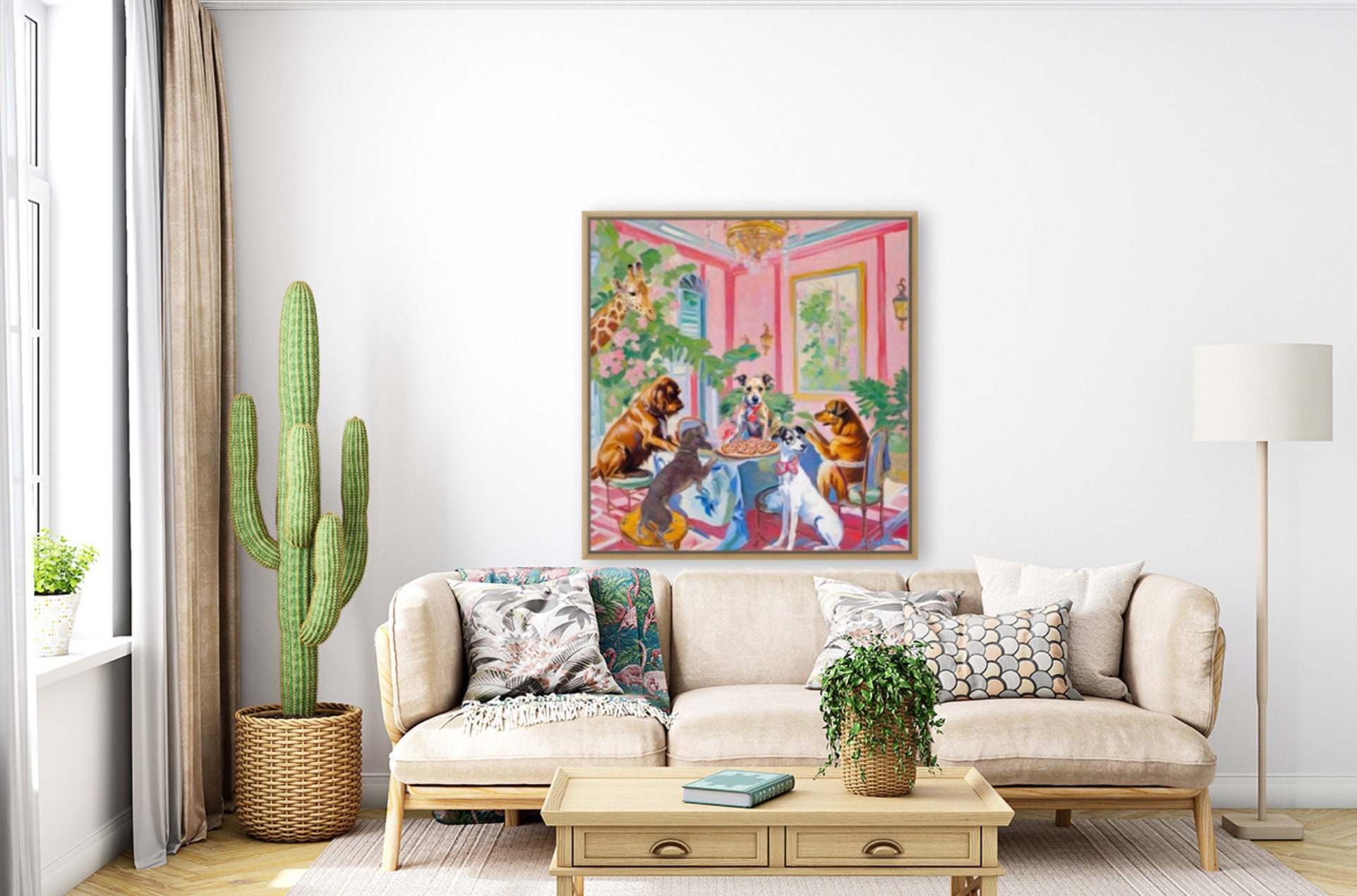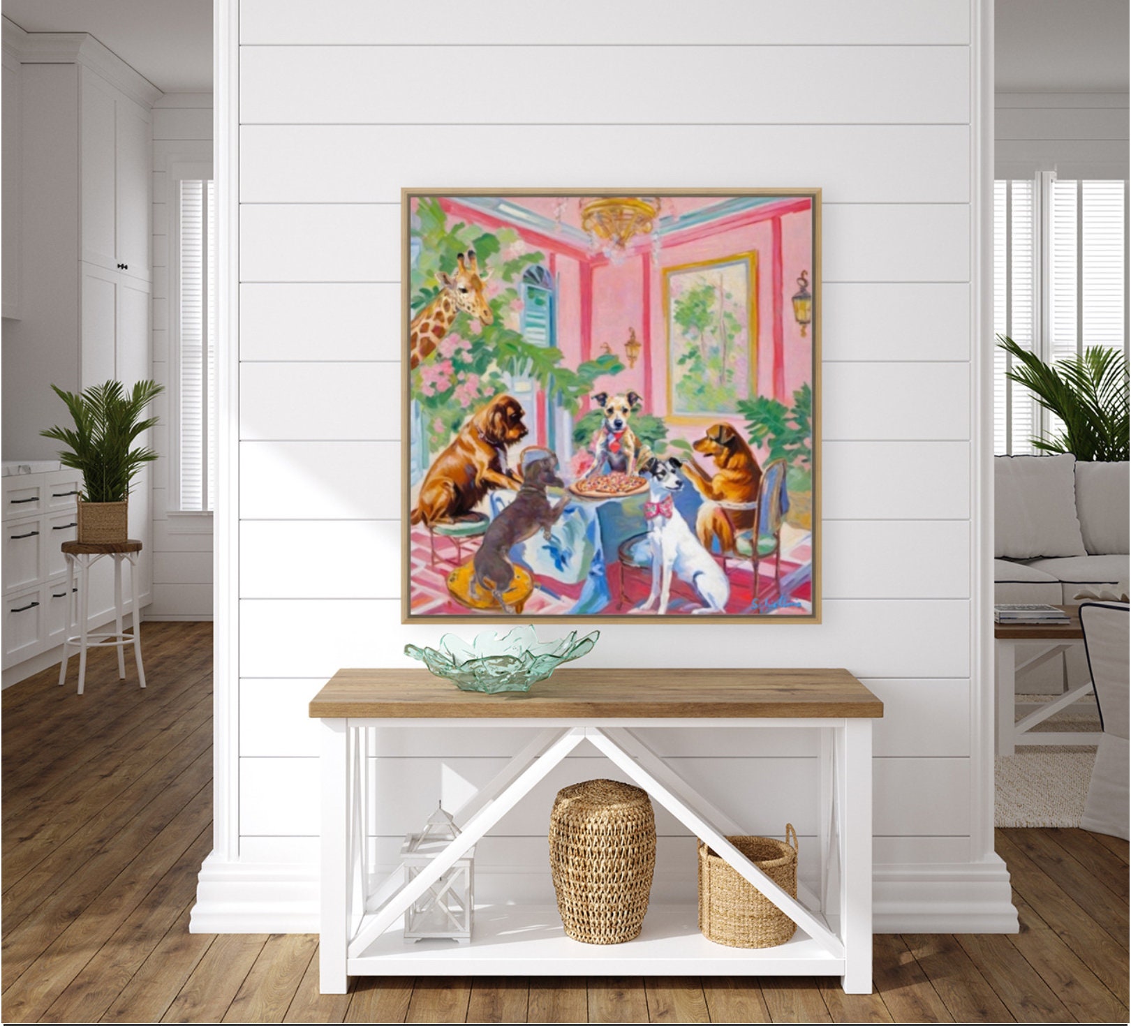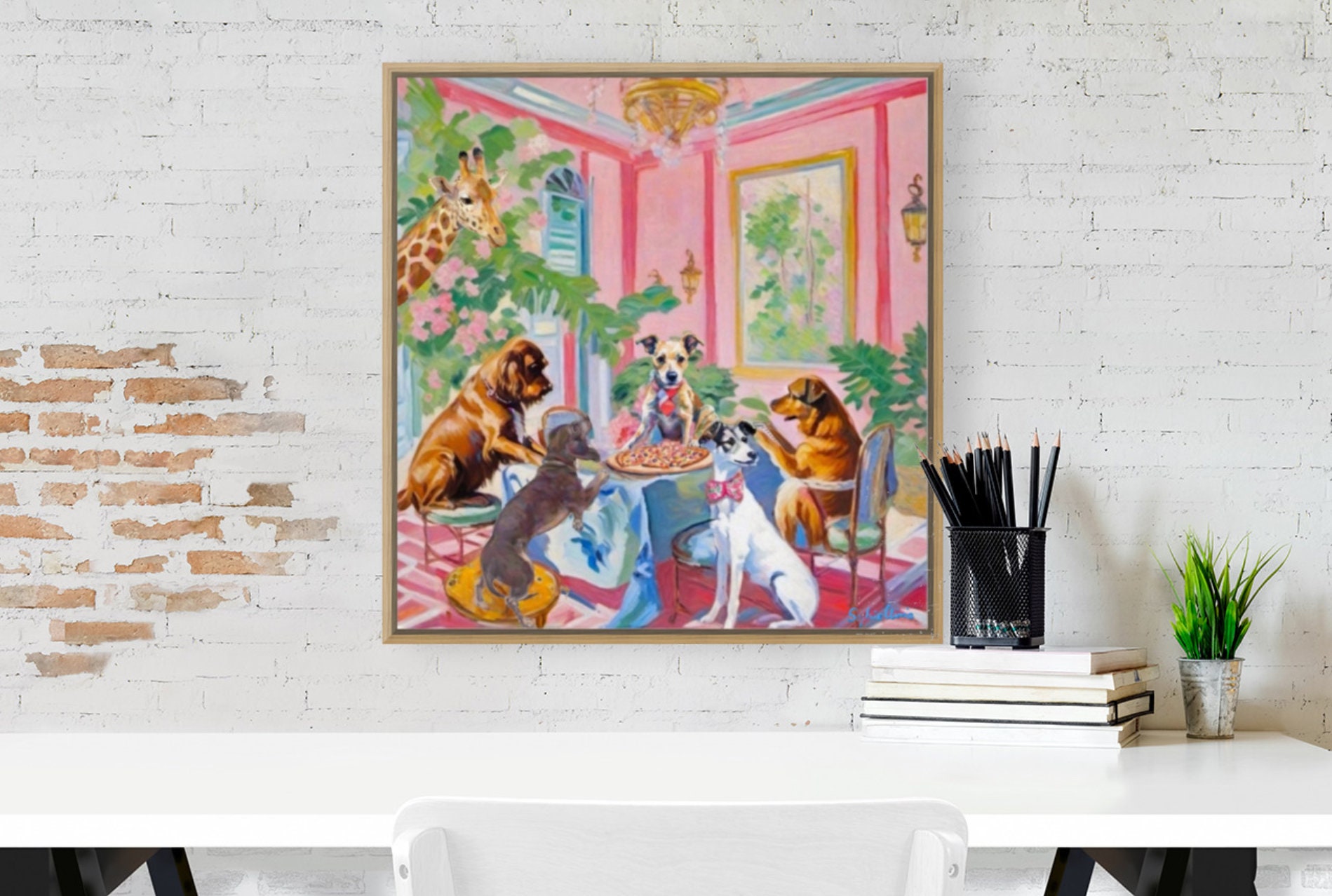 So whimsical and fun! Dogs at a pizza party! Not to mention an unexpected giraffe visitor! Love the surprise! Can't wait to add this to my dog themed gallery! Thank you again for your amazing talent and use of colors! 🥰
