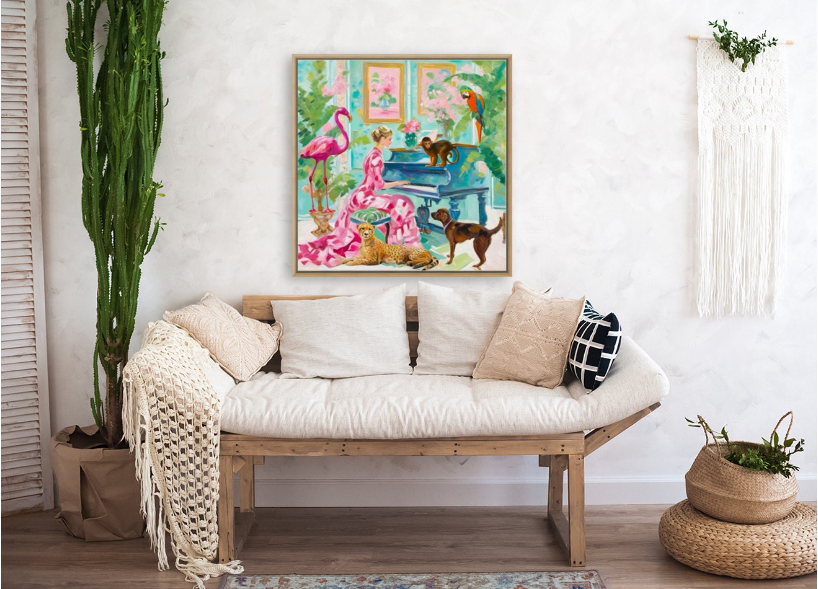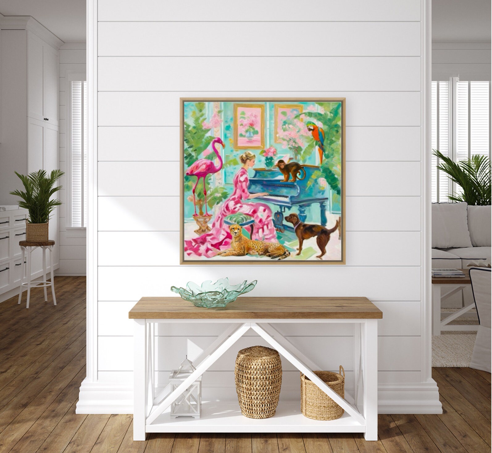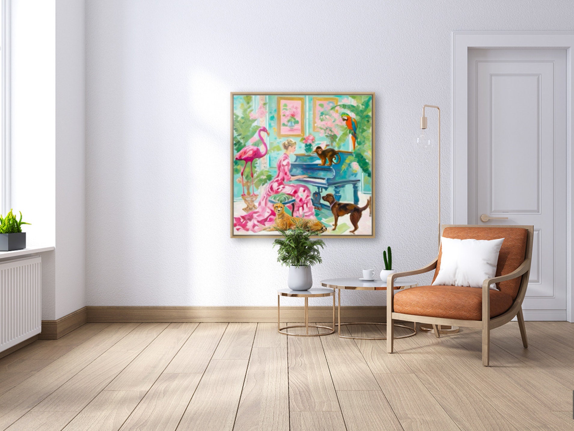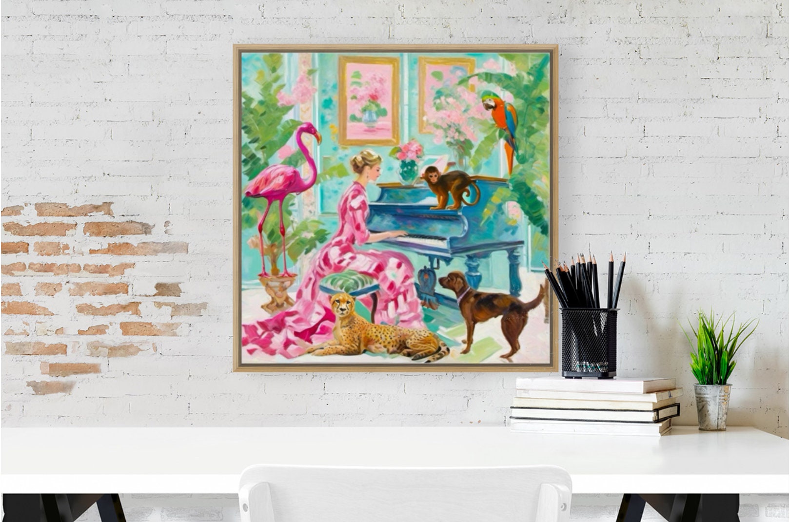Grandmillennial Art Print: Whimsical Animals, Woman at Piano