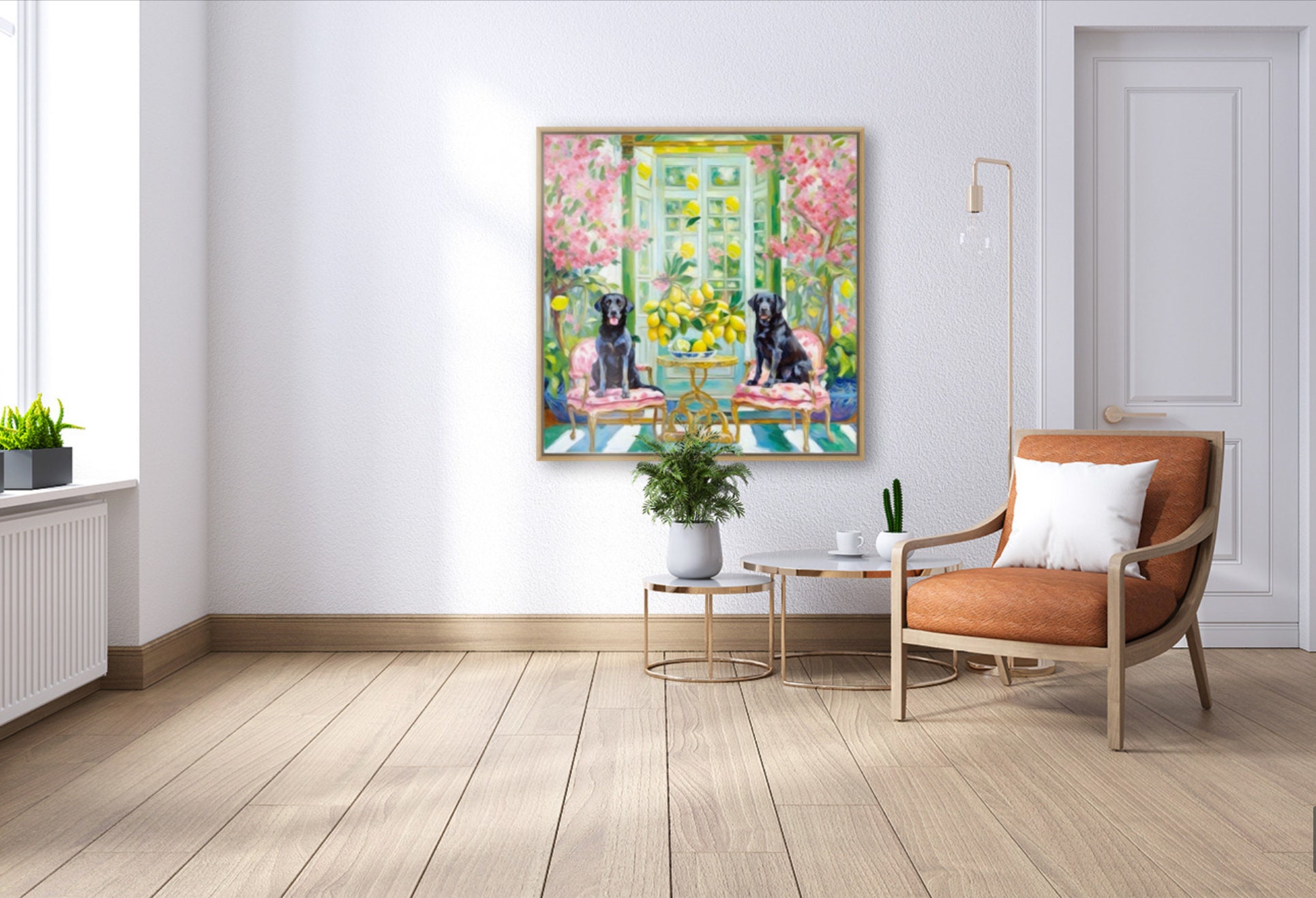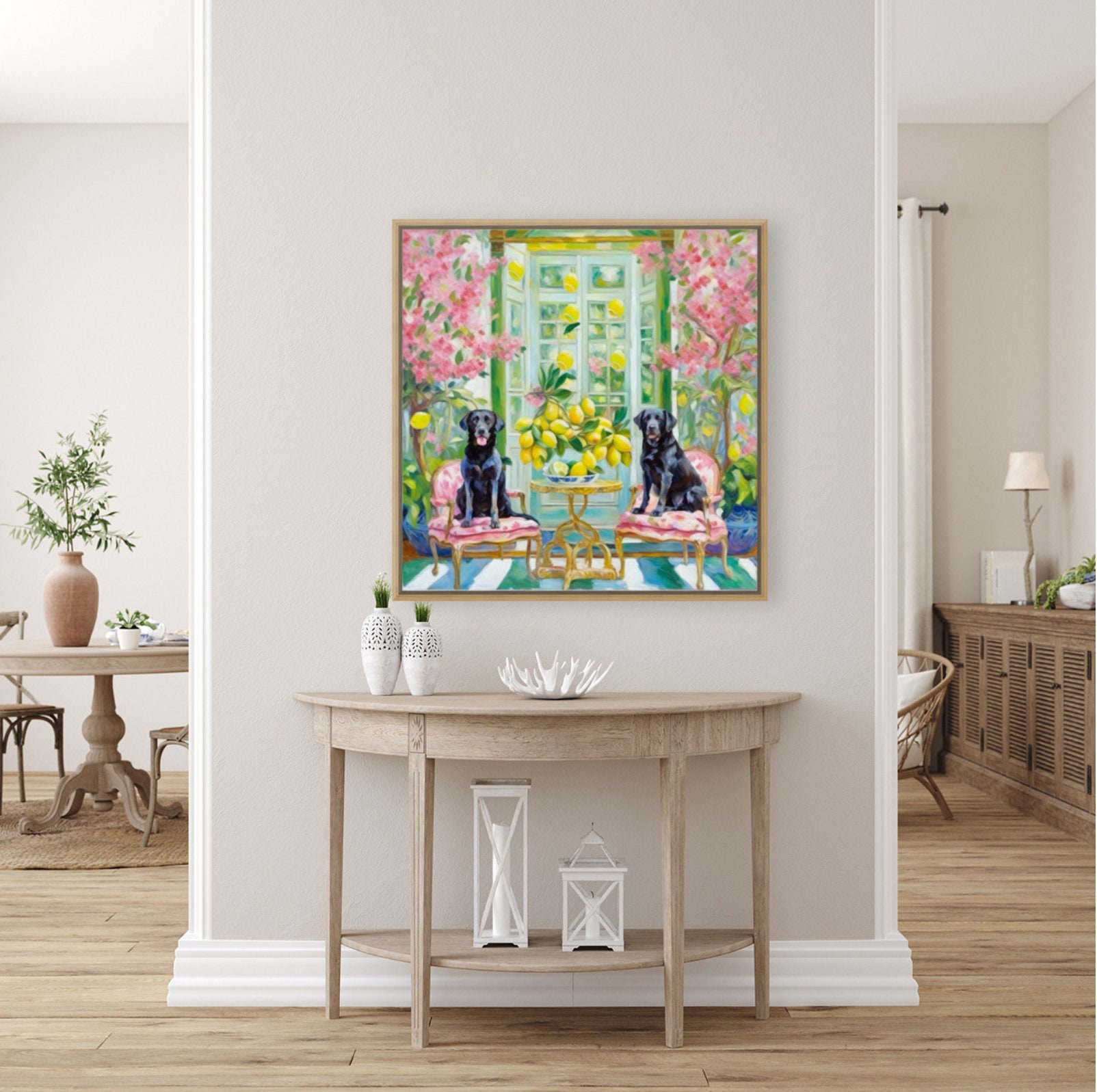 Grandmillennial art, Black Labradors in interior with lemons, whimsical fine art