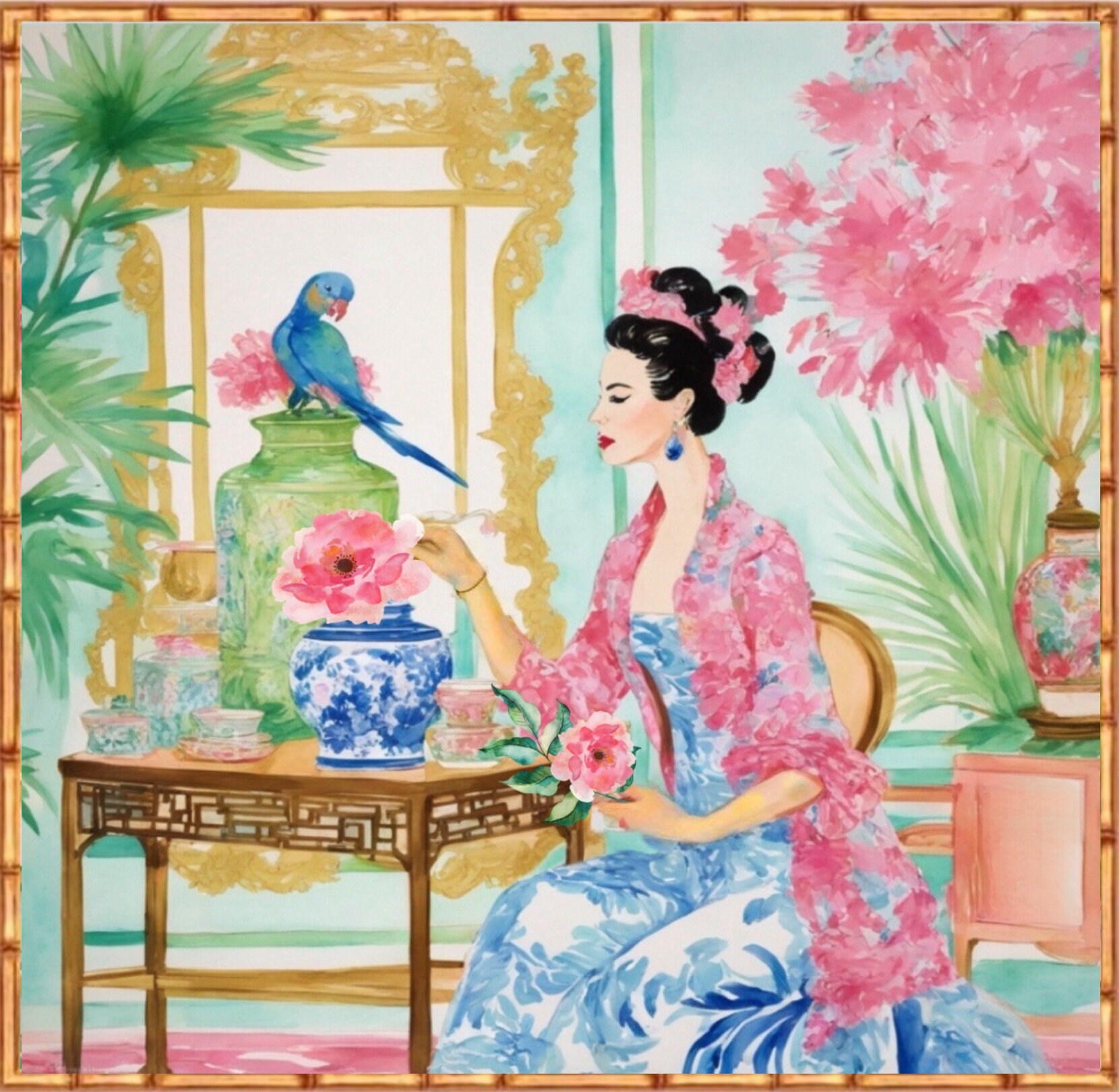 PLEASE NOTE SIZES ARE IN CM. Limited edition Giclee art print of original watercolor by Sophie Clima. Sophie created a series of chinoiserie watercolors for an interior designer. There are more than seventy prints in the series. Giclee on 309 gsm fine art paper.  Unframed. Ships in a tube. Each print is signed and dated by Sophie. These watercolor chinoiserie prints will enhance your Grandmillennial Style, Chinoiserie Chic Style, Grandmillennial Decor, or Preppy Chic Style Decor. Will look great on Office walls as well.
