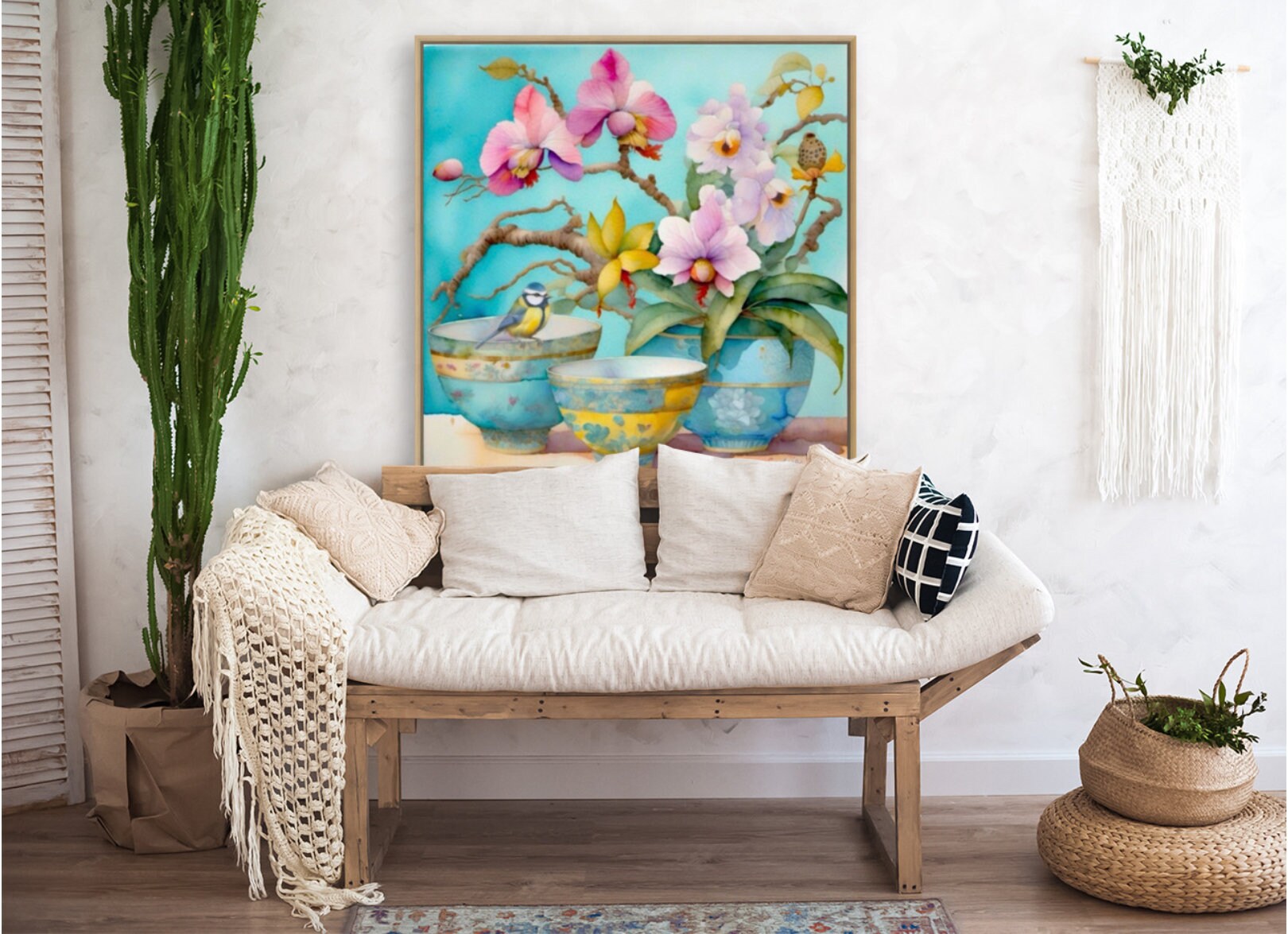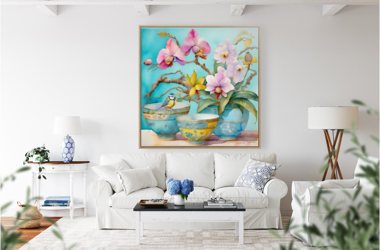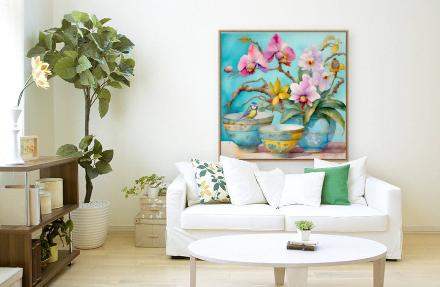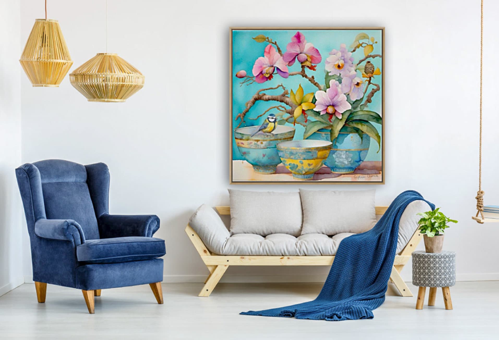Ginger jar watercolor with orchid flowers original painting, 1mx1m