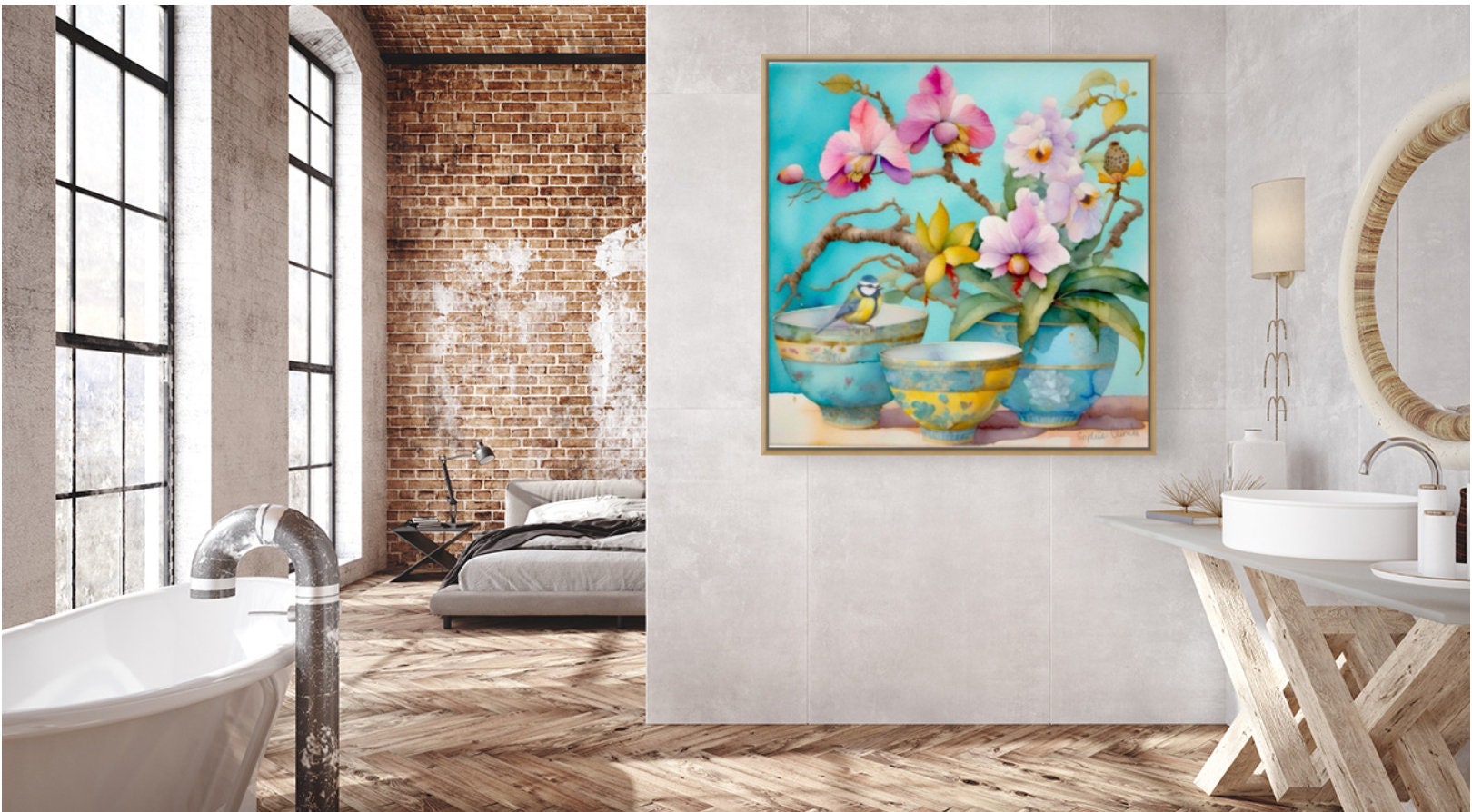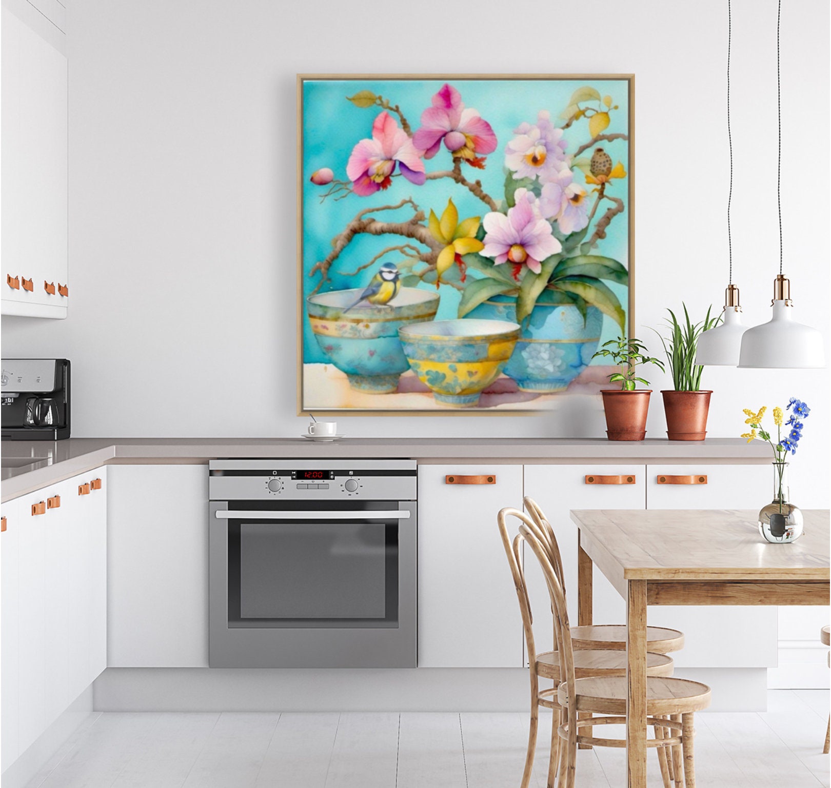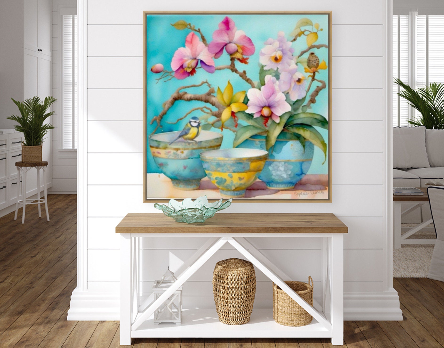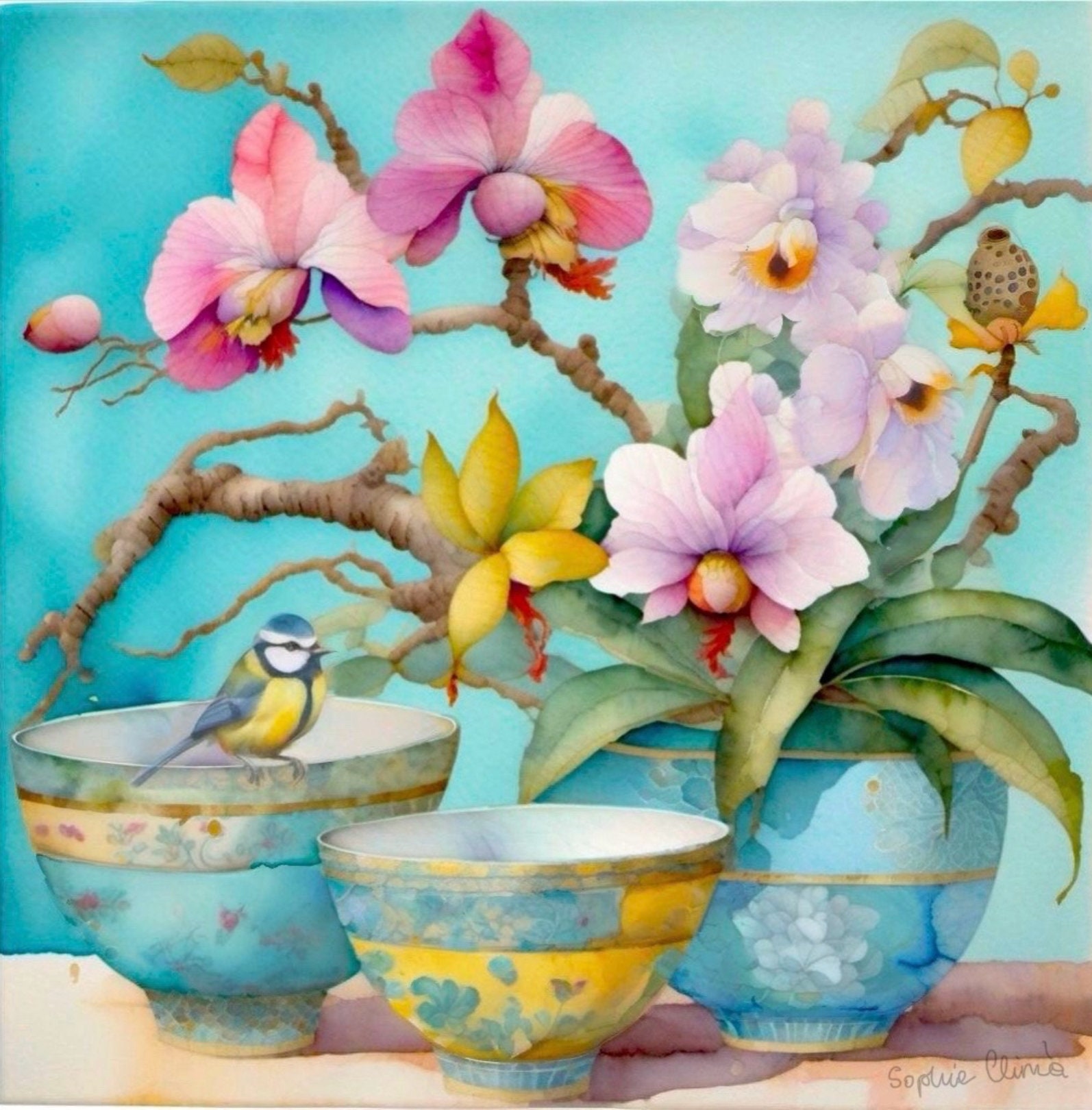 Ginger jar watercolor with orchid flowers original painting, 1mx1m