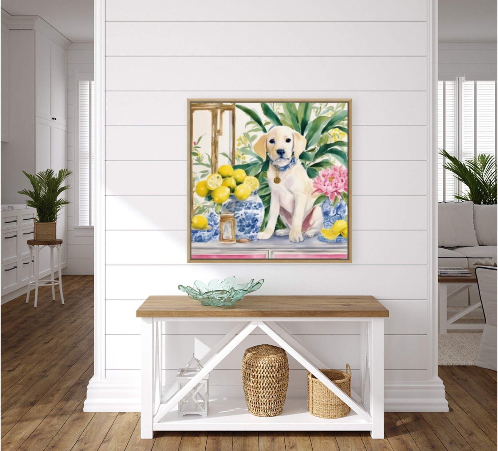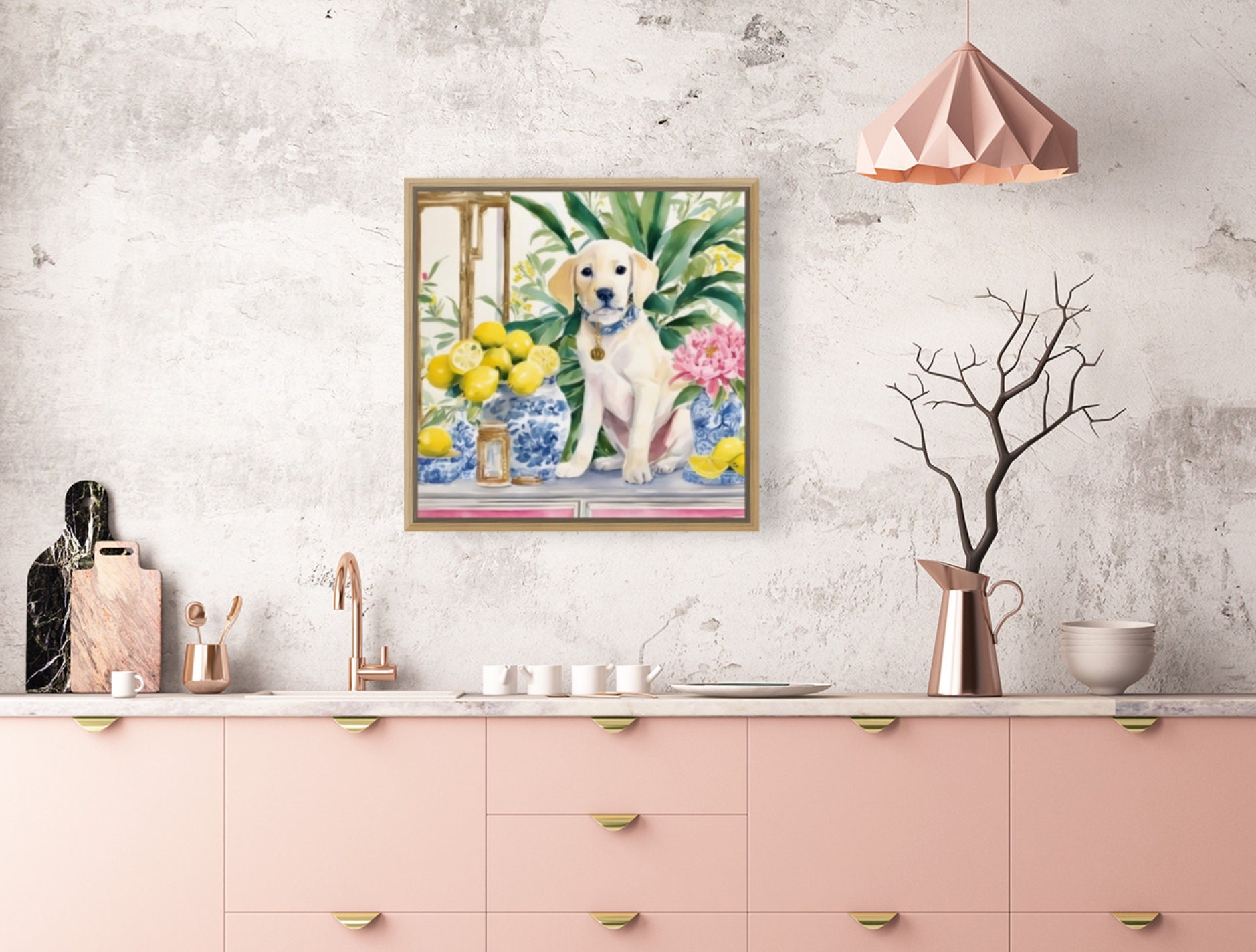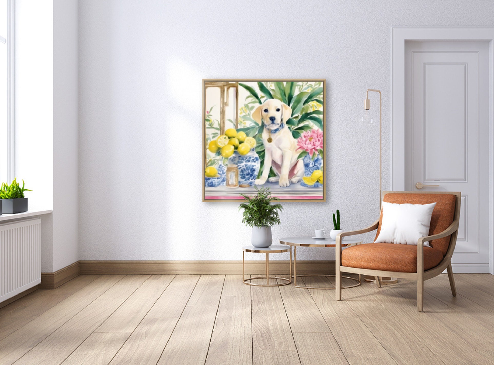 Grandmillennial art,Blonde Labrador puppy with lemons and ginger jars, whimsical fine art