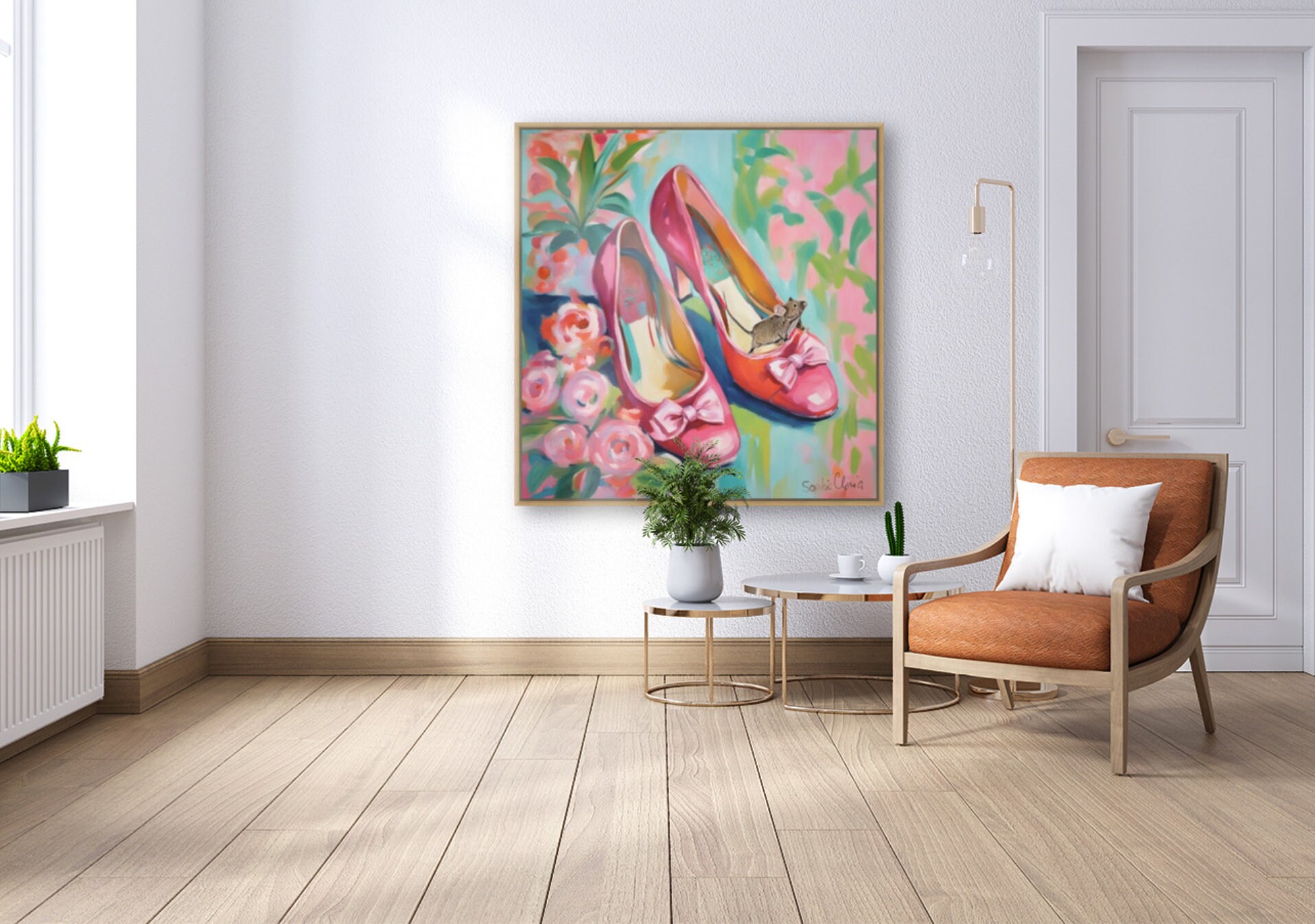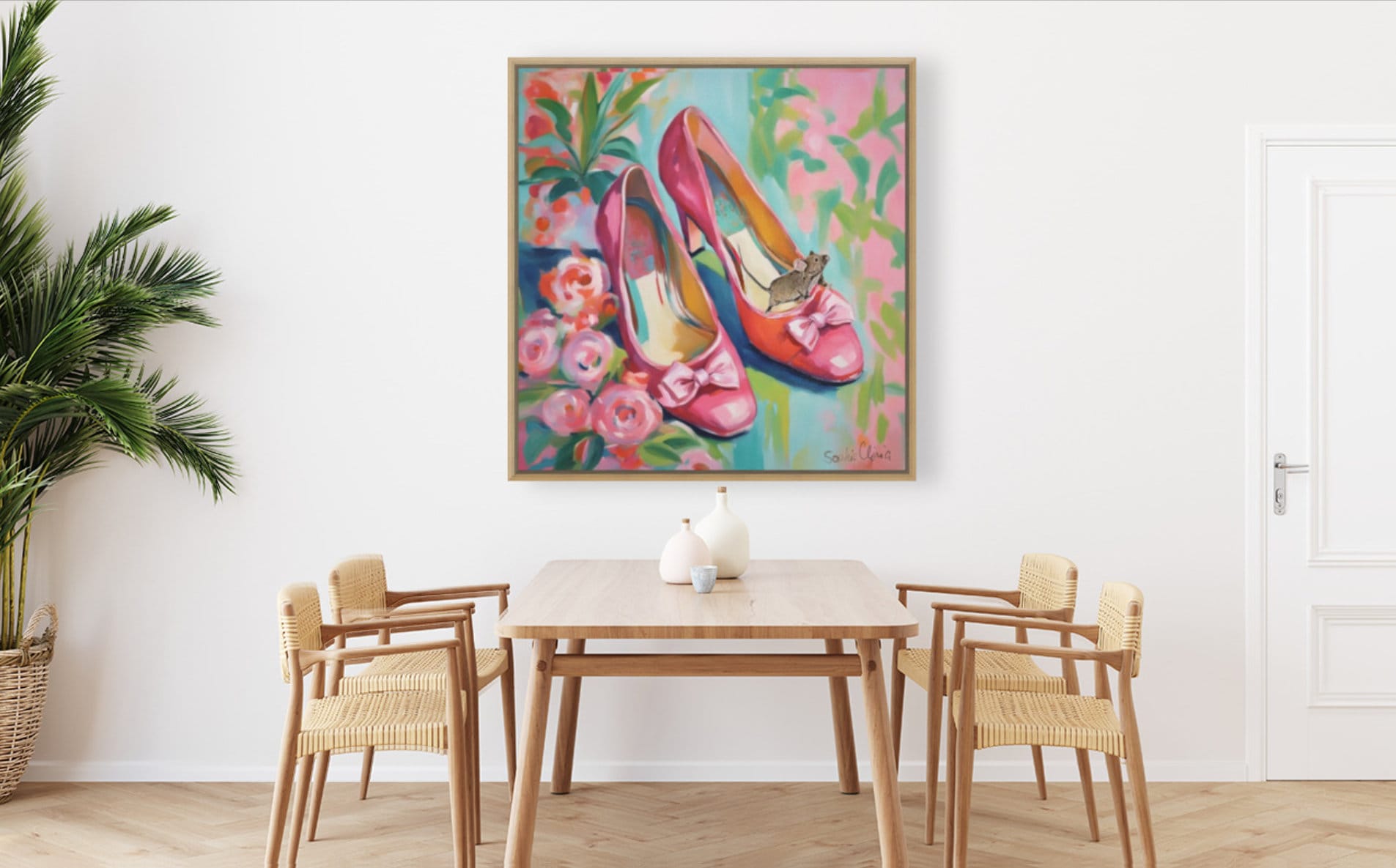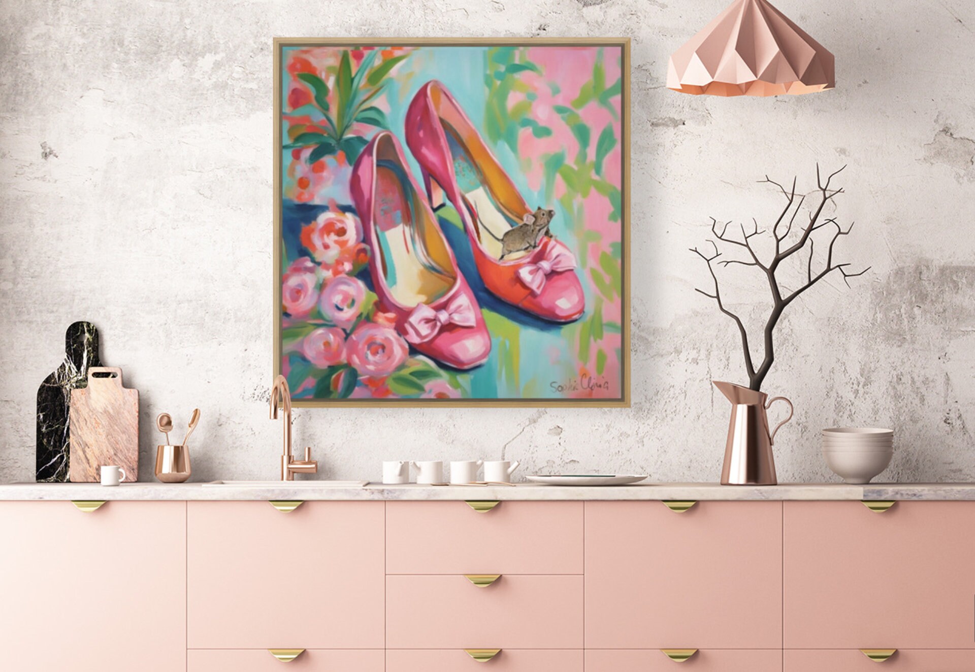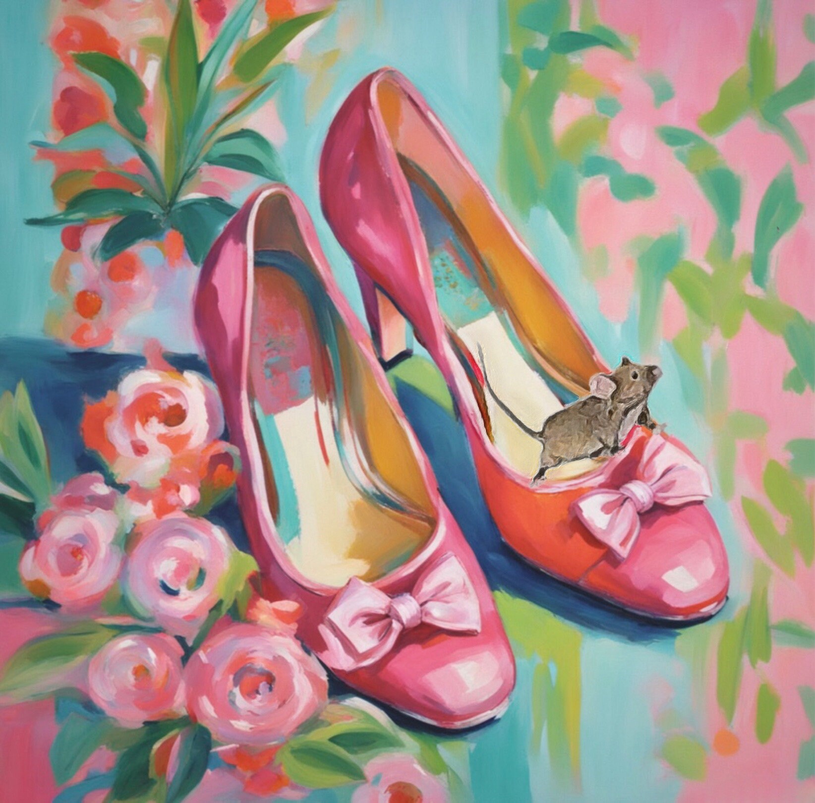 Grandmillennial art, pink shoes and roses, whimsical fine art
