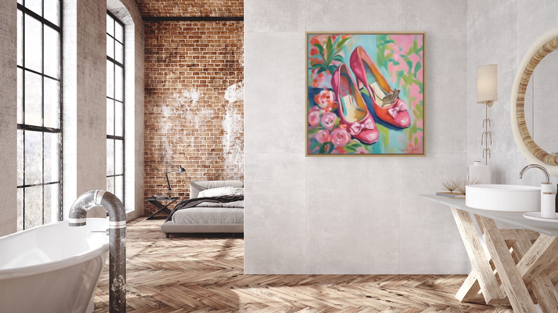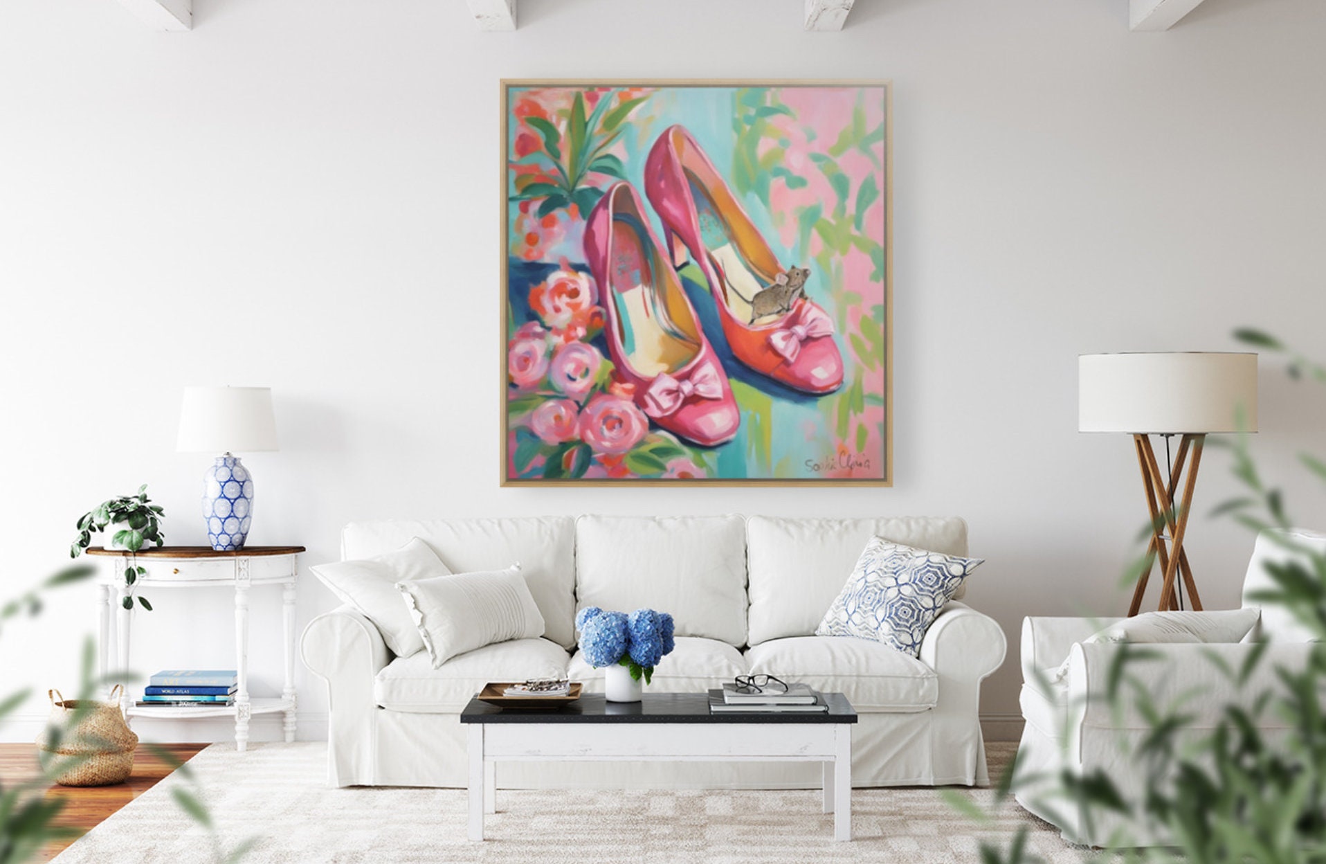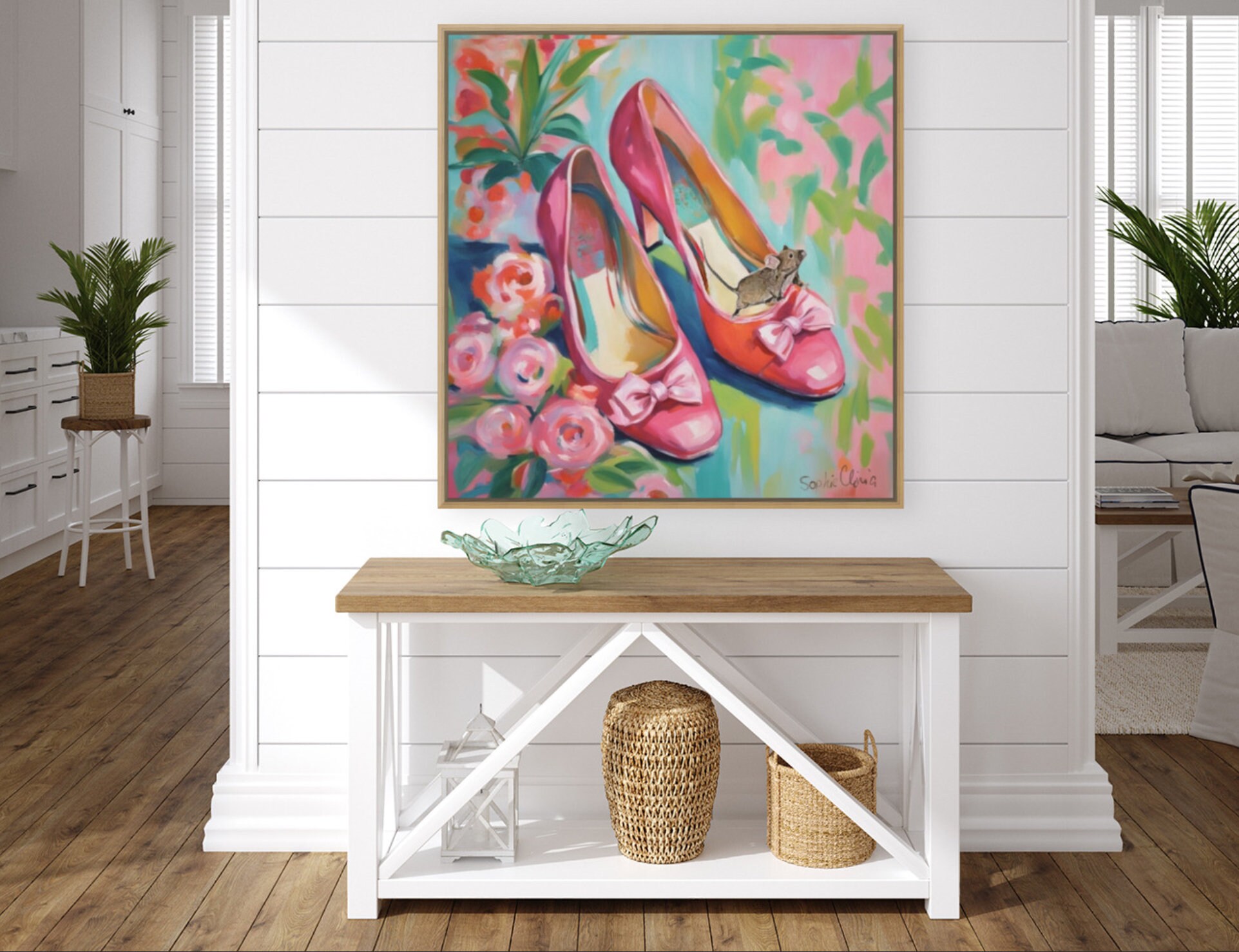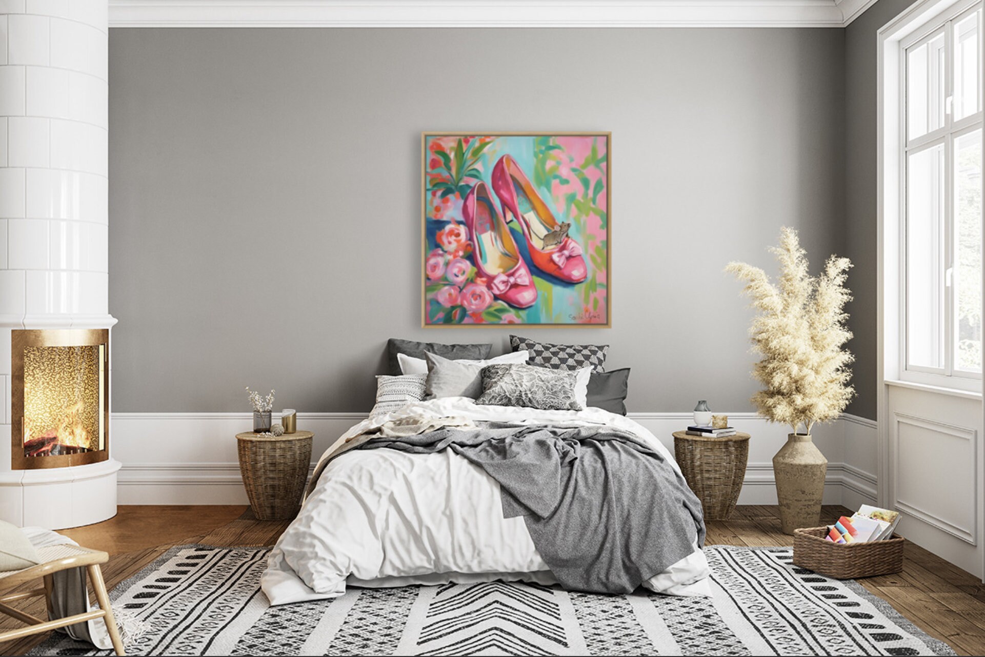 Grandmillennial art, pink shoes and roses, whimsical fine art