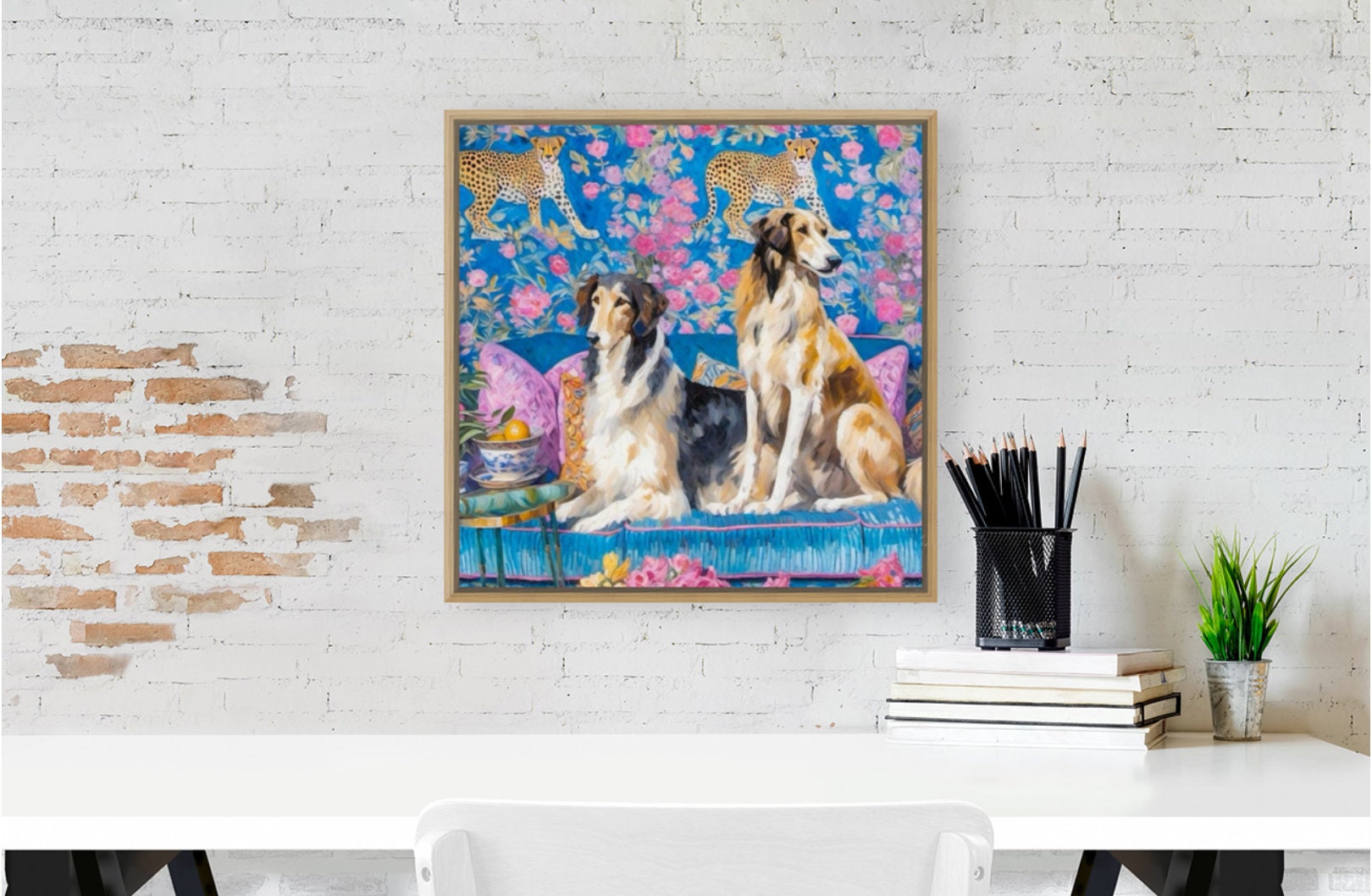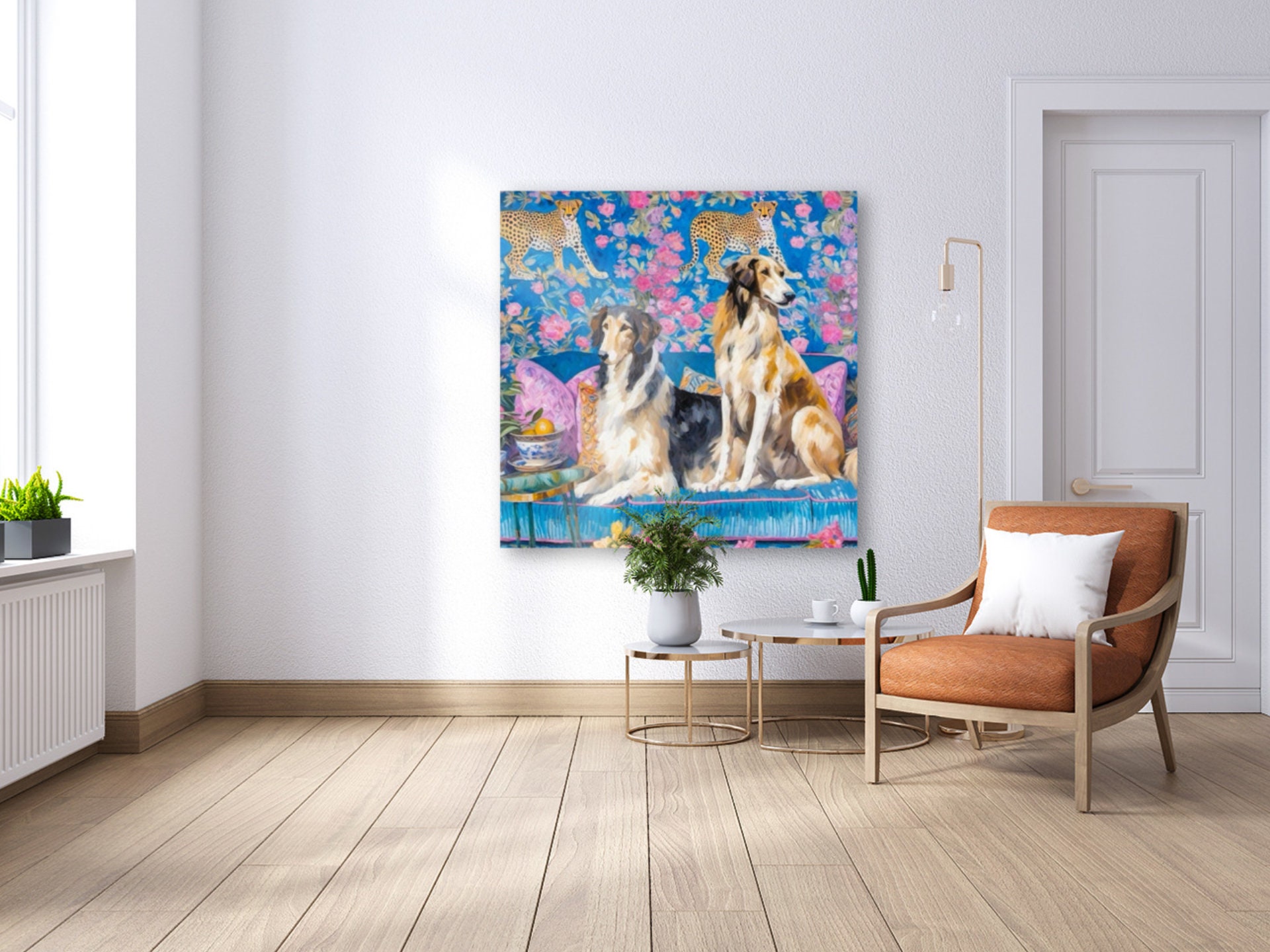Grandmillennial art, Borzoi dogs in blue and pink interior, whimsical fine art