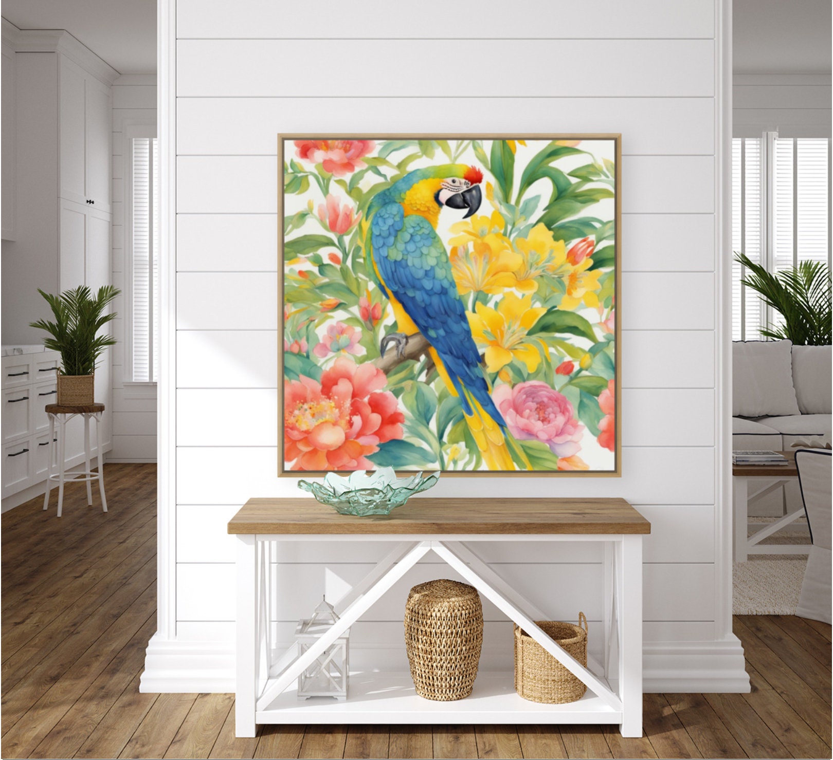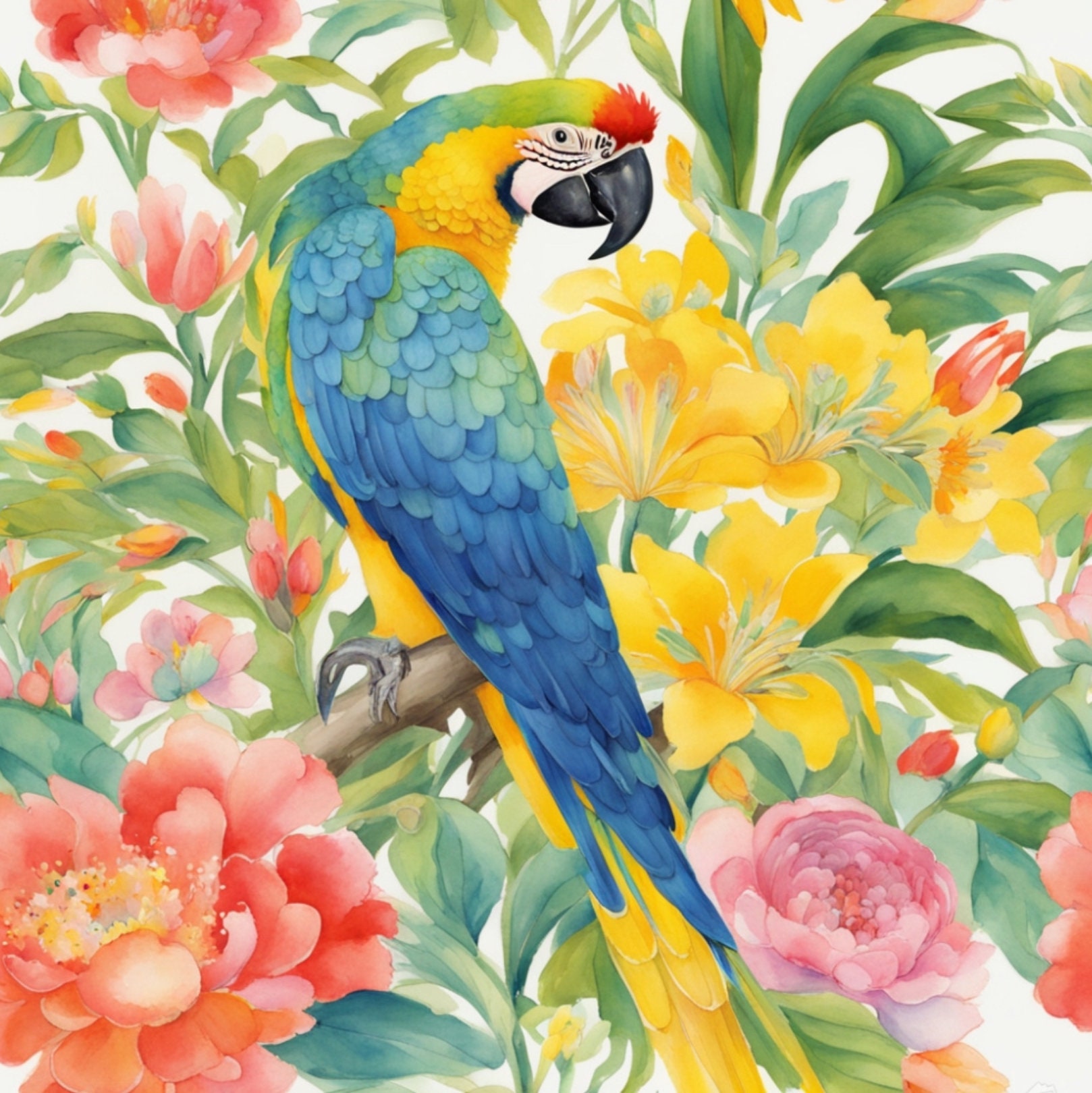 Still life with macaw and flowers, grandmillennial art, watercolor painting