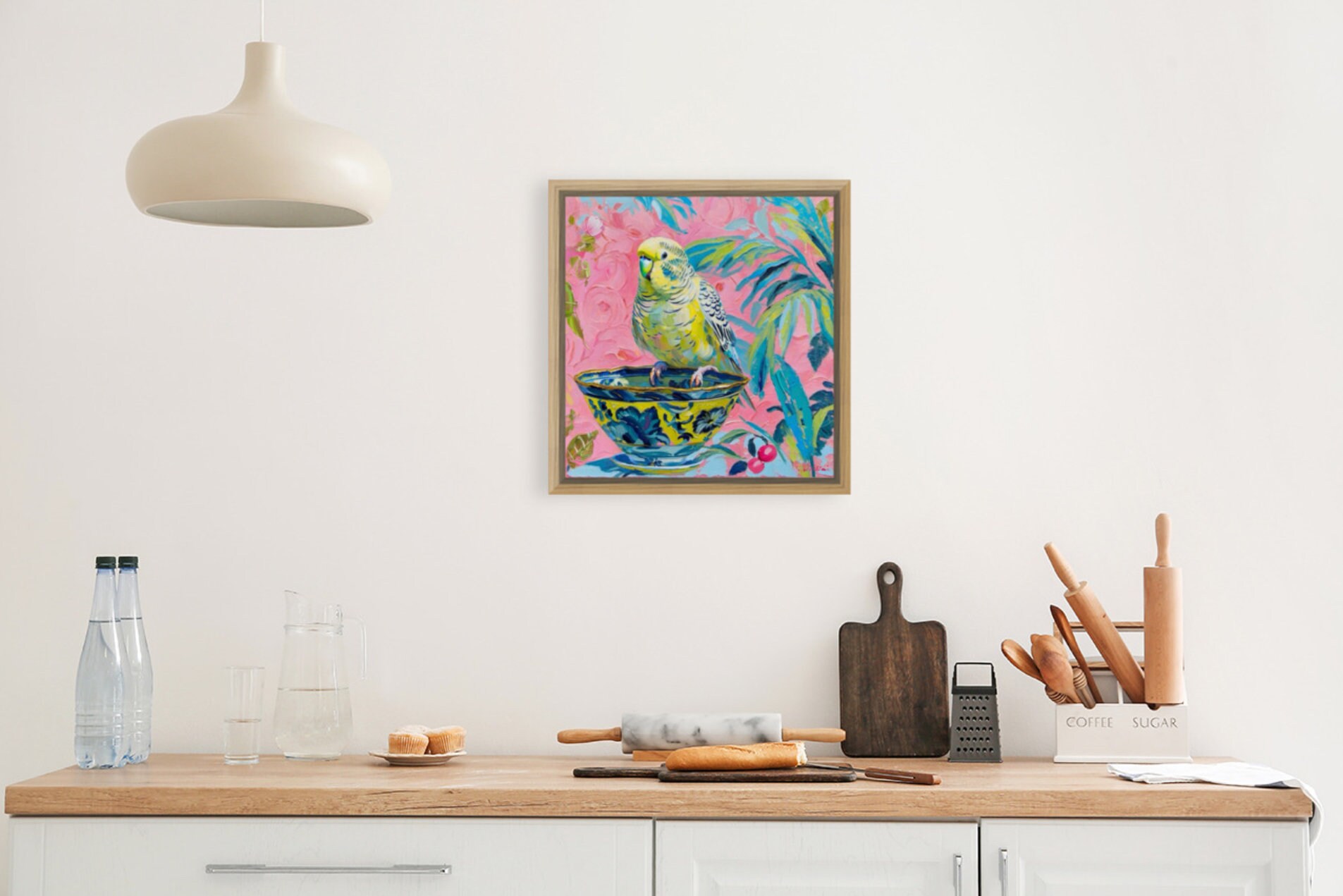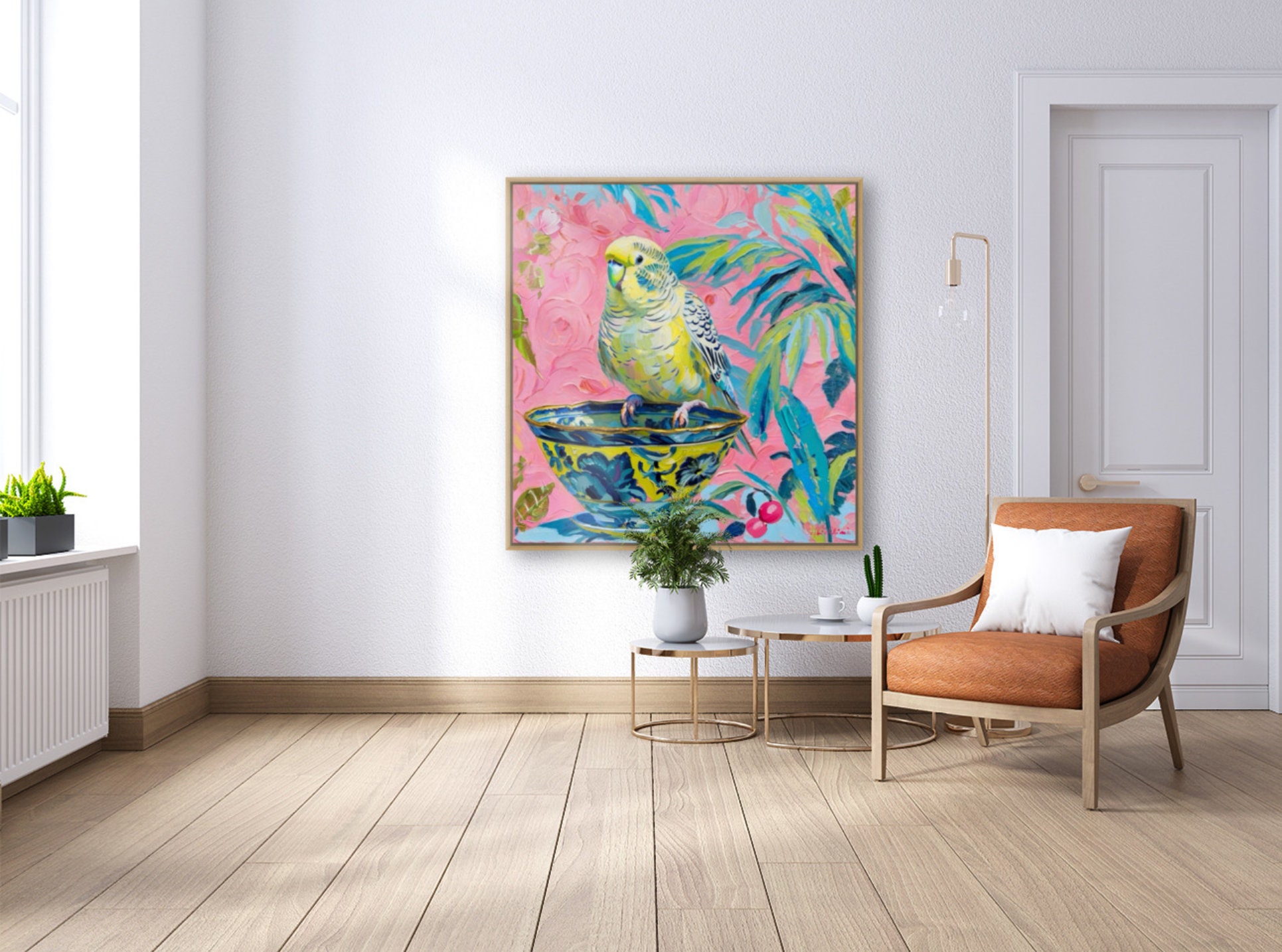 Grandmillennial art, yellow budgie on chinoiserie bowl, whimsical fine art