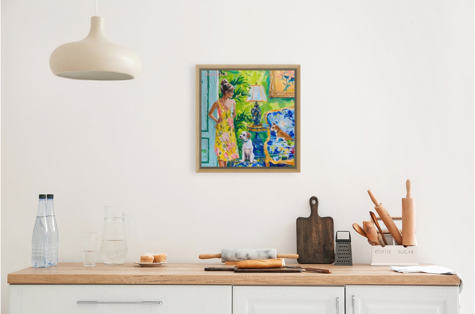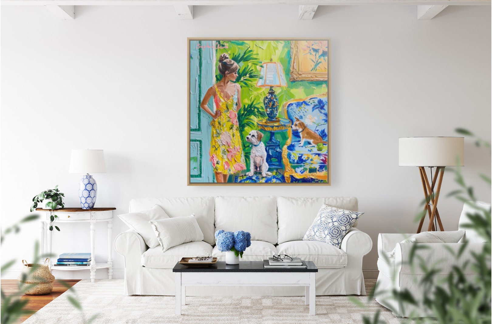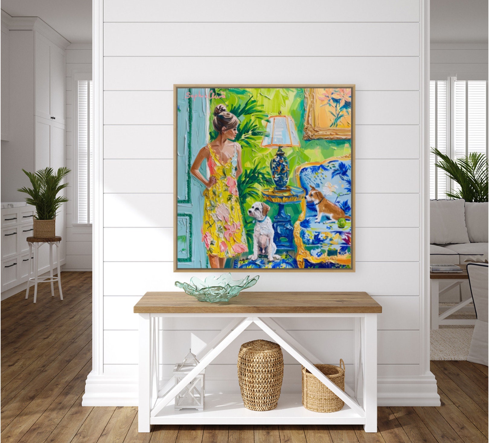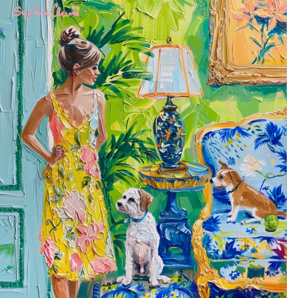 Ready to play fetch, grandmillennial art, oil painting, whimsical giclee