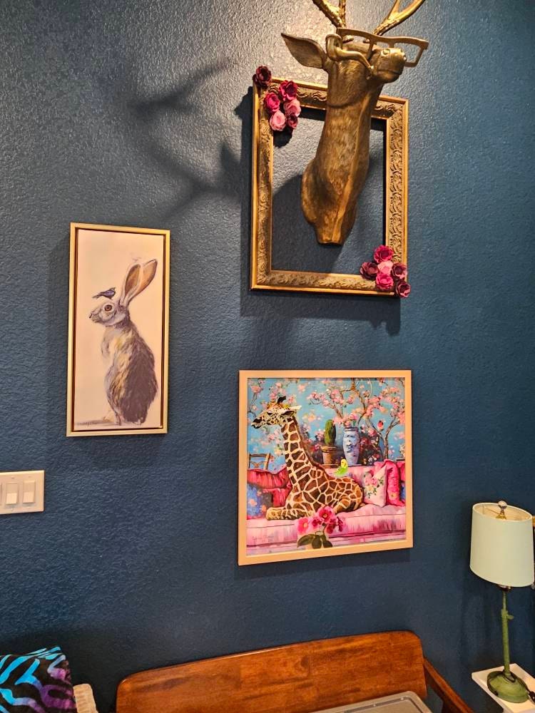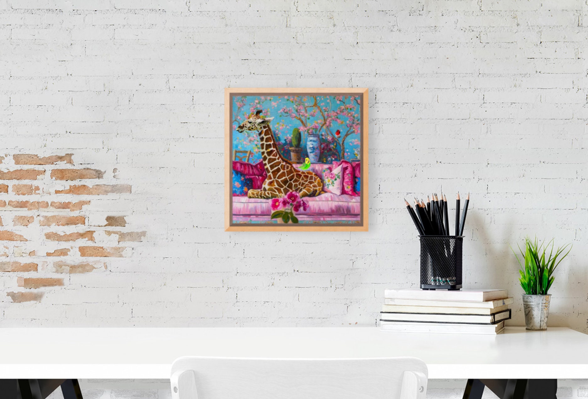 Grandmillennial art,Giraffe and green budgie in chinoiserie interior, whimsical fine art