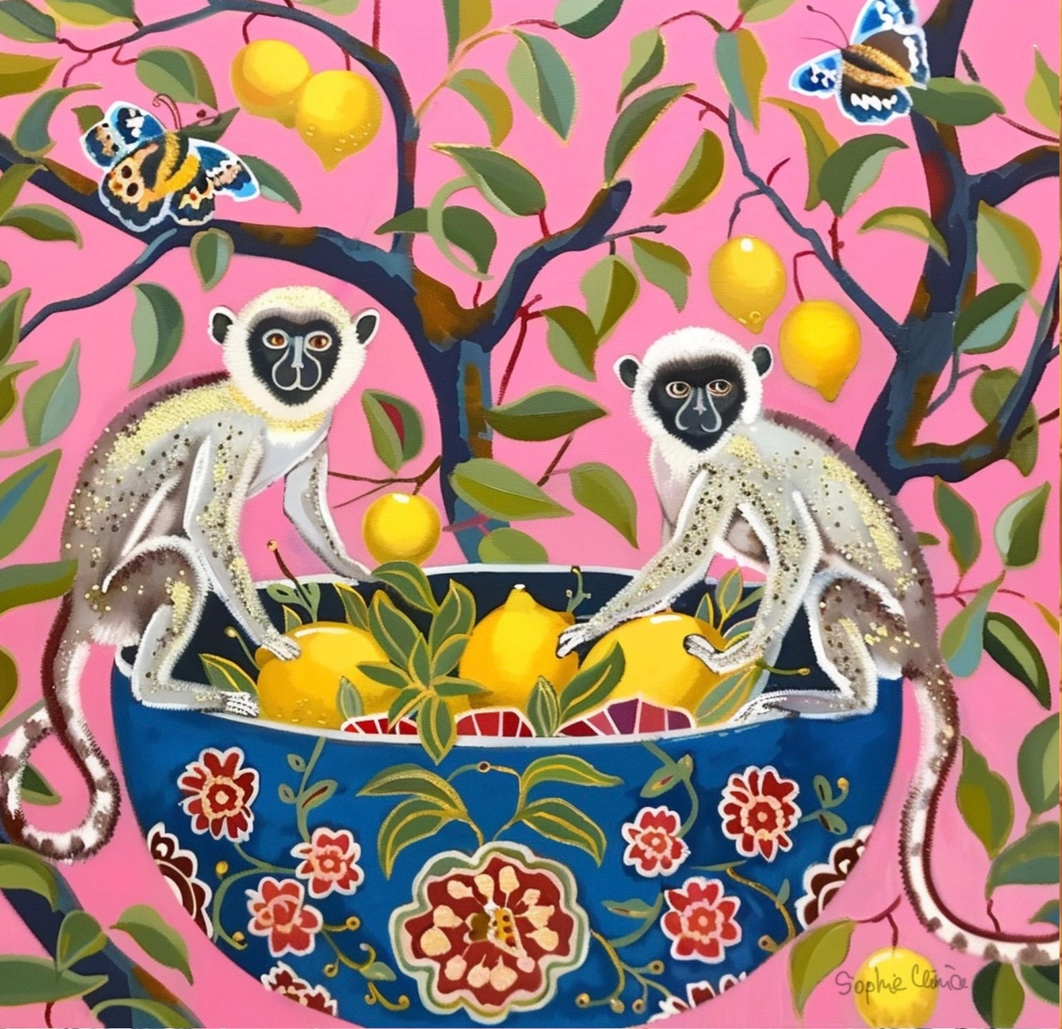 Sophie's art is the modern interpretation of Chinese artistic traditions featuring pagodas, landscapes, blue and white porcelain, ginger jars, pagodas, cheetahs and monkeys. Sophie developed her own recognizable style with bright colors and whimsical details.