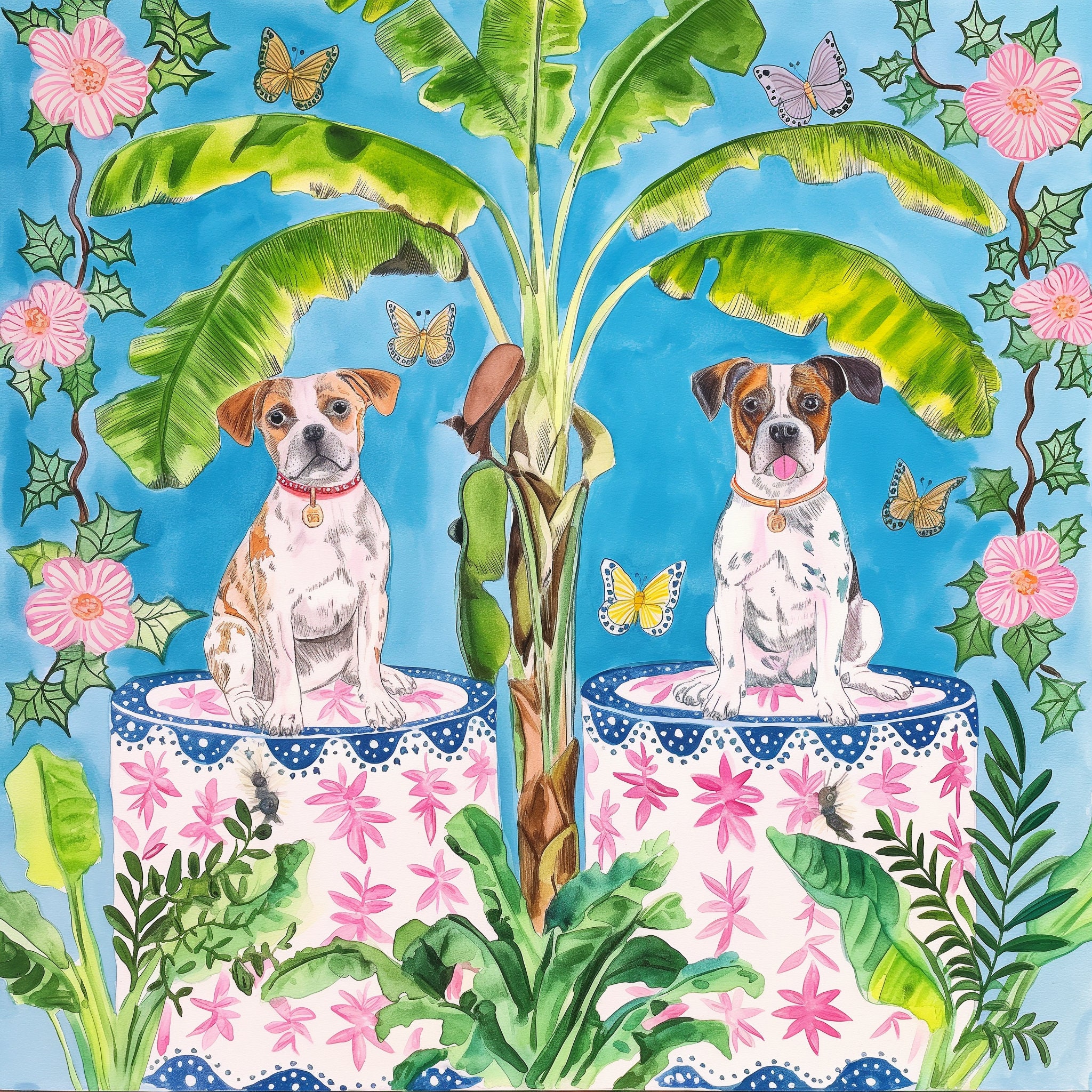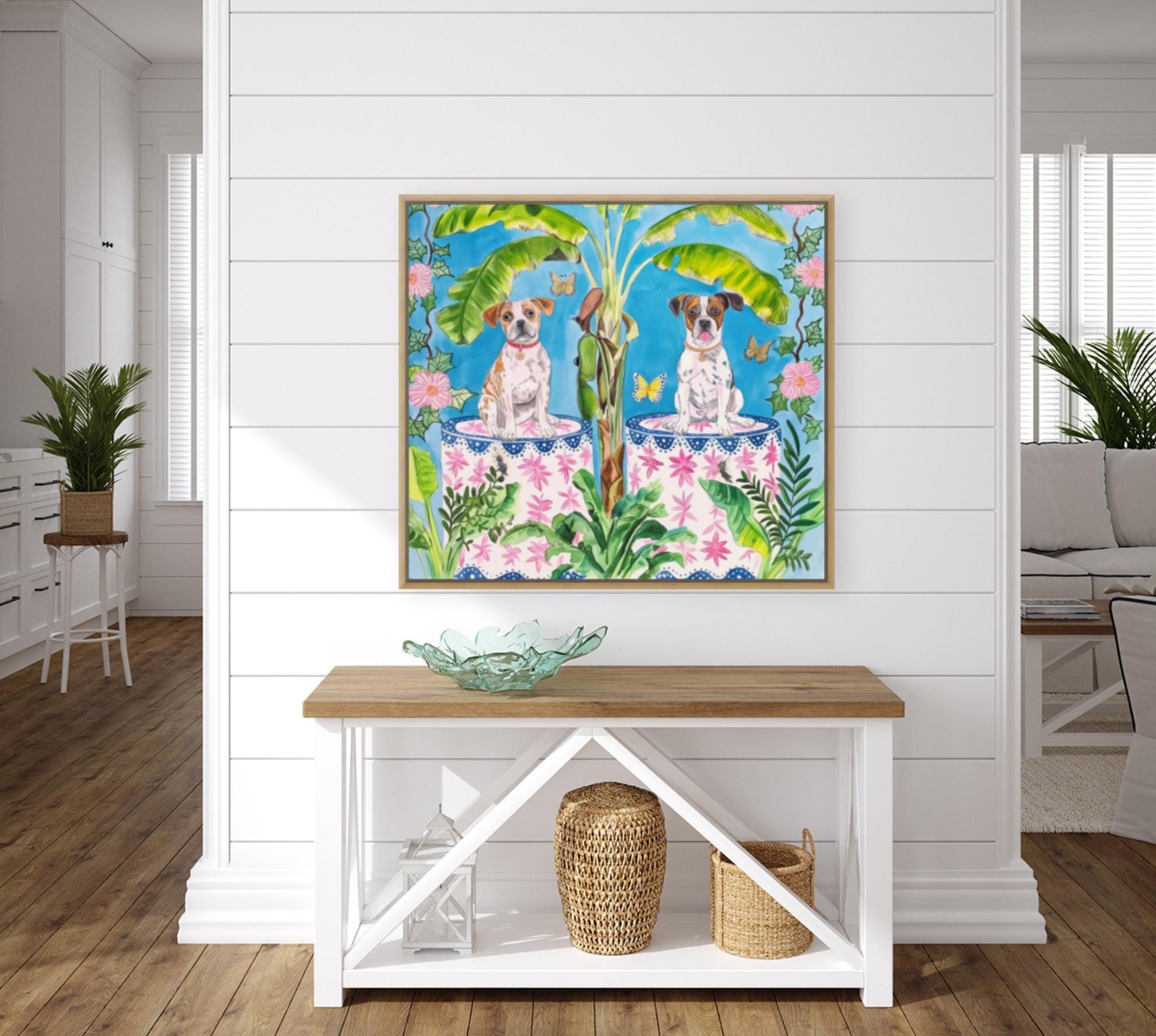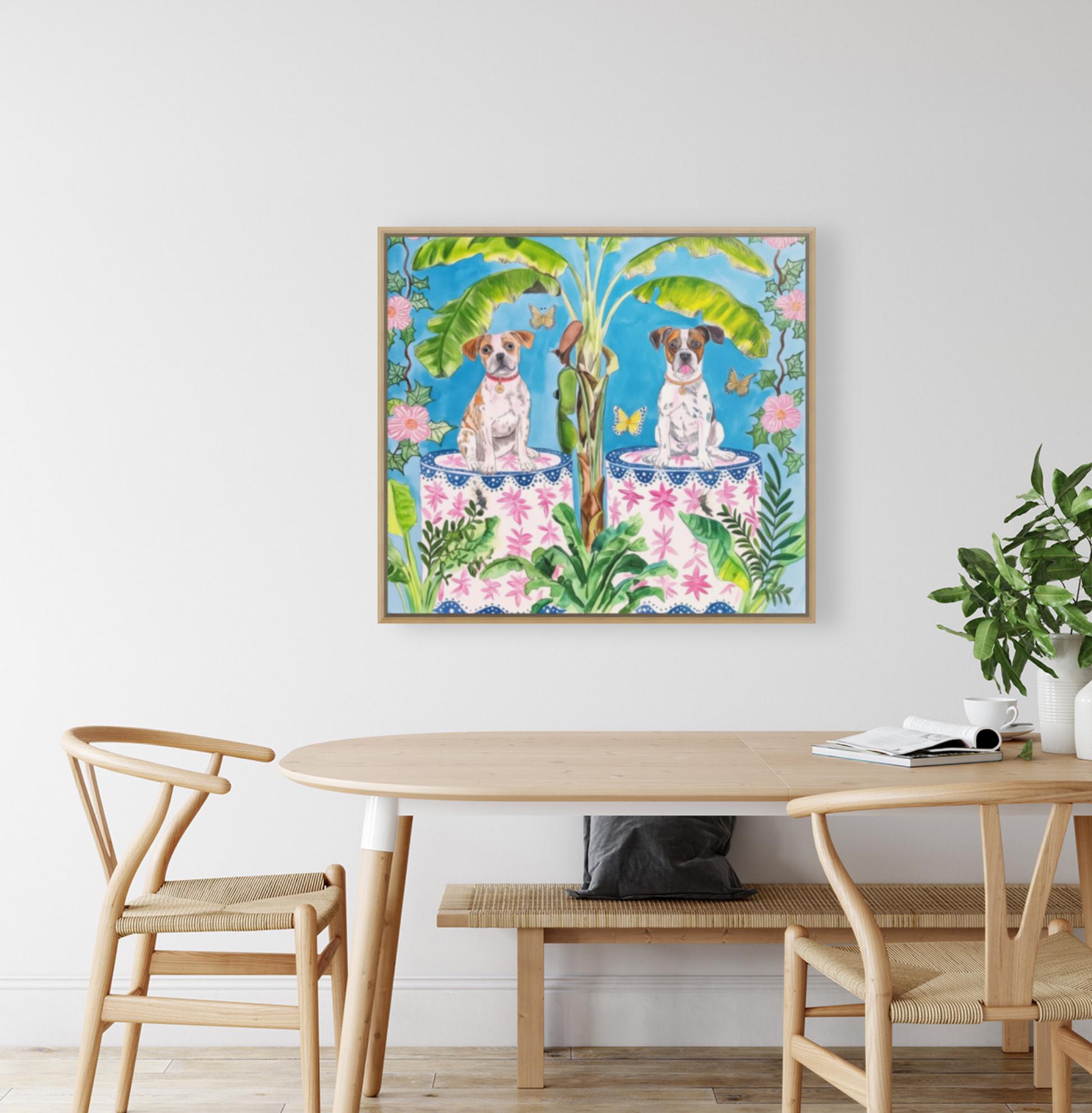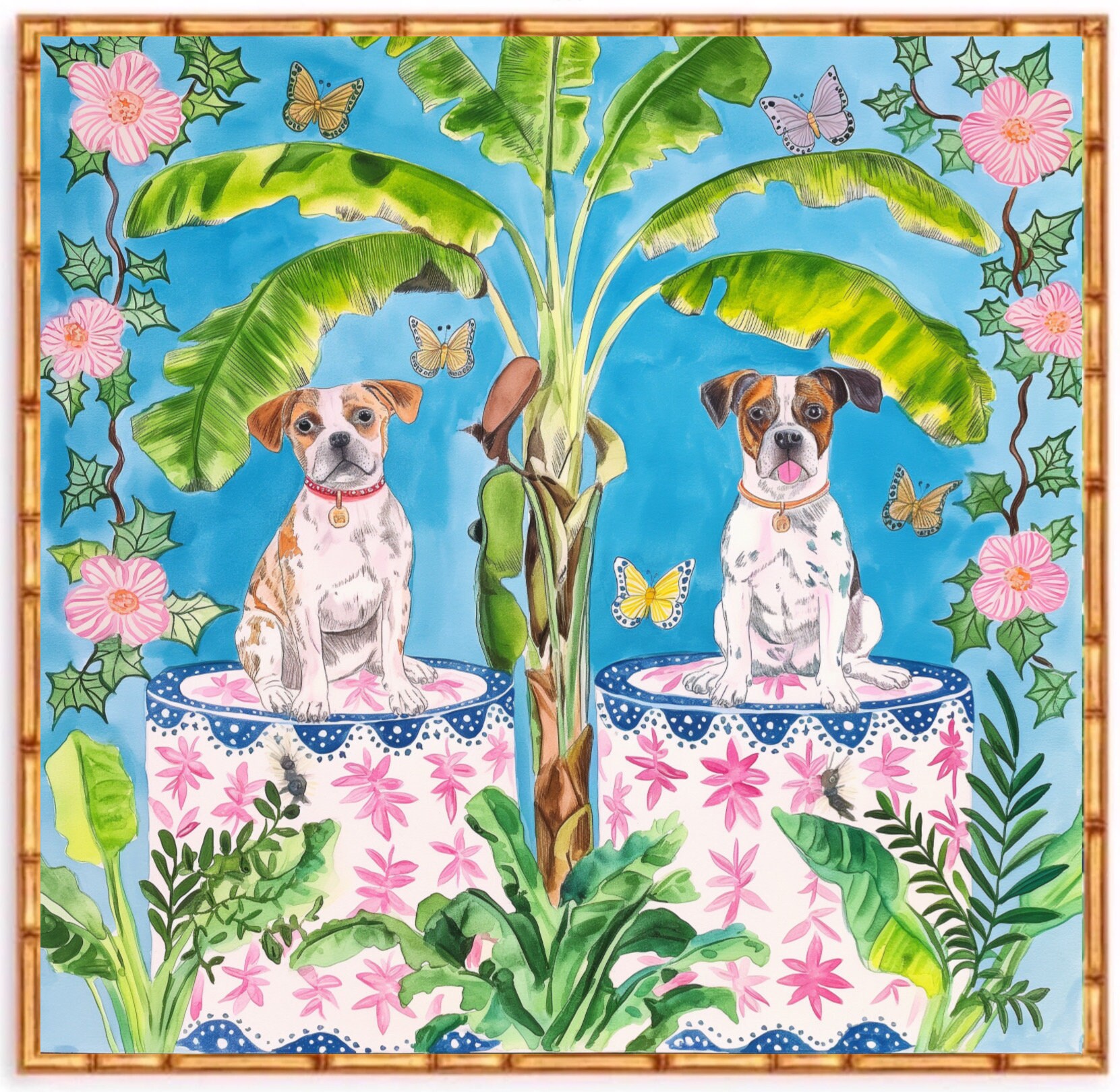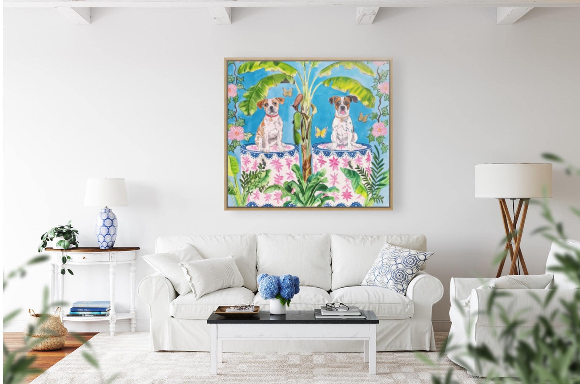 Grandmillennial art, Terriers on chinoiserie garden stools giclee art print