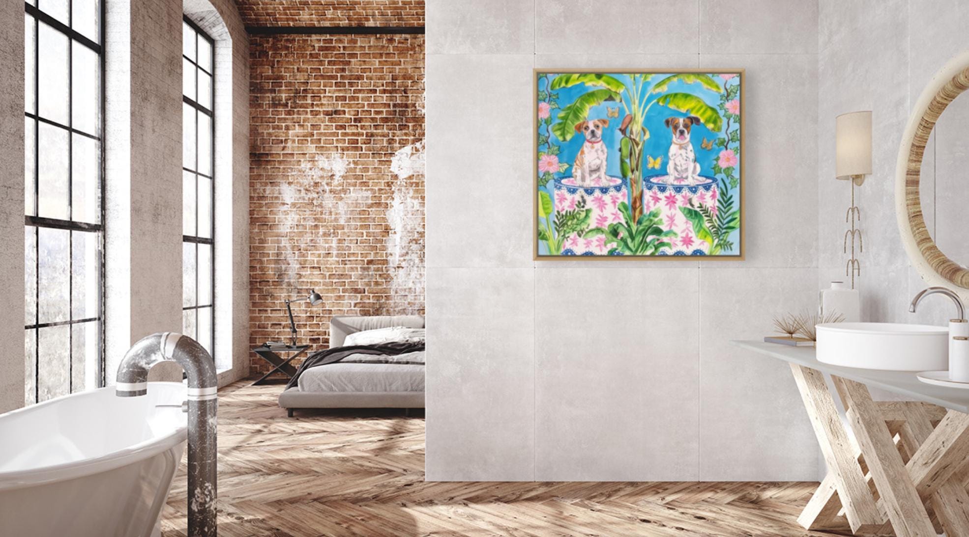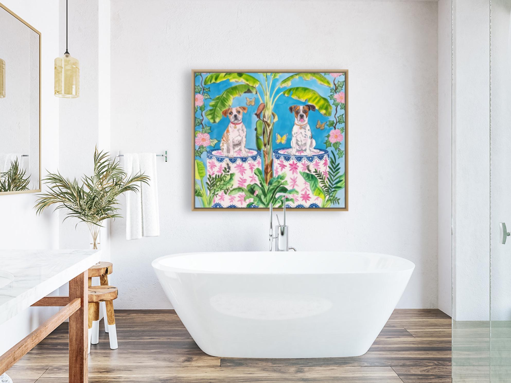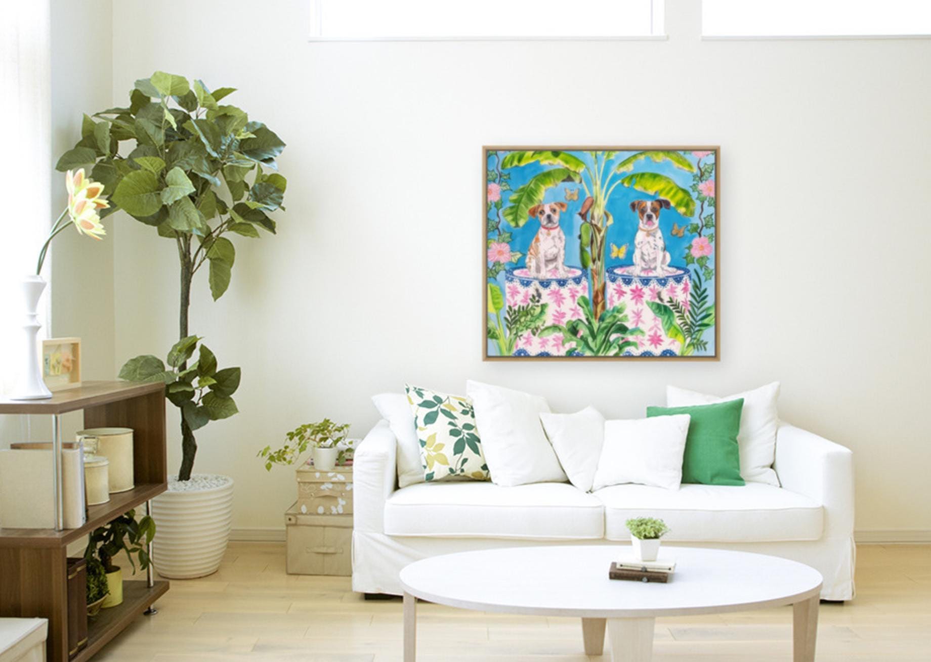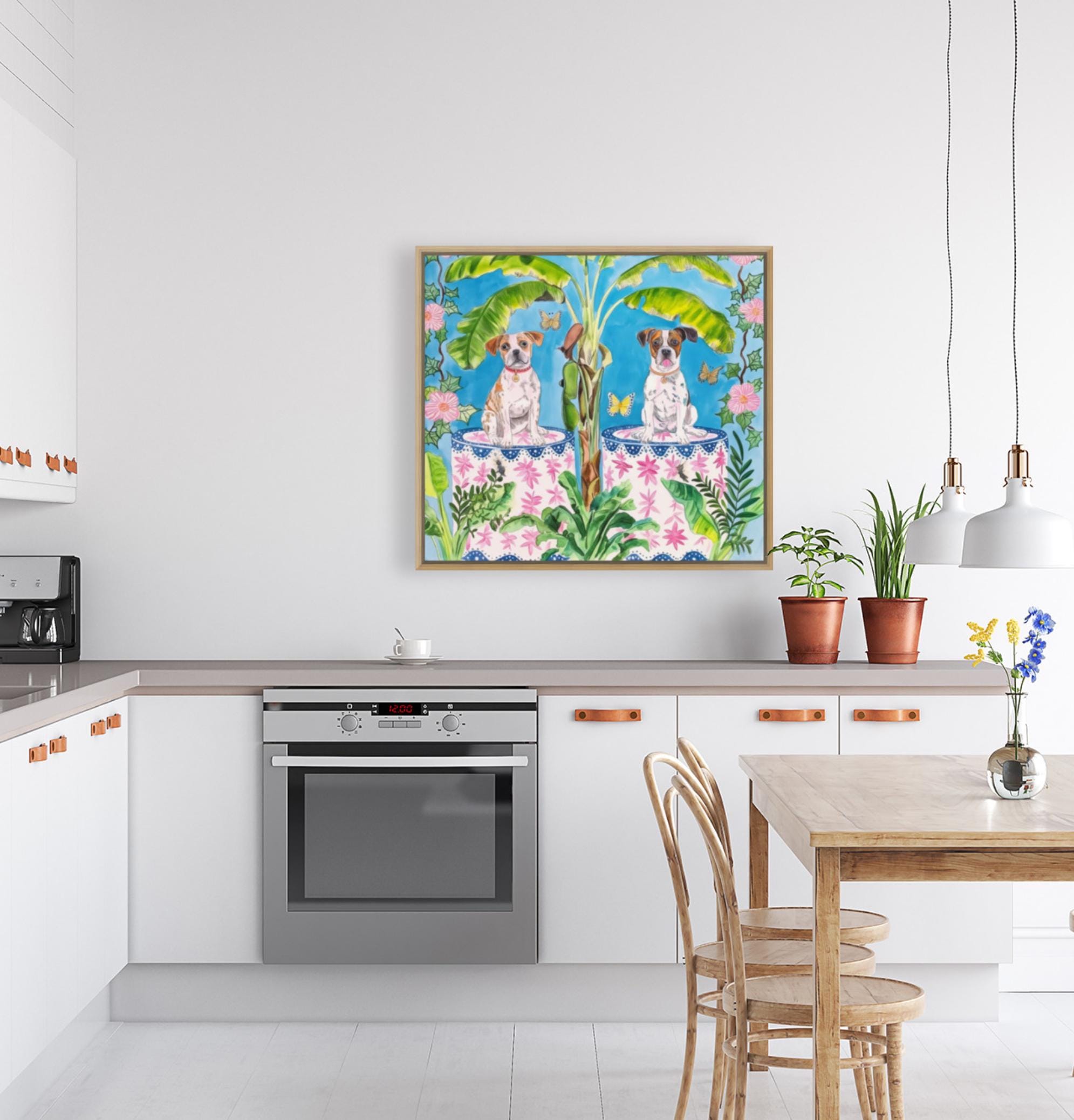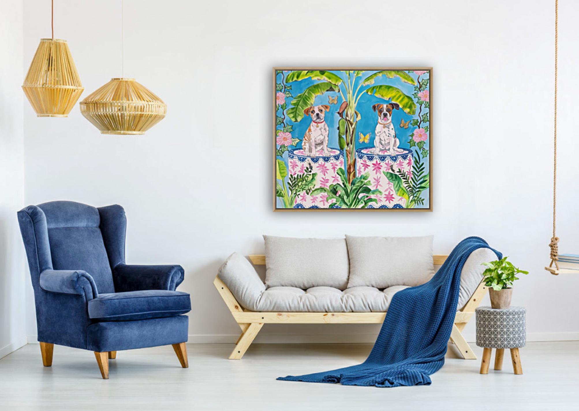 Grandmillennial art, Terriers on chinoiserie garden stools giclee art print