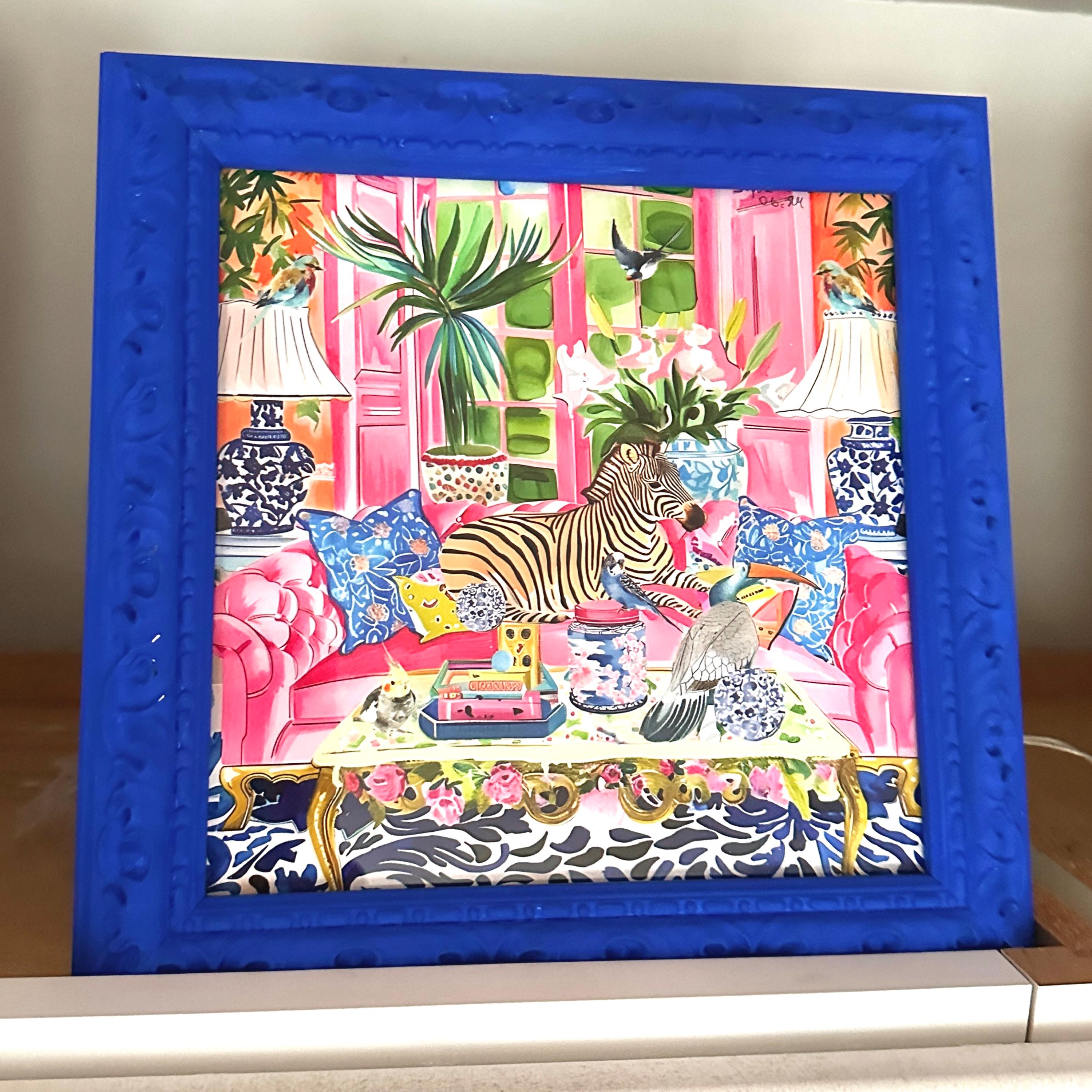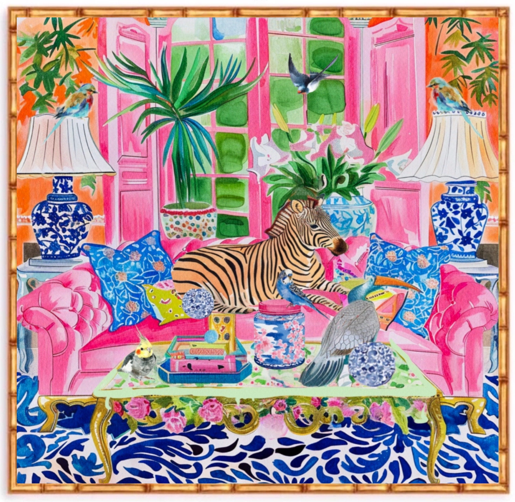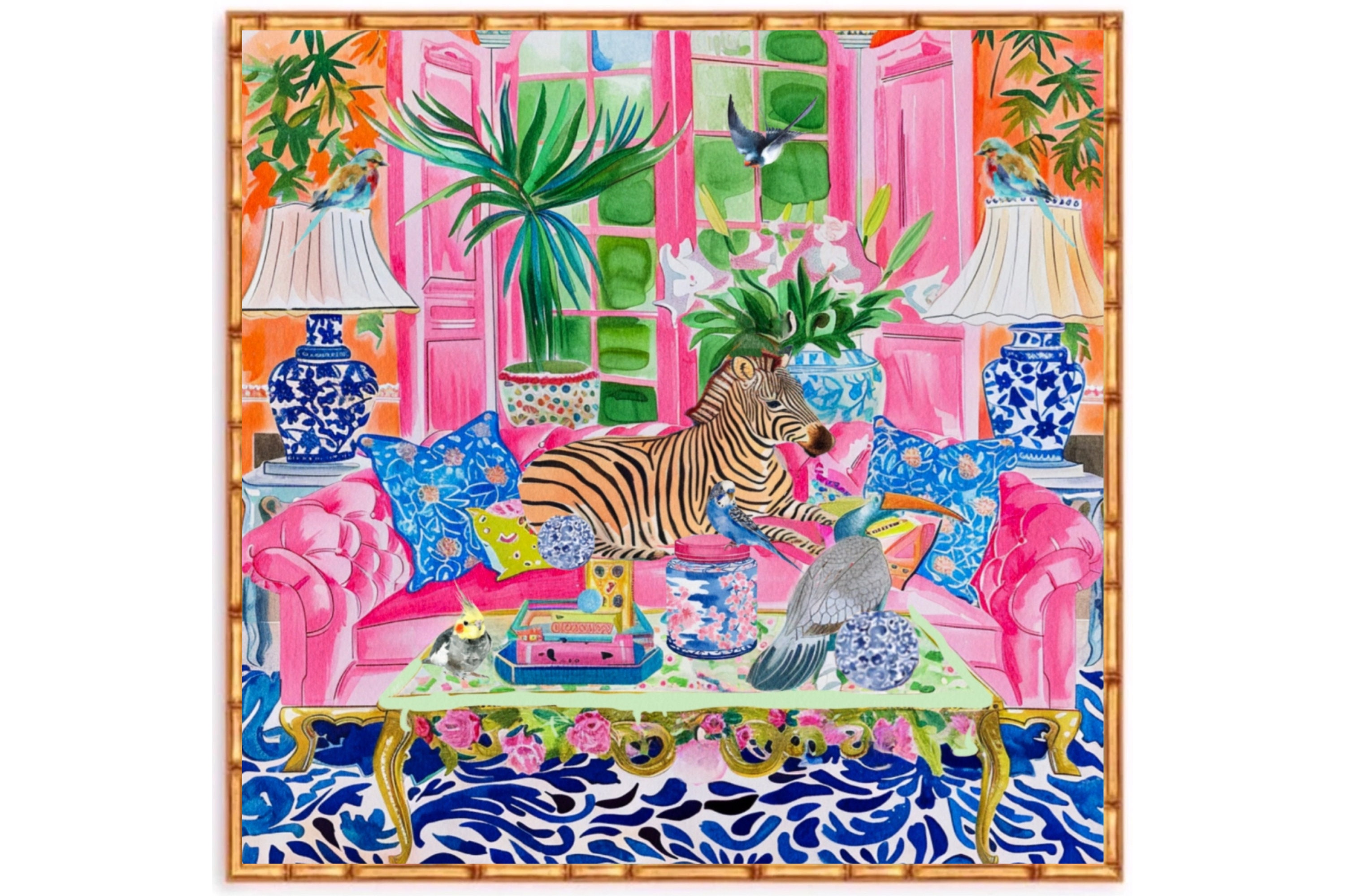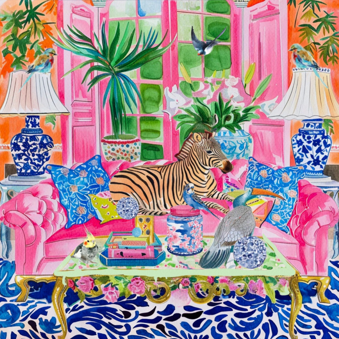 Grandmillennial art, Zebra and birds in preppy chinoiserie interior, whimsical watercolor