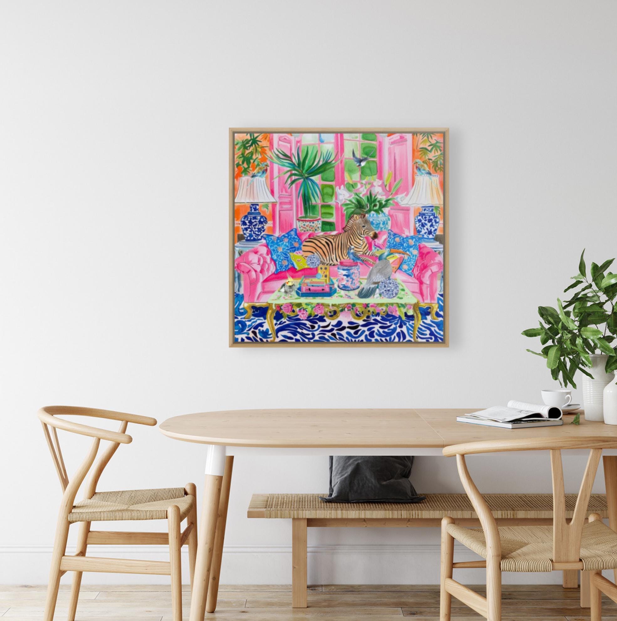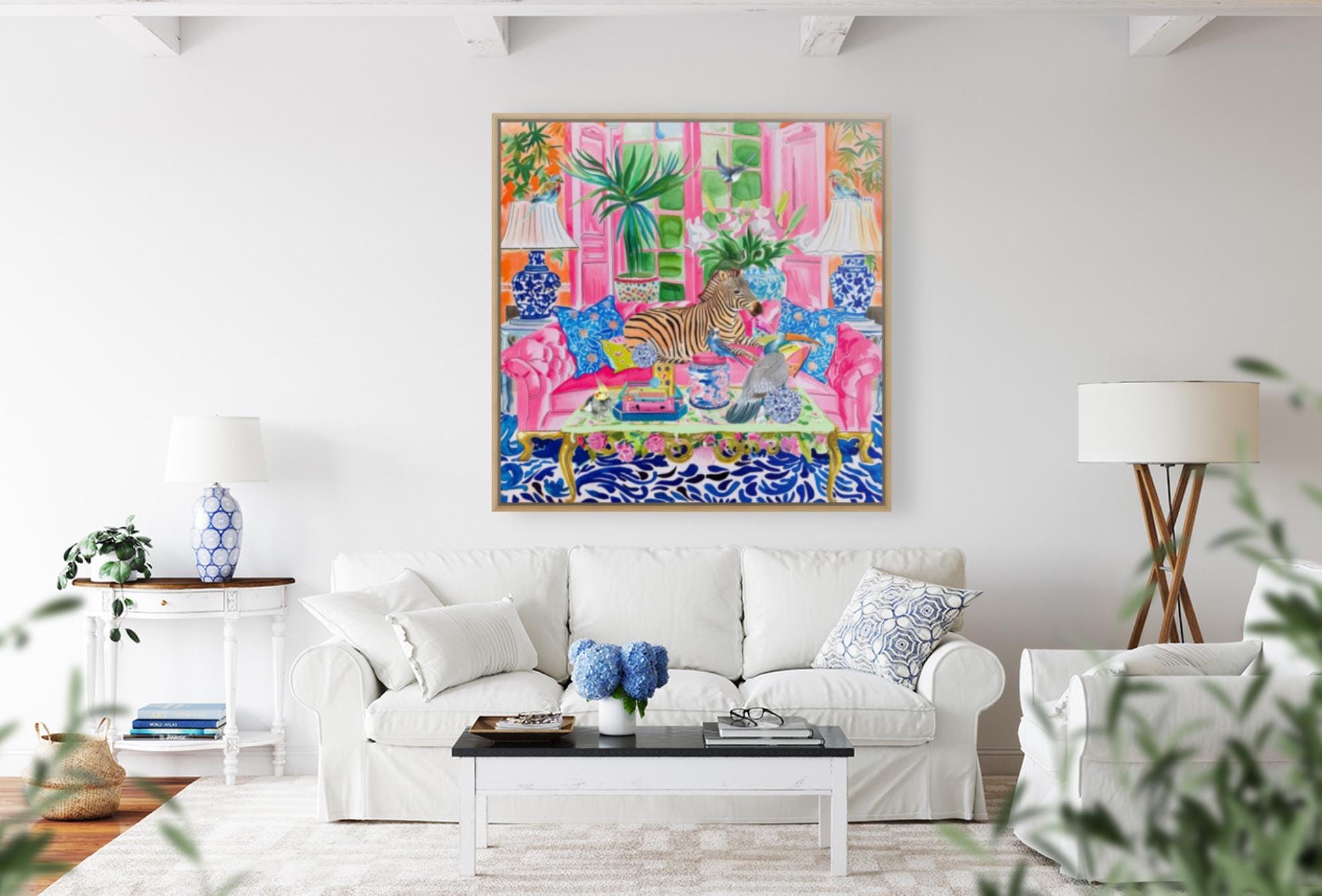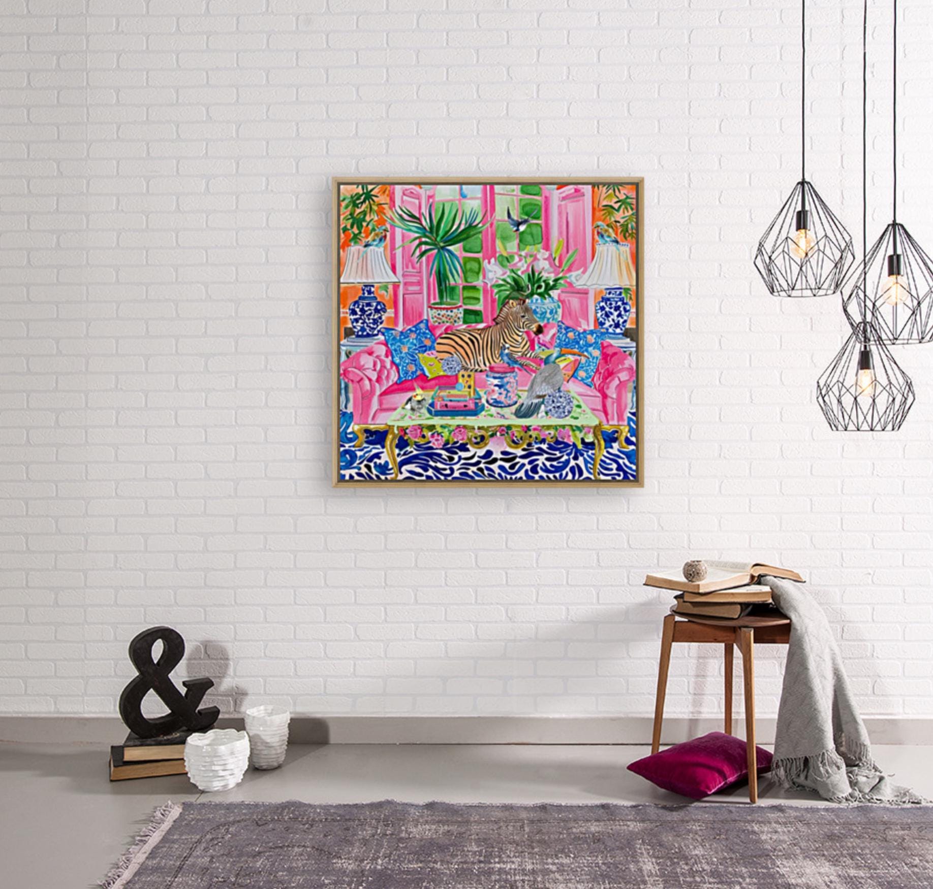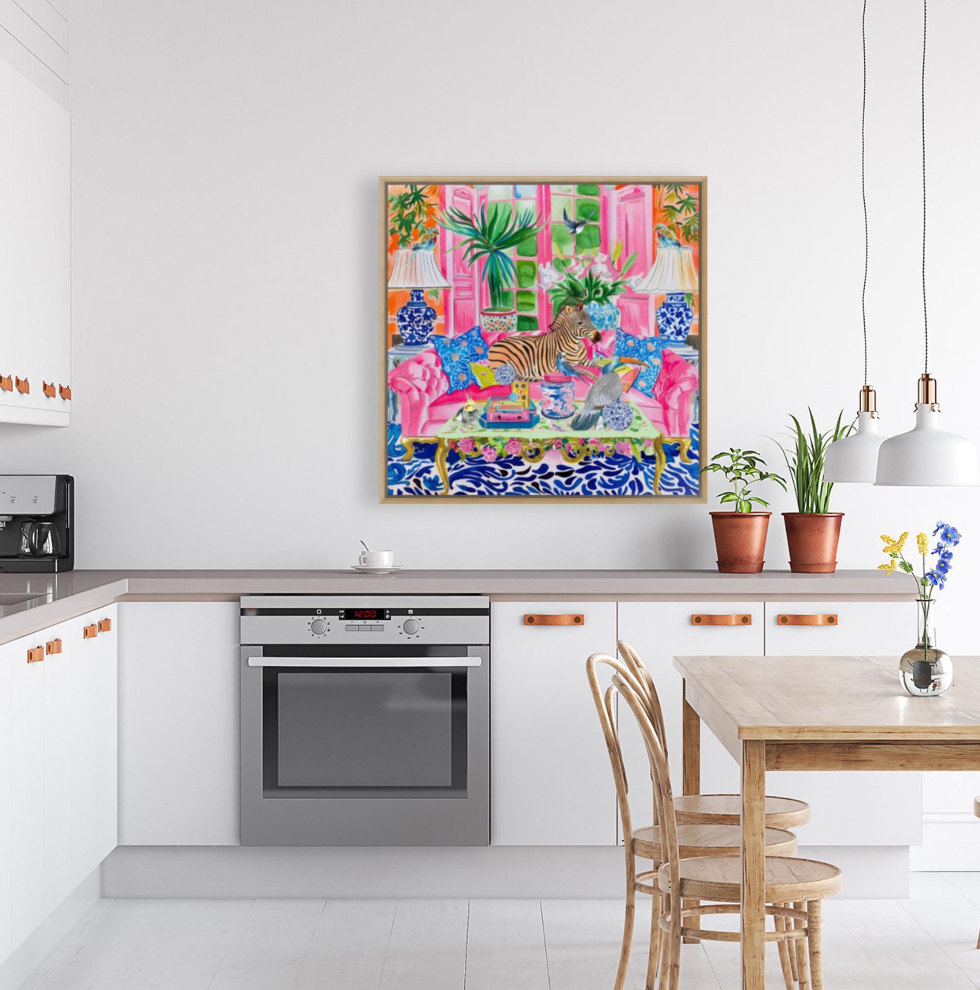 Grandmillennial art, Zebra and birds in preppy chinoiserie interior, whimsical watercolor
