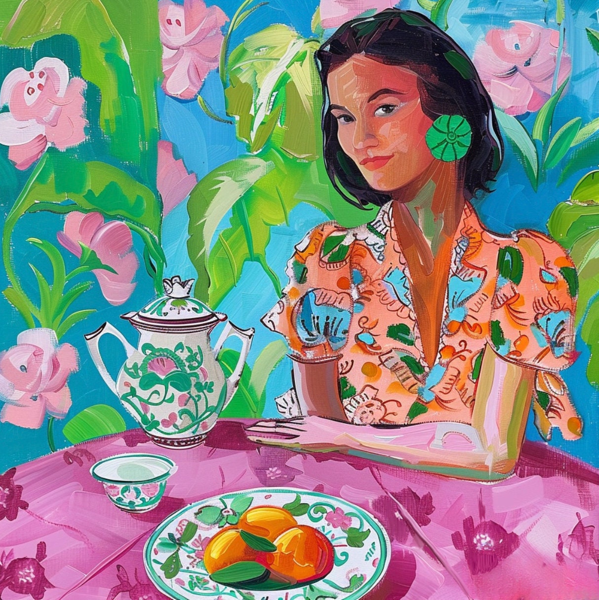 Grandmillennial art, A girl with a bowl of oranges, fine art print