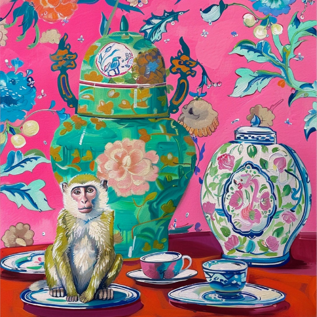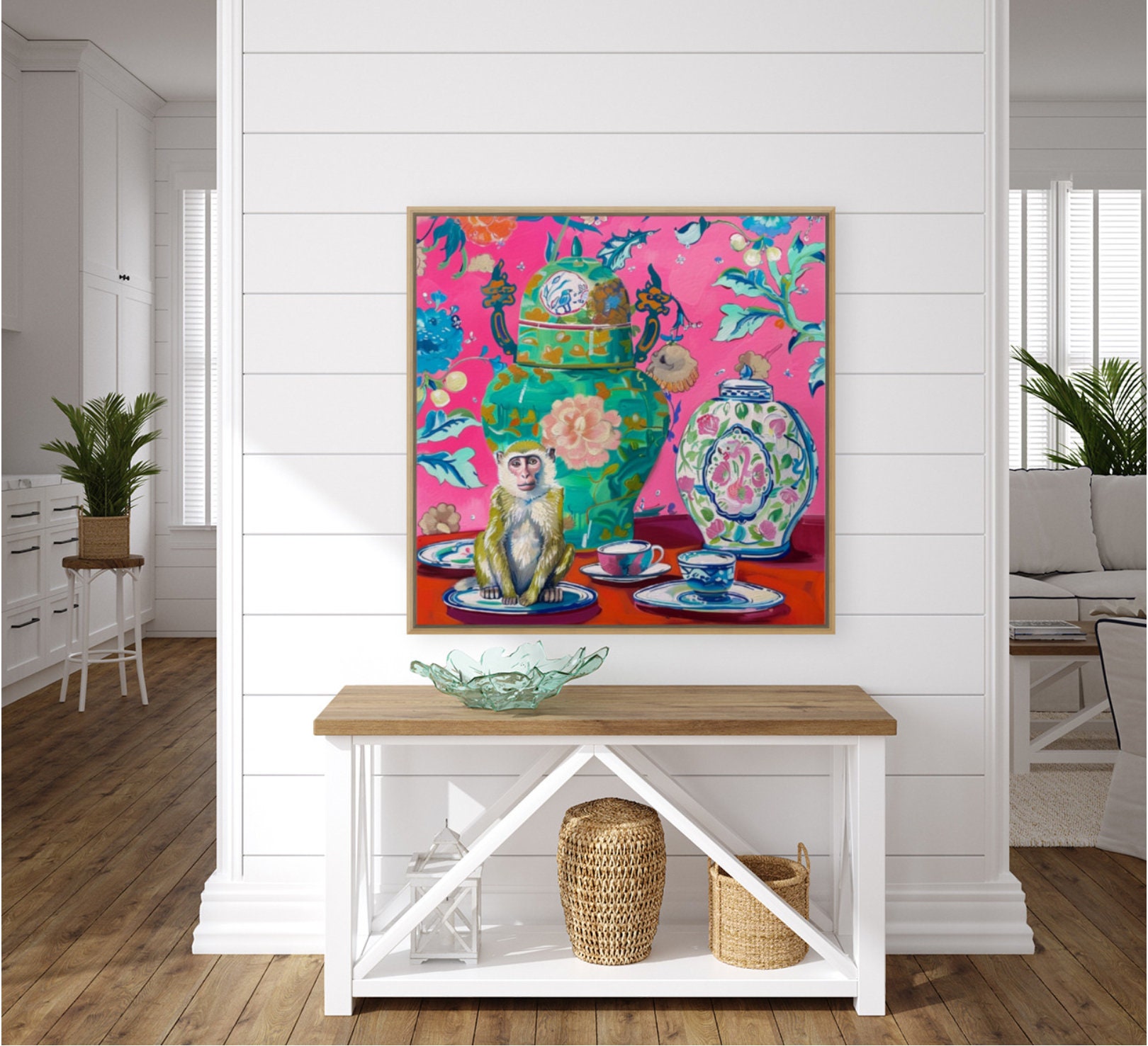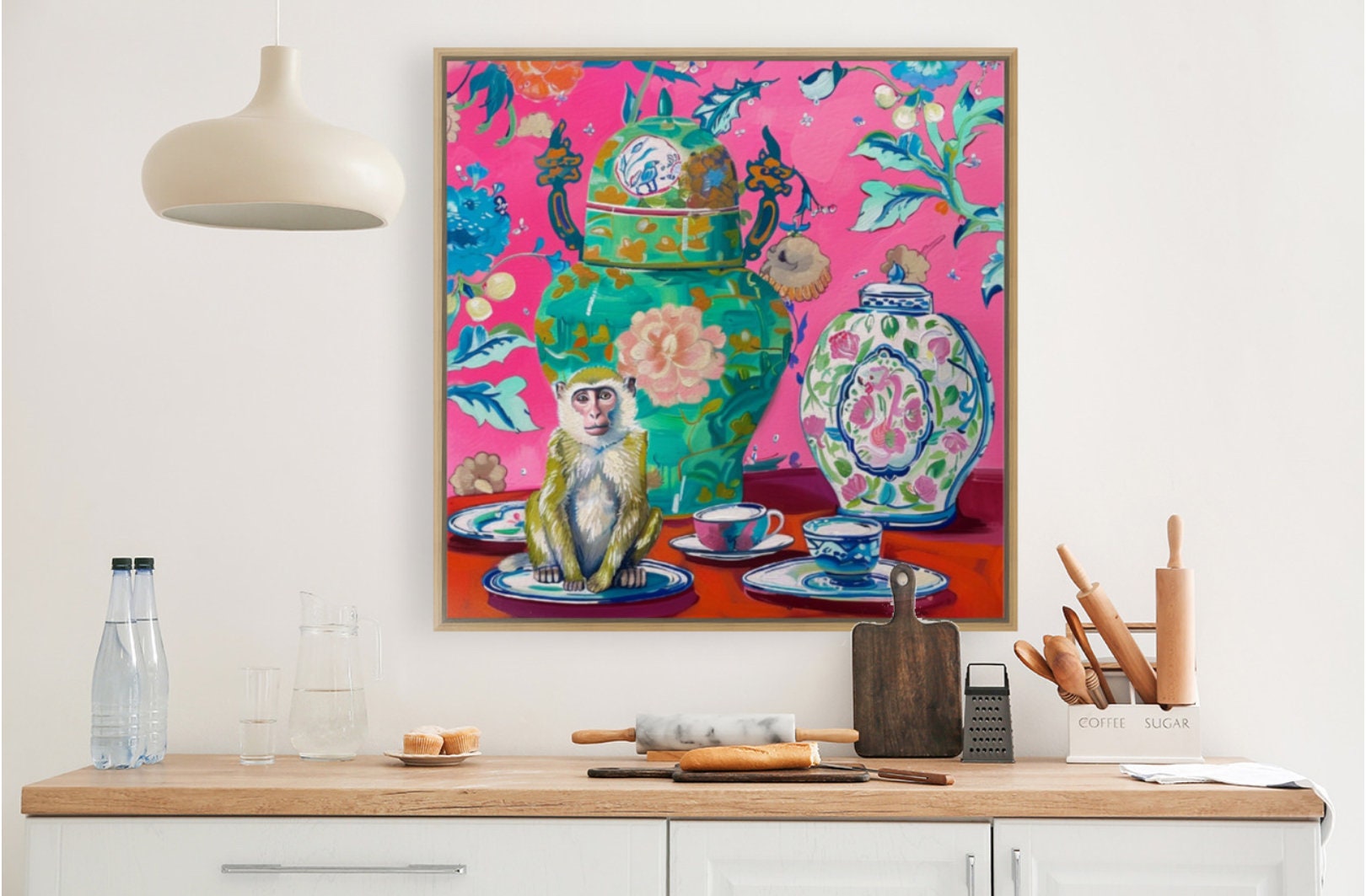 Grandmillennial art, Monkey in chinoiserie interior art print