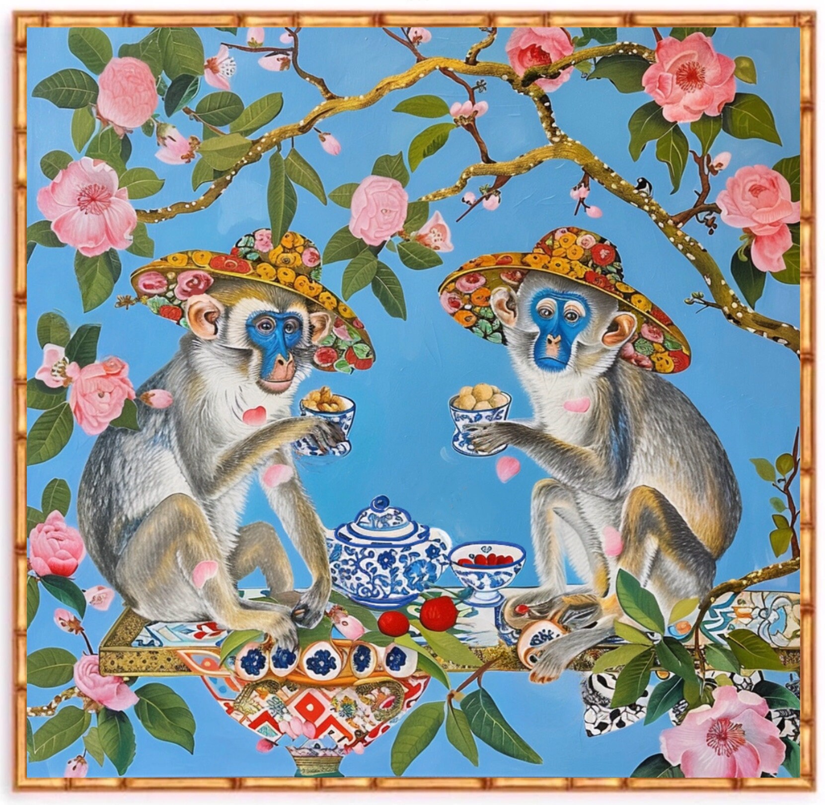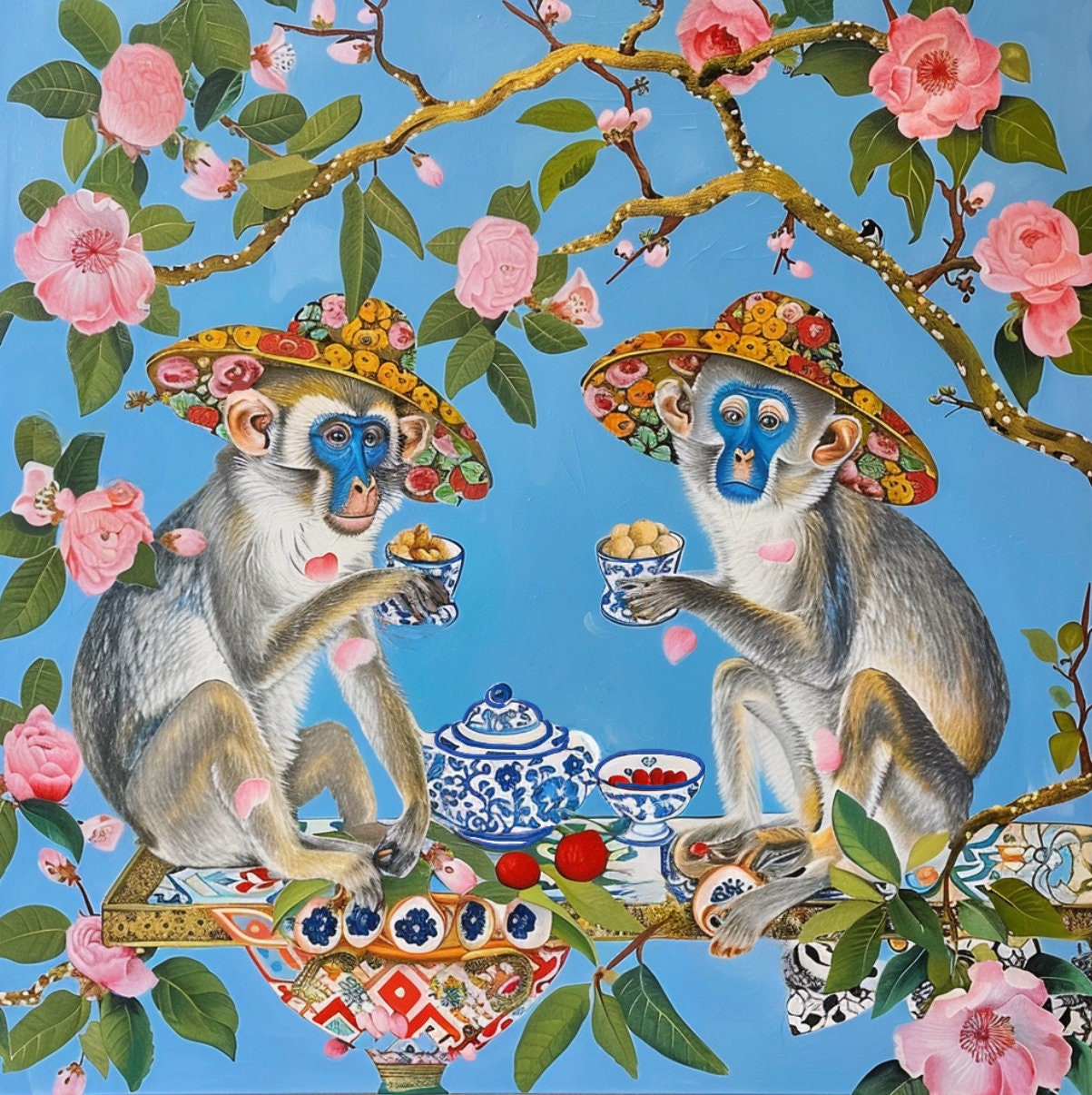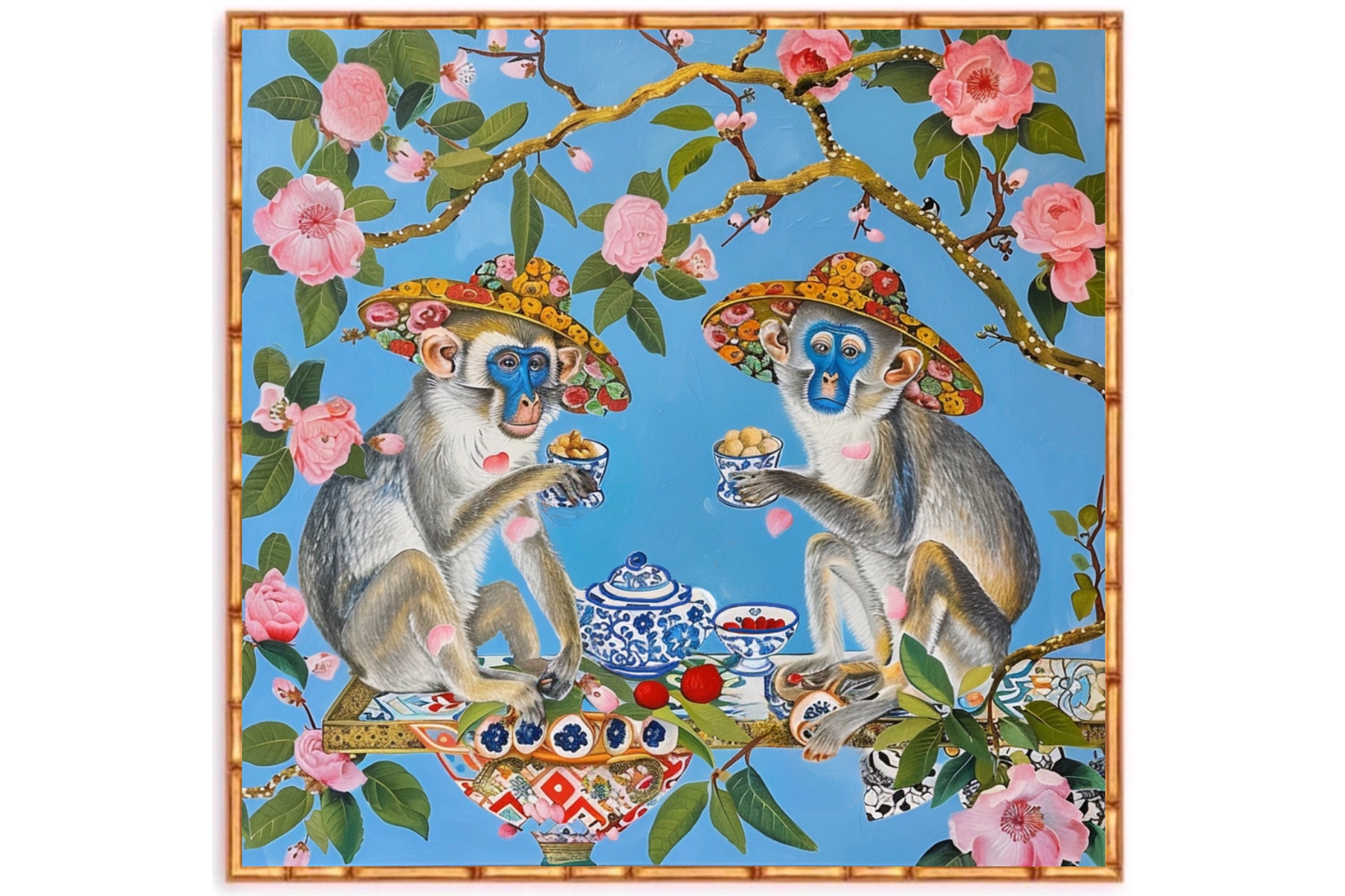 Chinoiserie Monkey Art Print: Beach Hats & Dog Roses