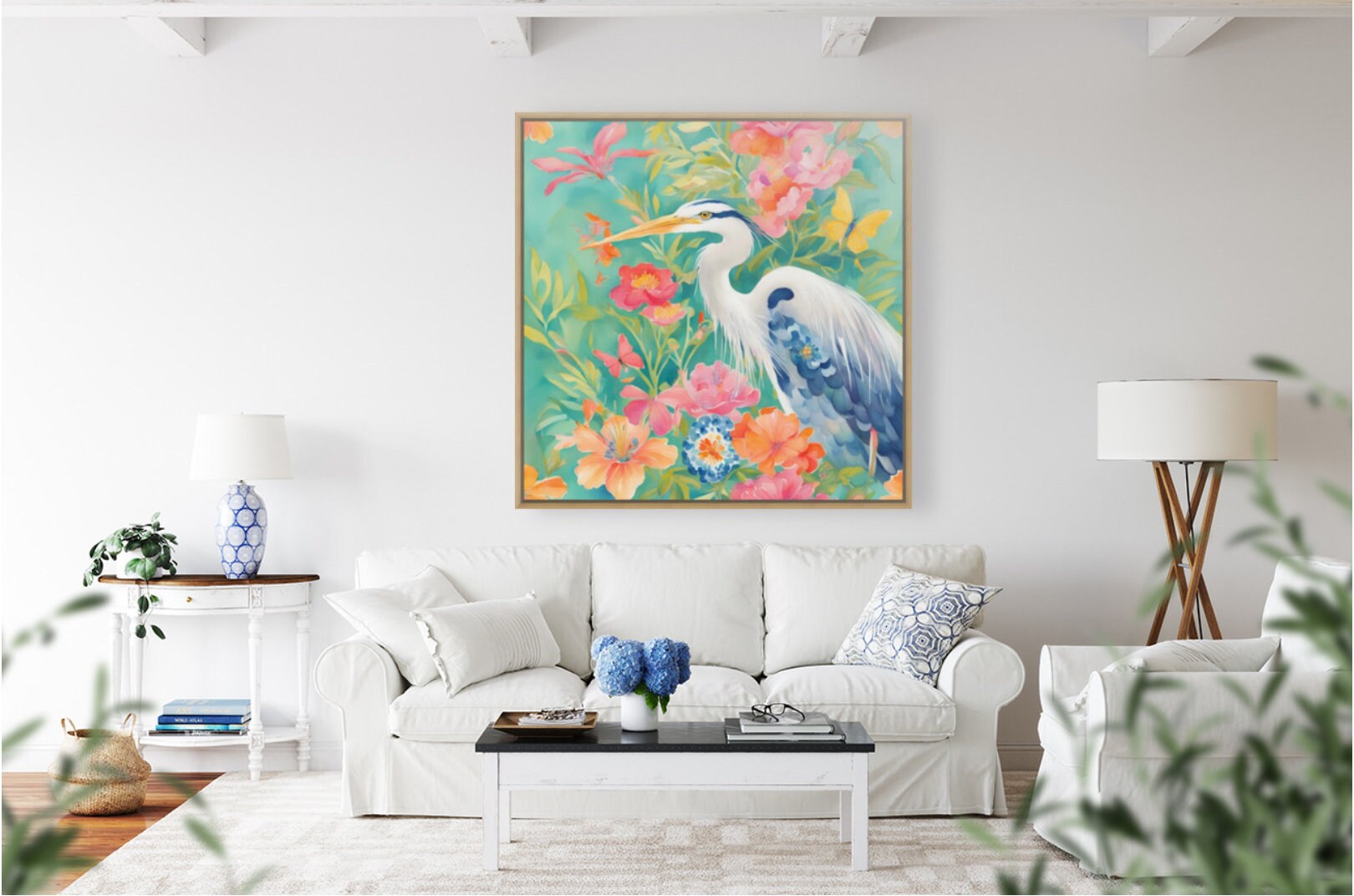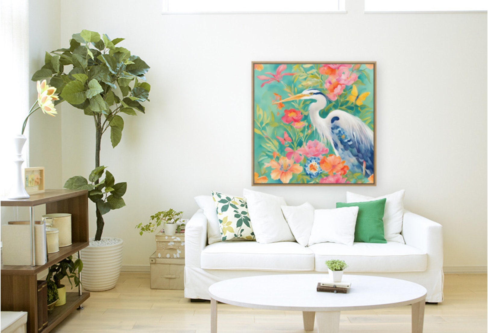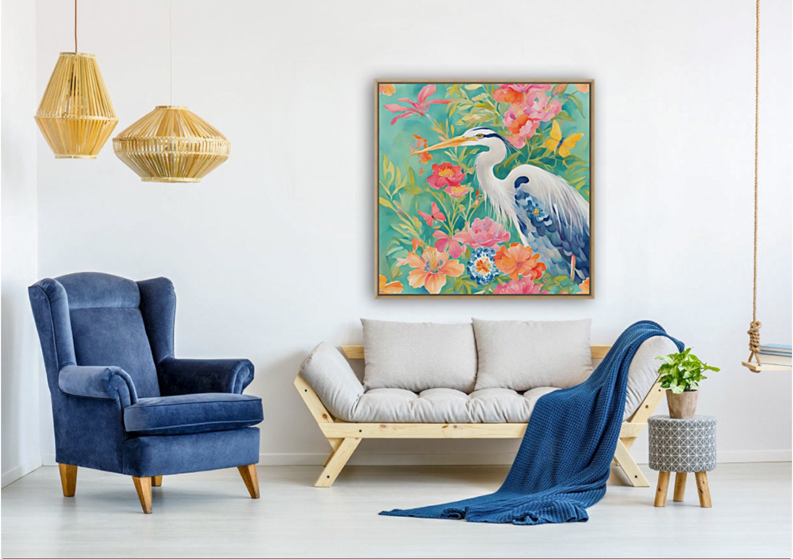 PLEASE NOTE SIZES ARE IN CM. Modern take on chinoiserie style. Heron and chinoiserie flowers. Large vibrant watercolor