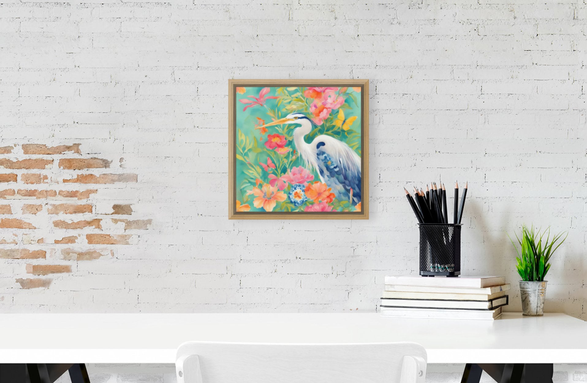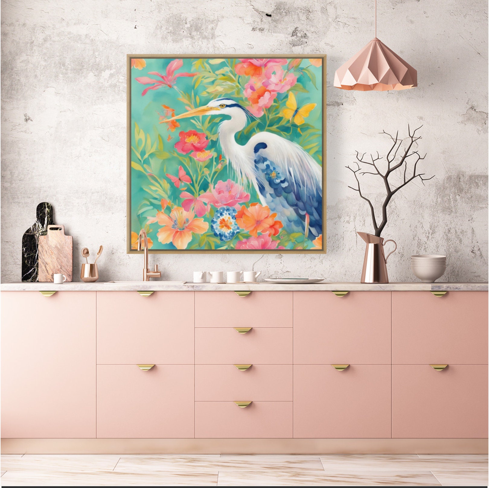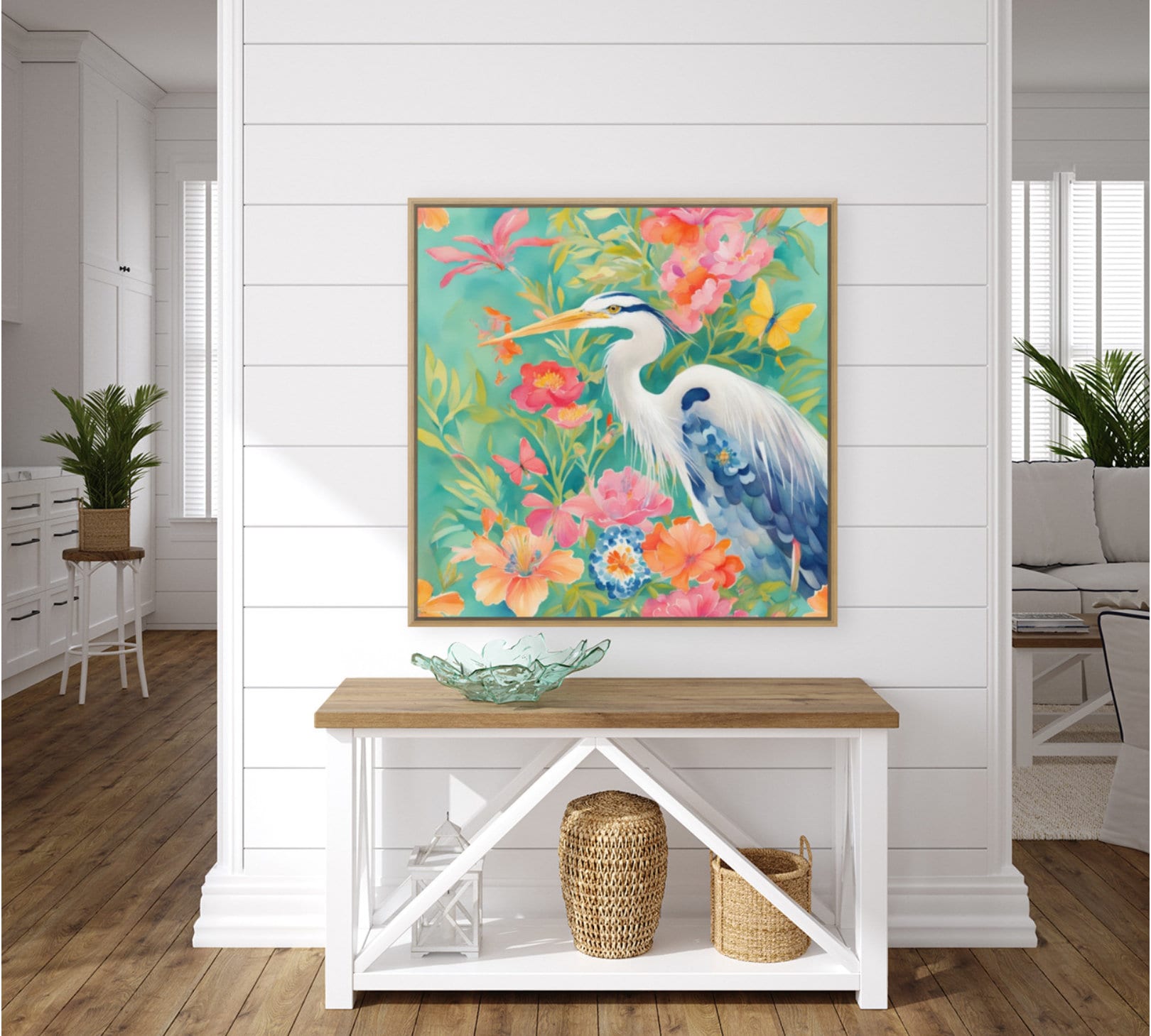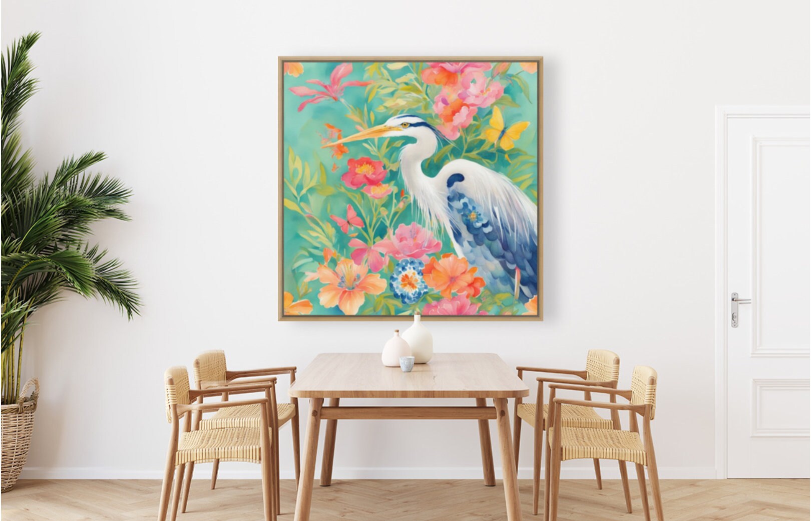 PLEASE NOTE SIZES ARE IN CM. Modern take on chinoiserie style. Heron and chinoiserie flowers. Large vibrant watercolor