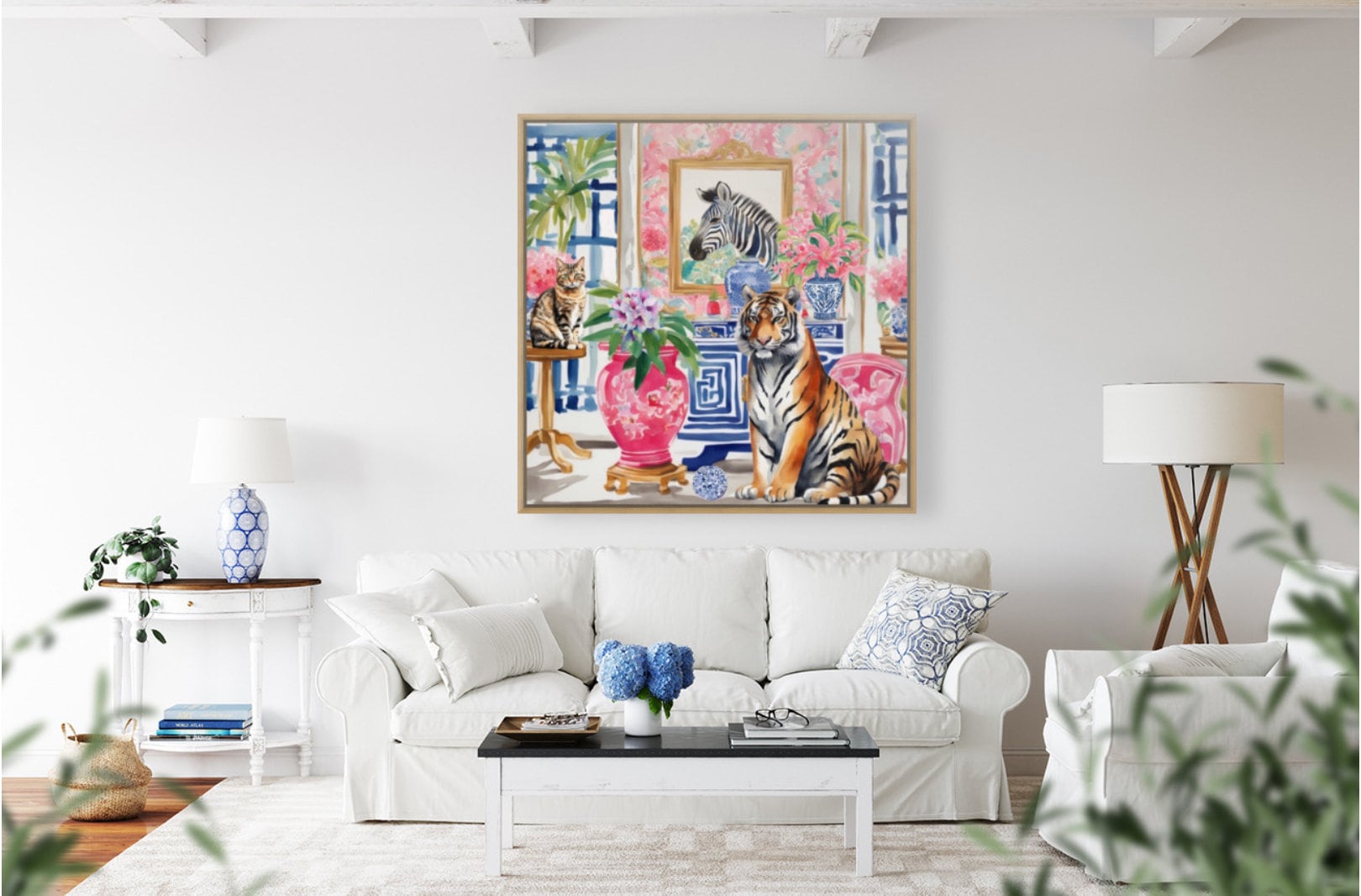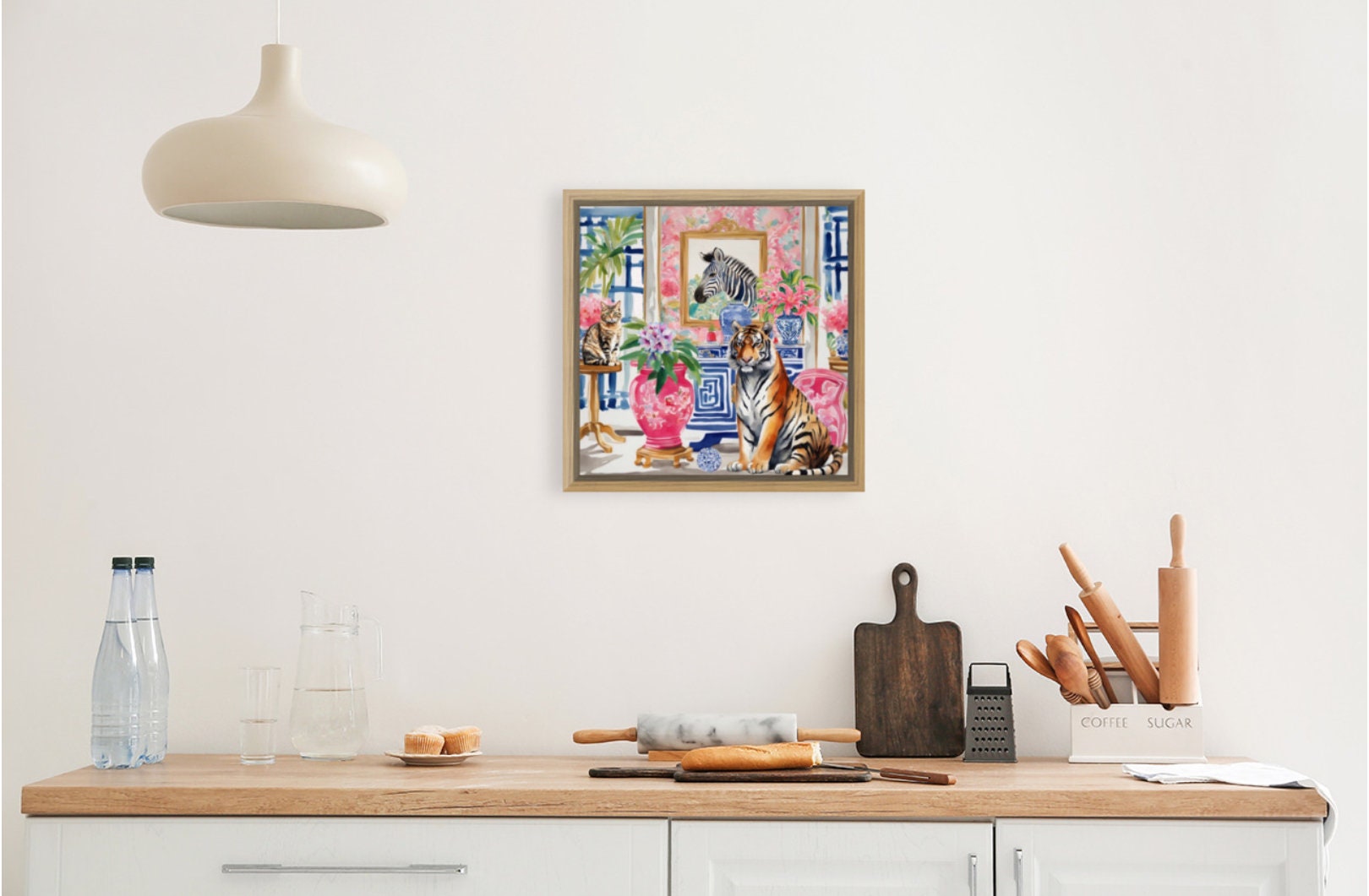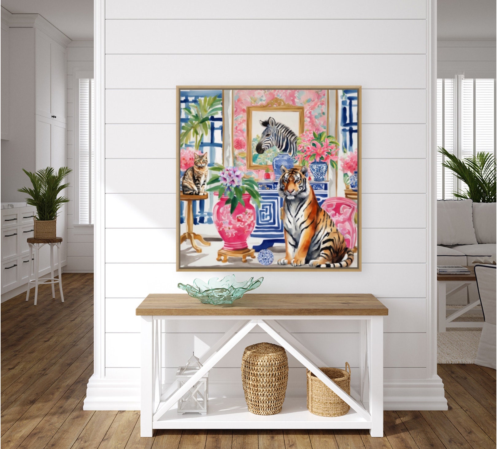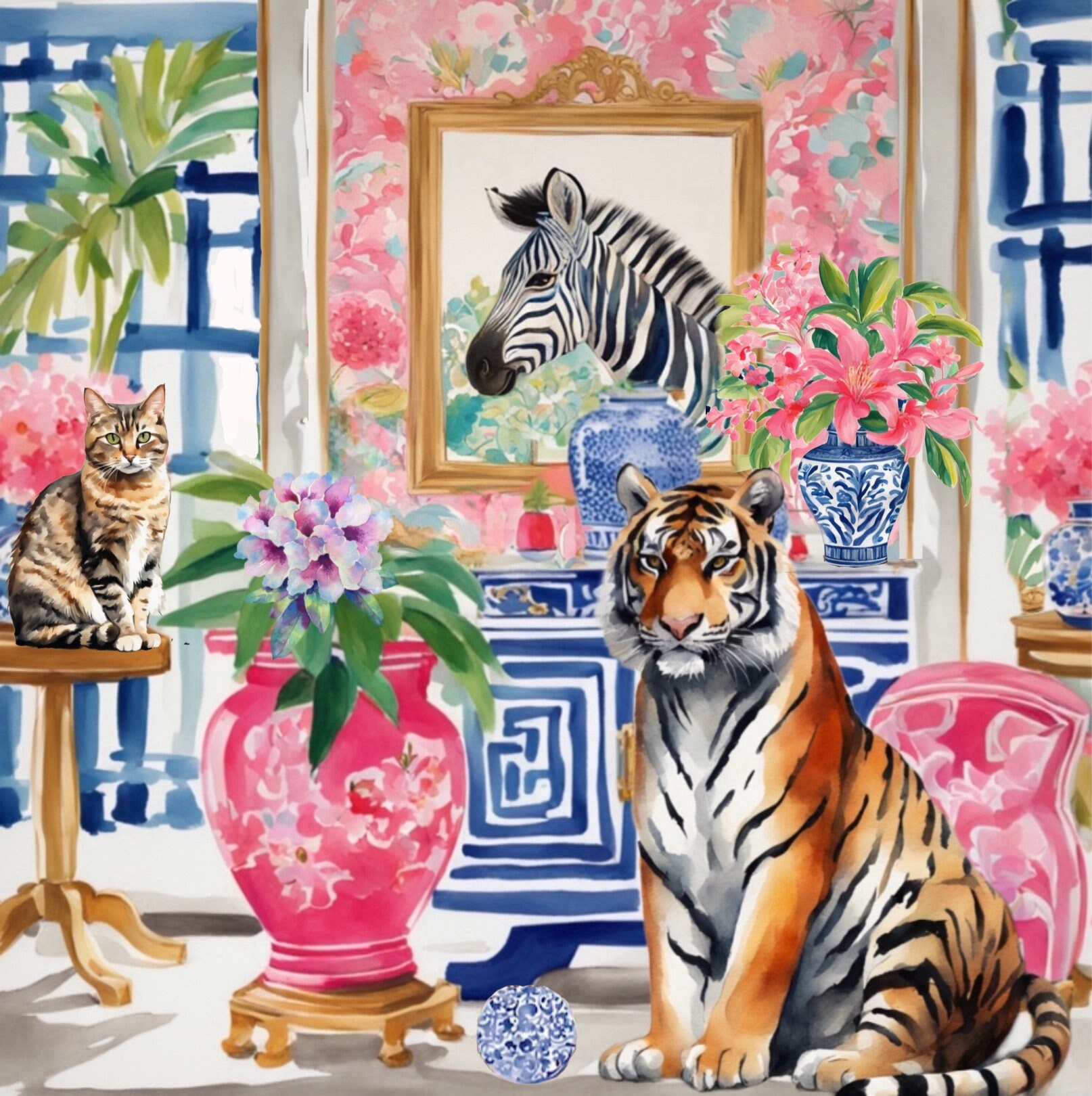 Grandmillennial art, Tiger and tabby cat in chinoiserie interior art print