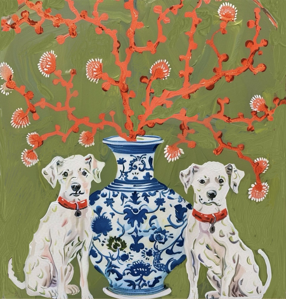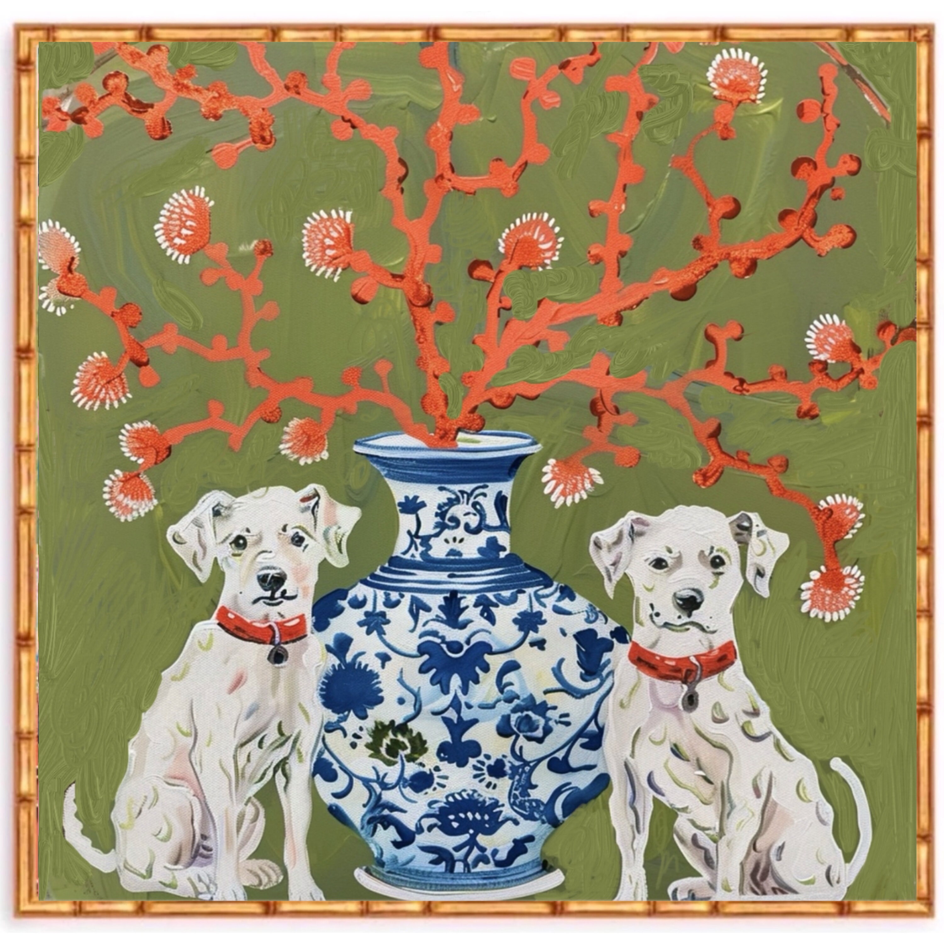 Grandmillennial art, Chinoiserie dogs and coral branch on khaki art print