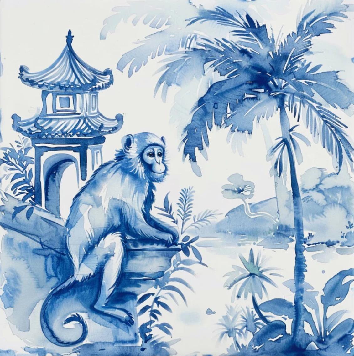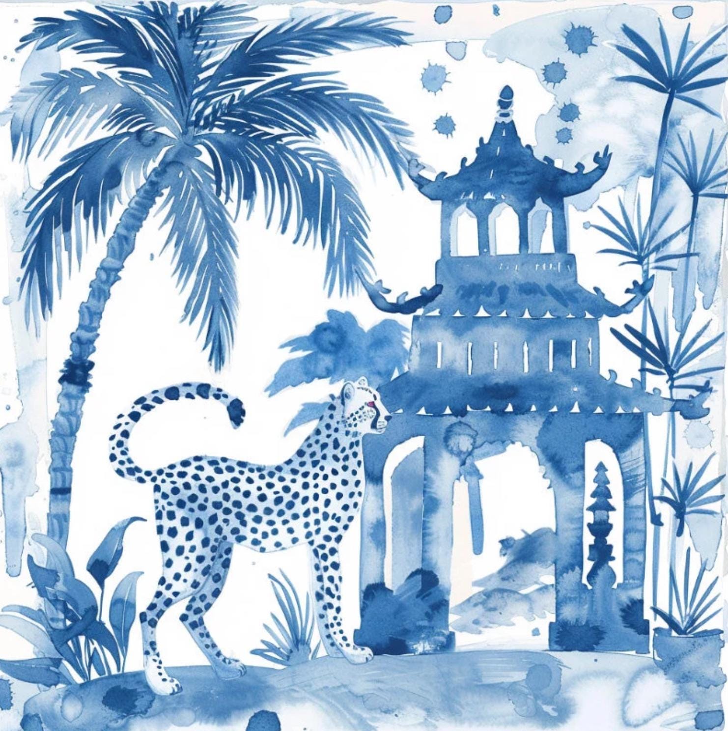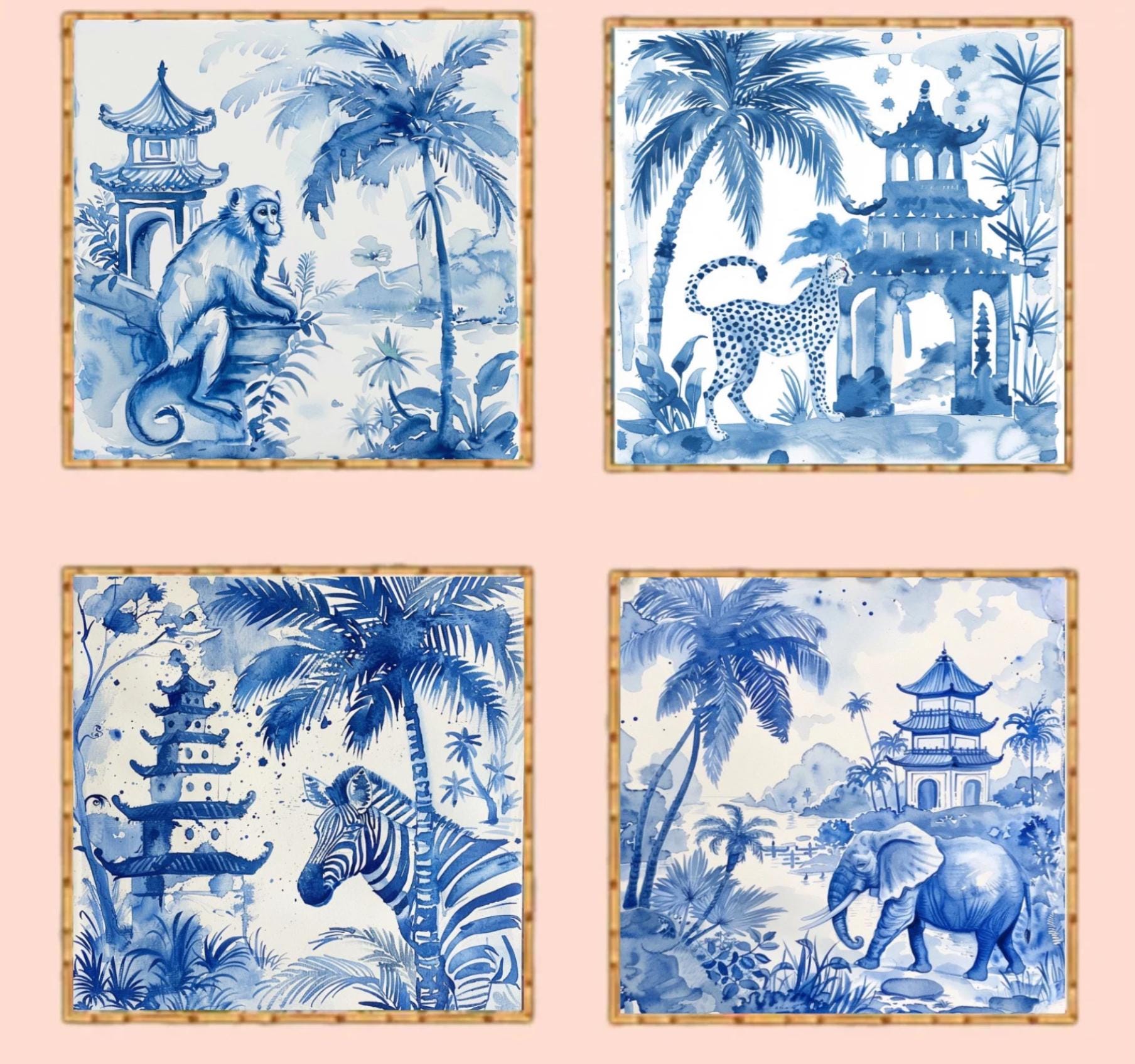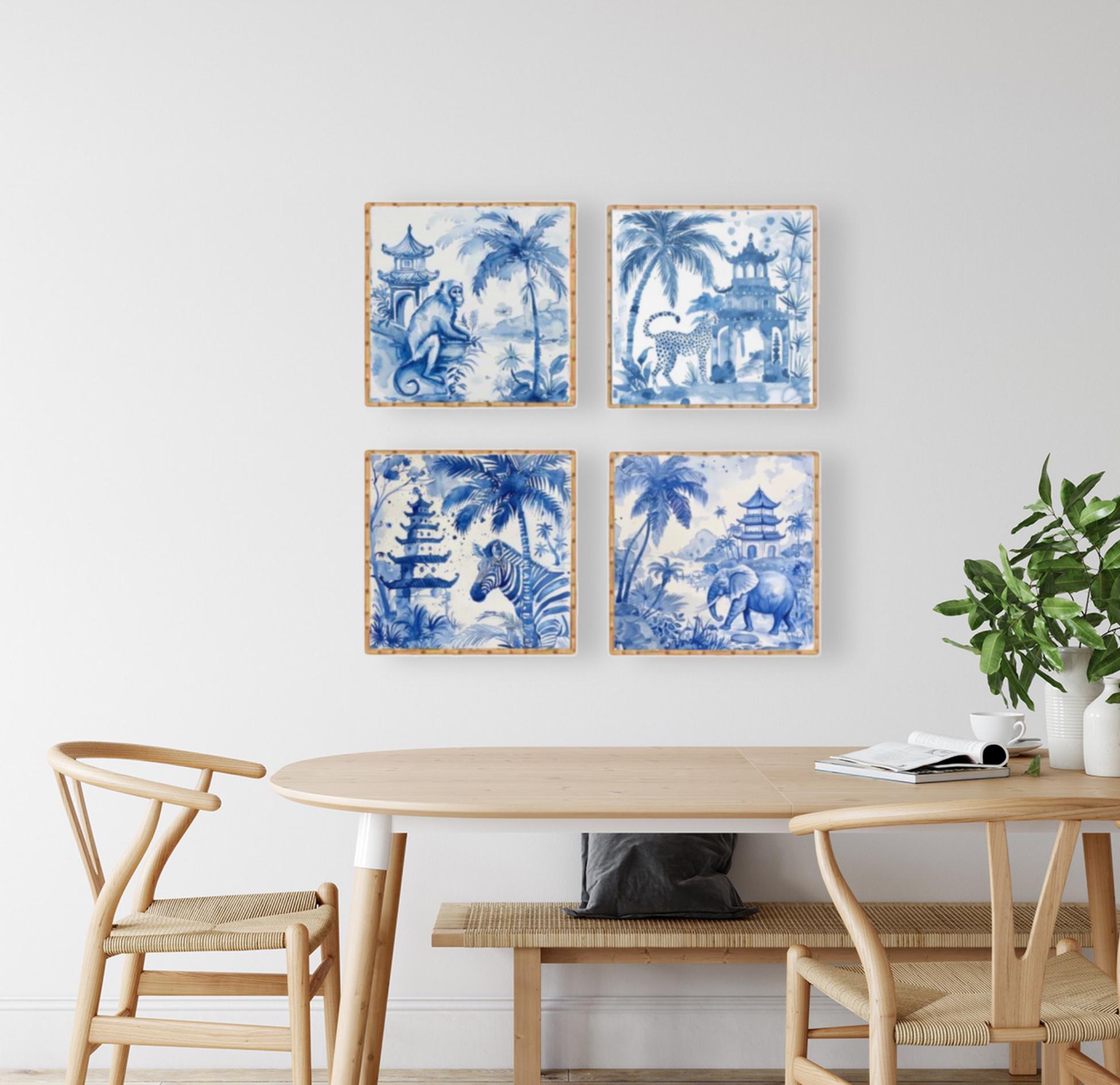 Blue Chinoiserie Animal Prints Set: Pagoda Garden Watercolor Art