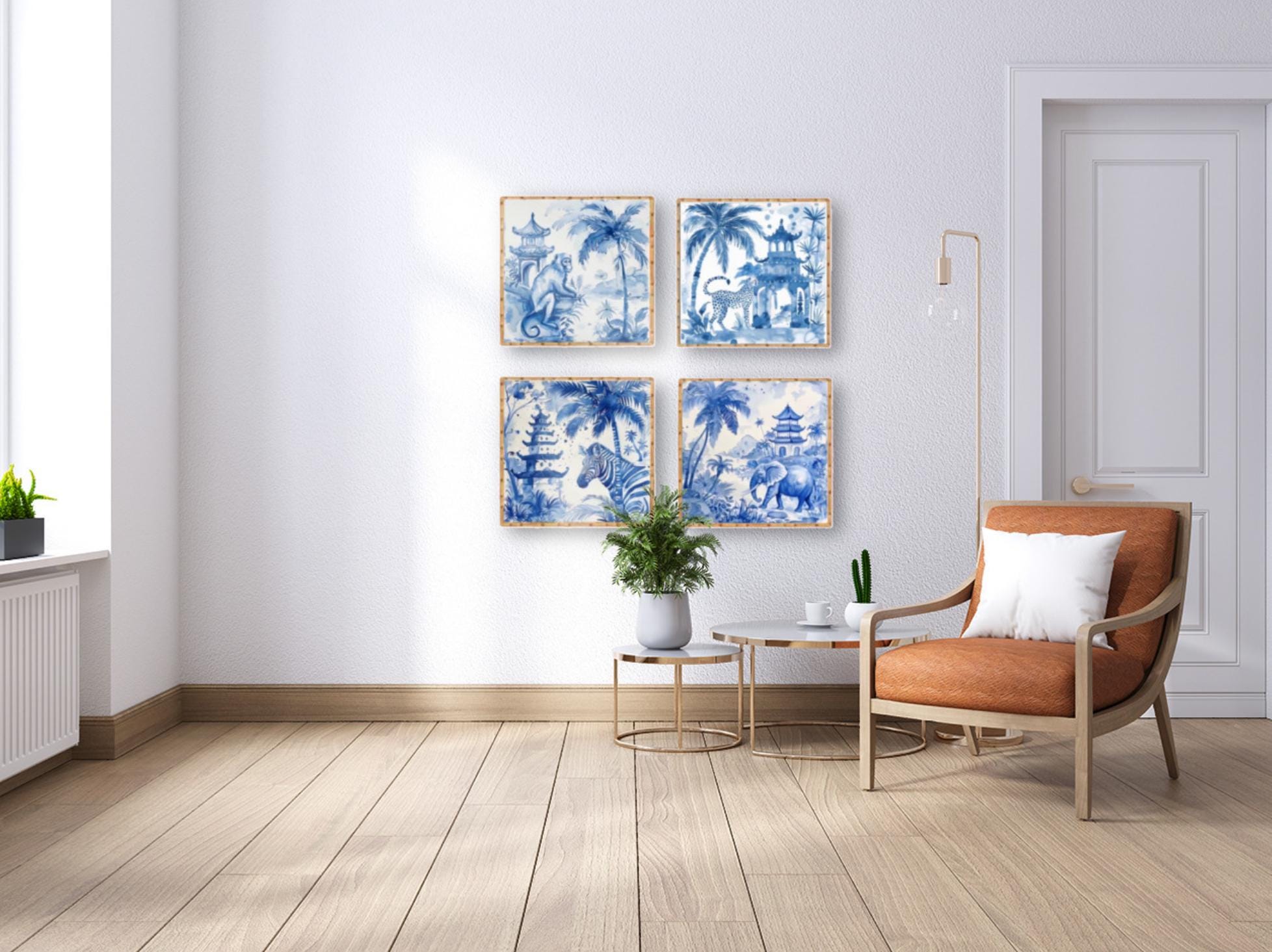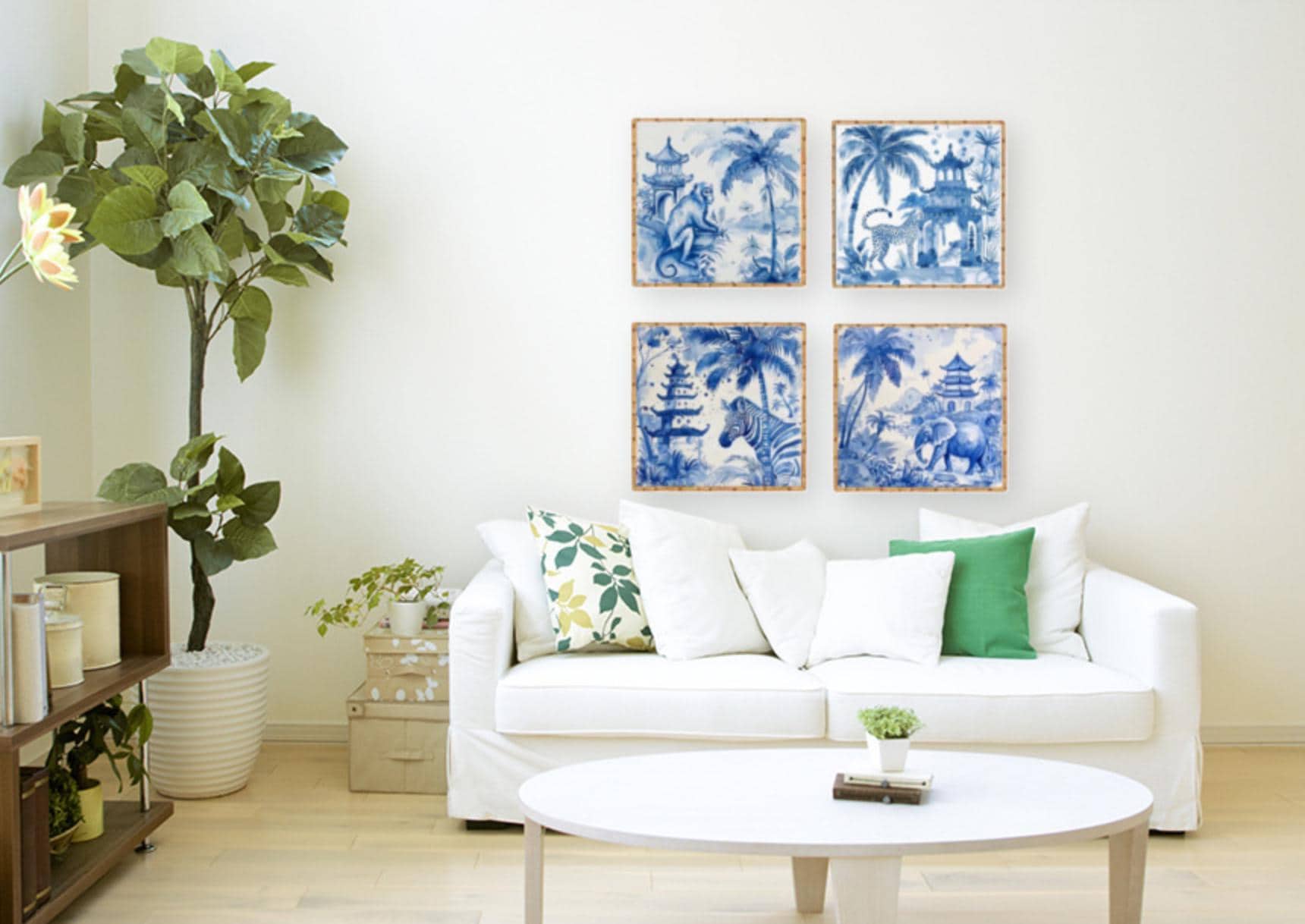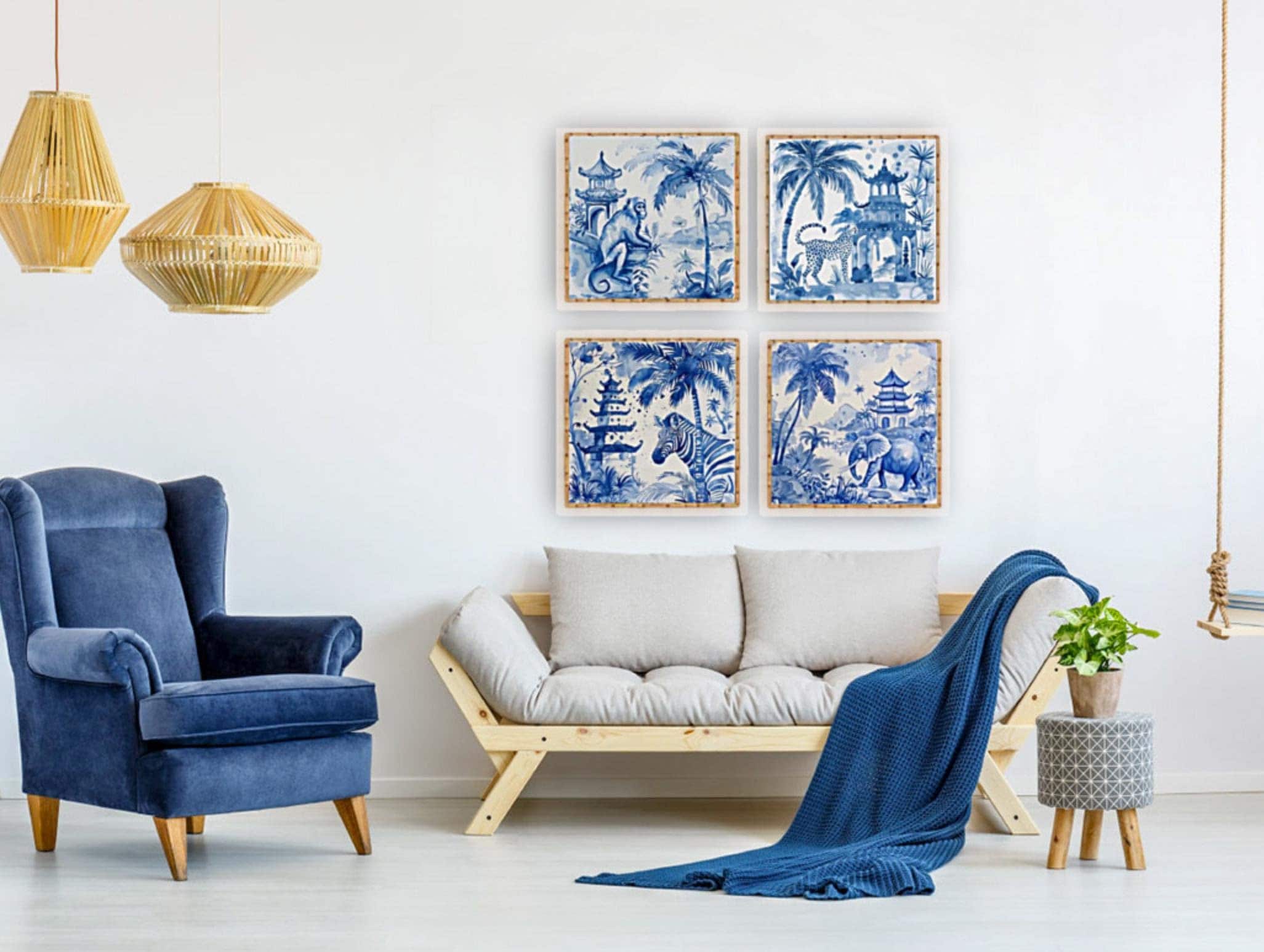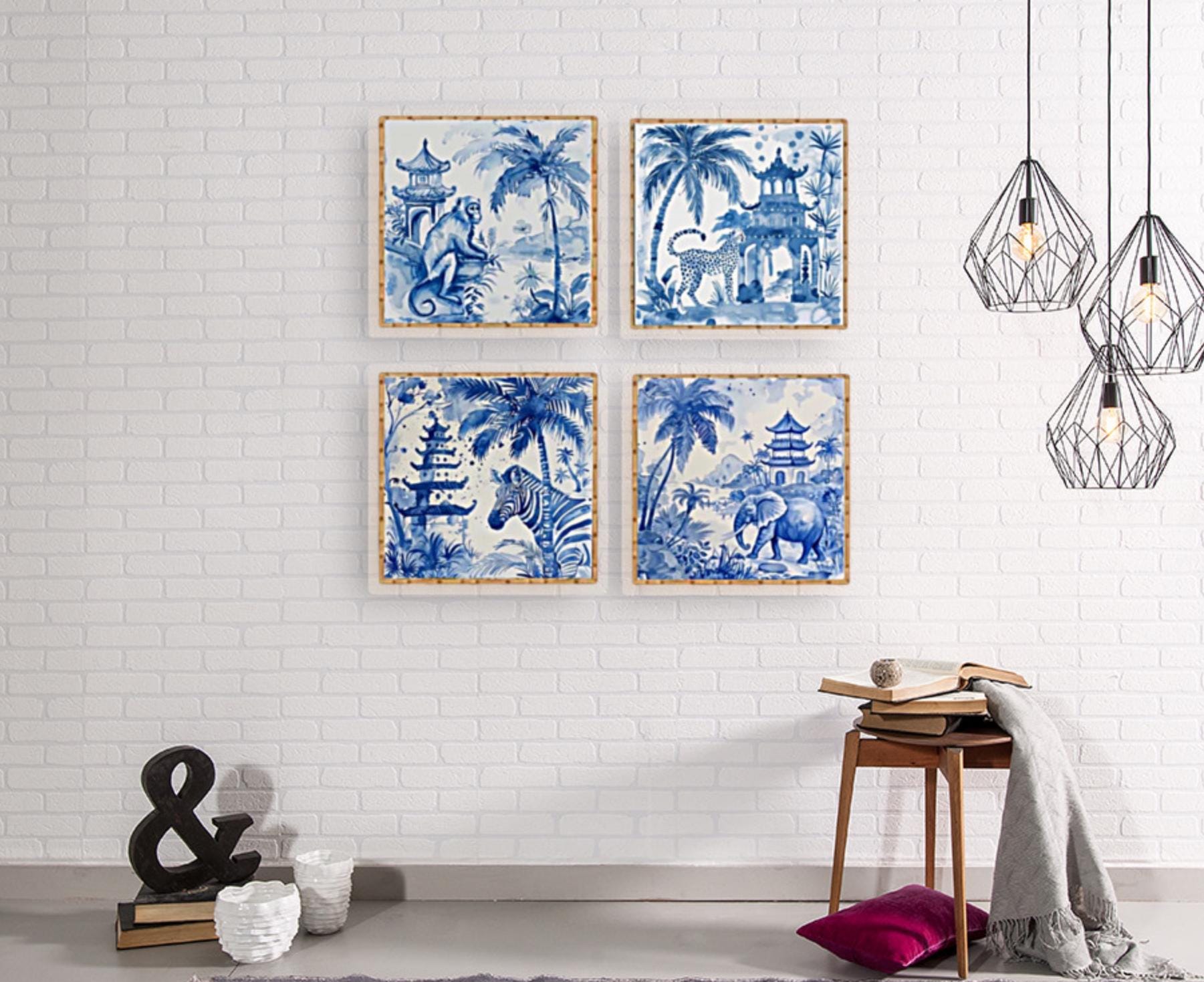 Blue Chinoiserie Animal Prints Set: Pagoda Garden Watercolor Art