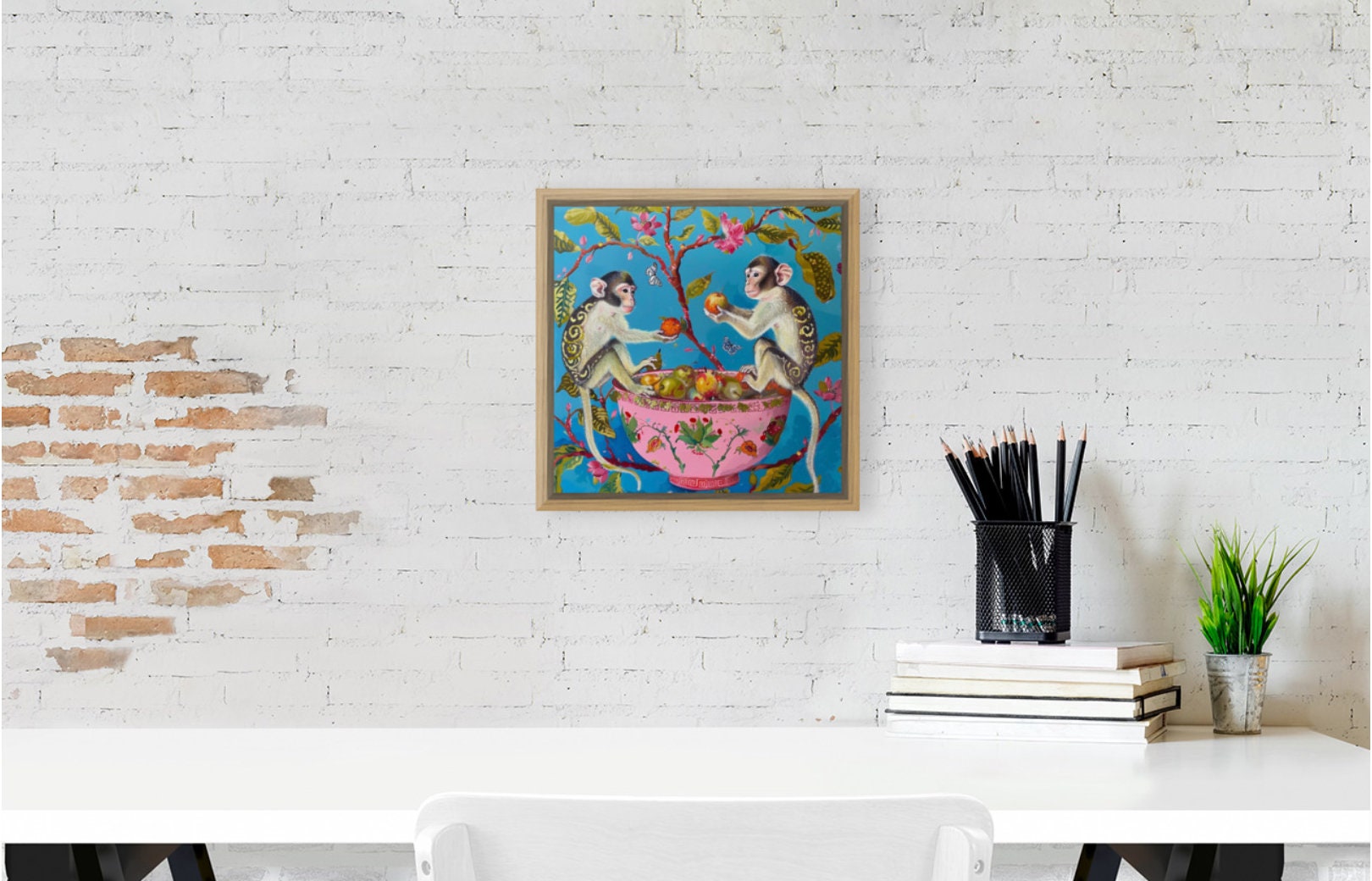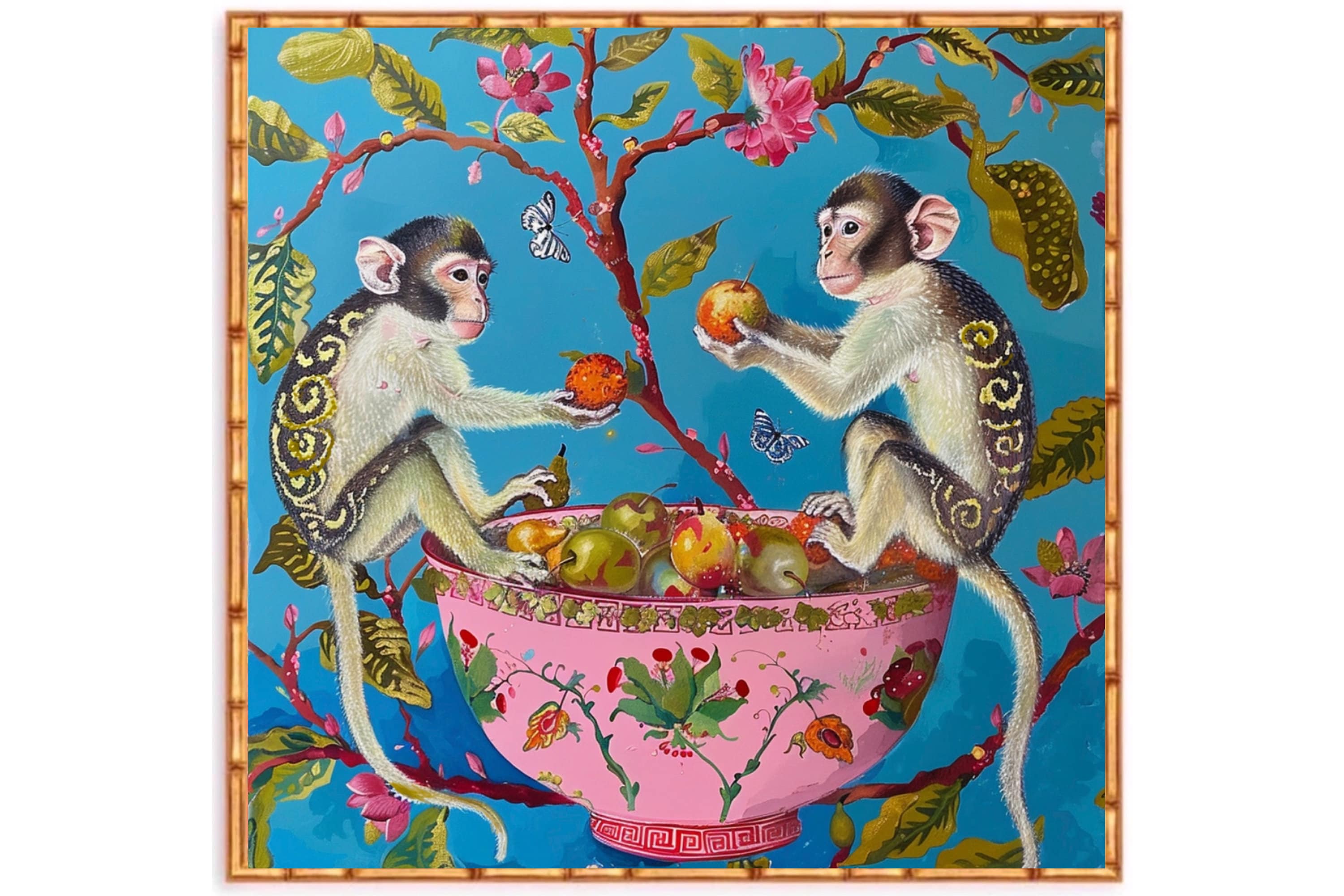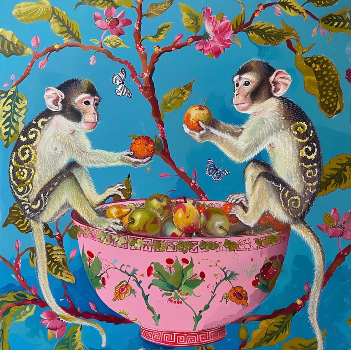 Grandmillennial art, Monkeys playing with fruits chinoiserie art print
