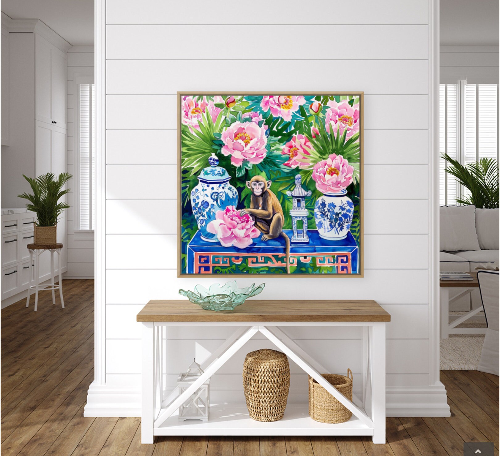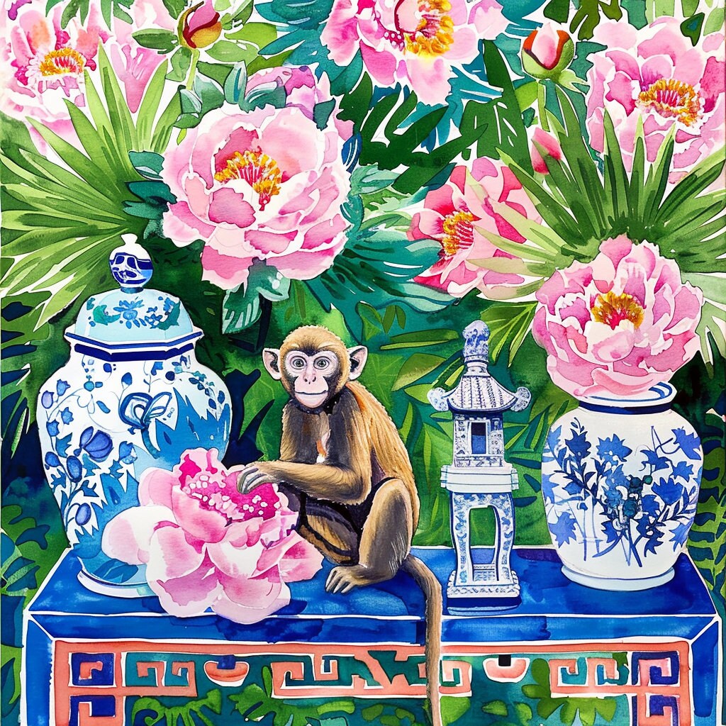 Chinoiserie Monkey Watercolor Painting: Peonies and Birds Art