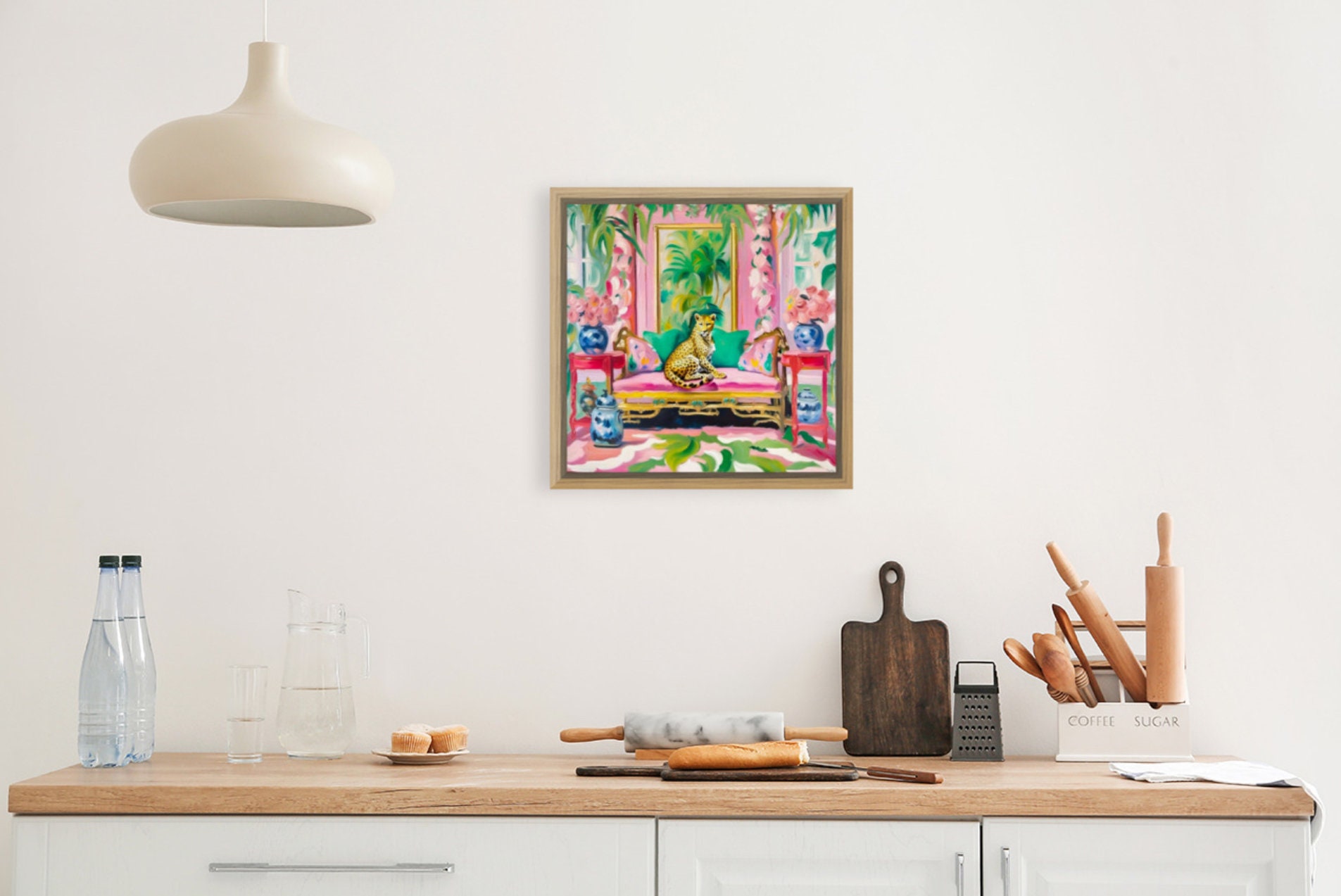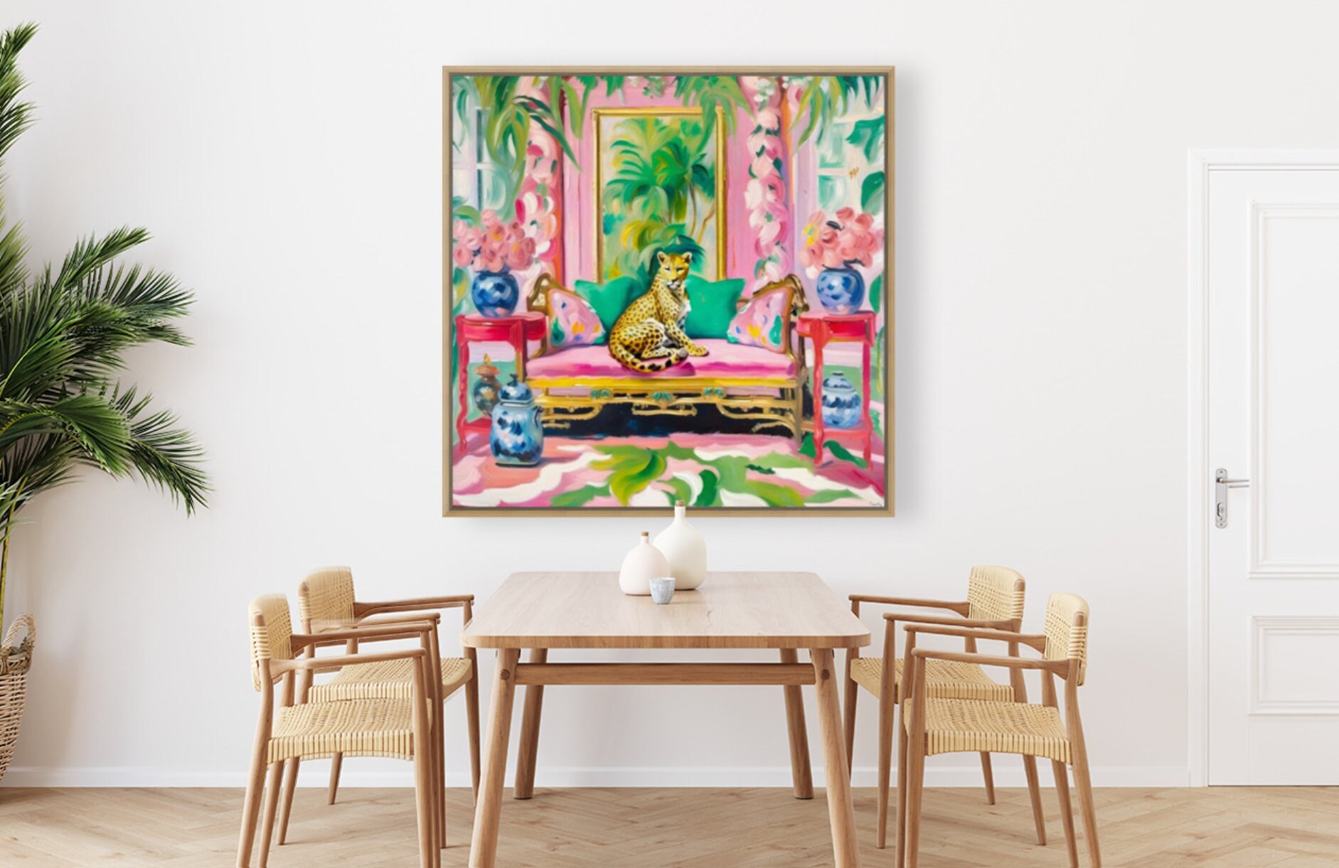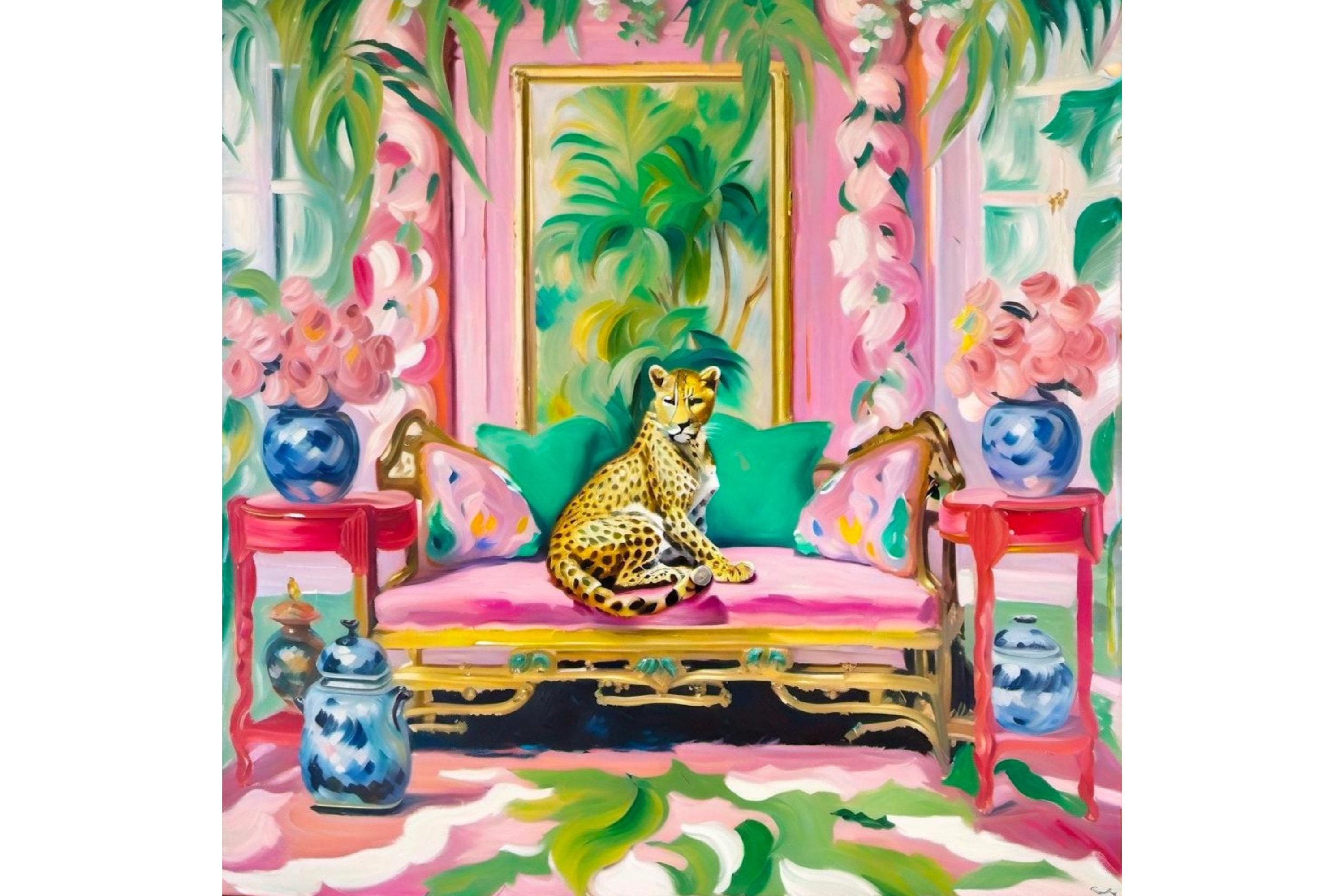 Grandmillennial art, Cheetah and pink flamingo in preppy chinoiserie interior, whimsical watercolor