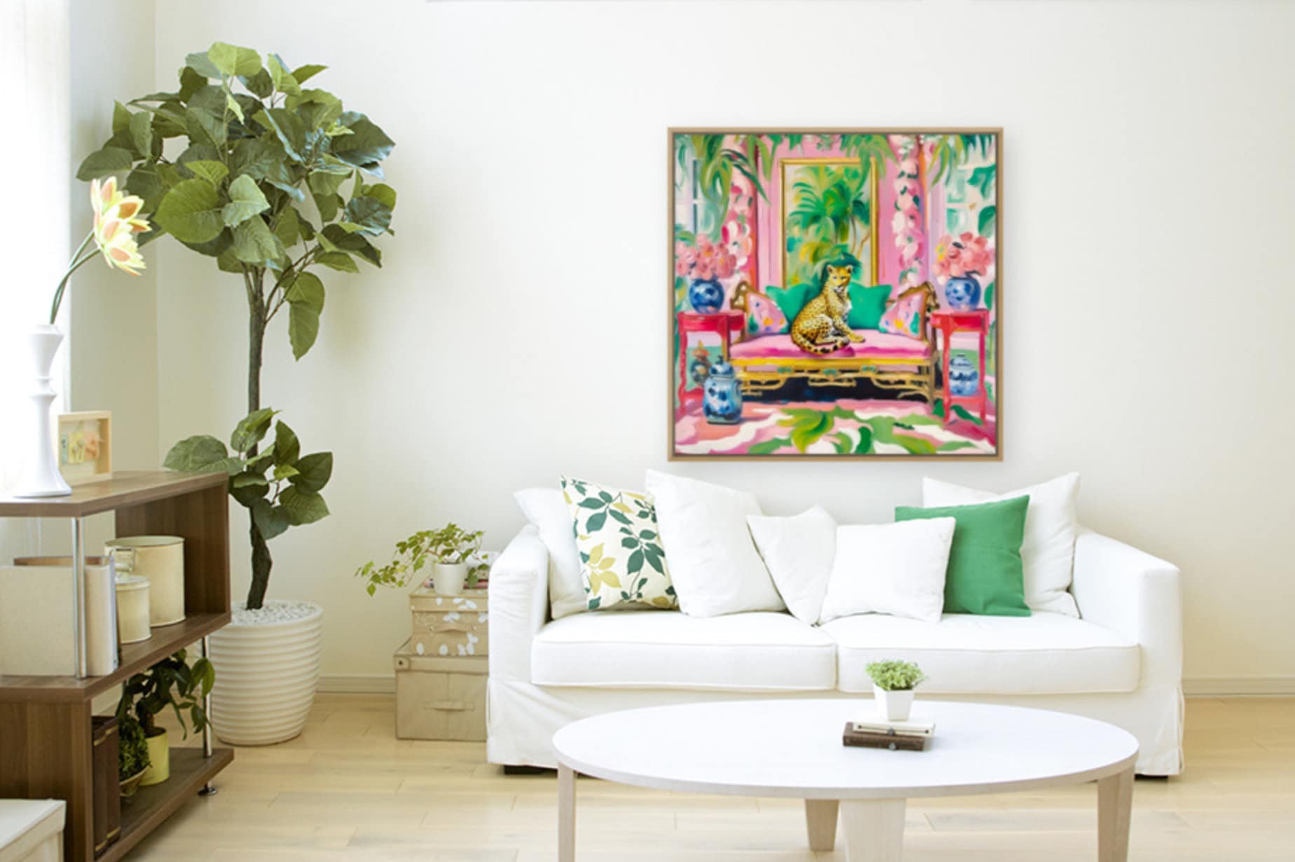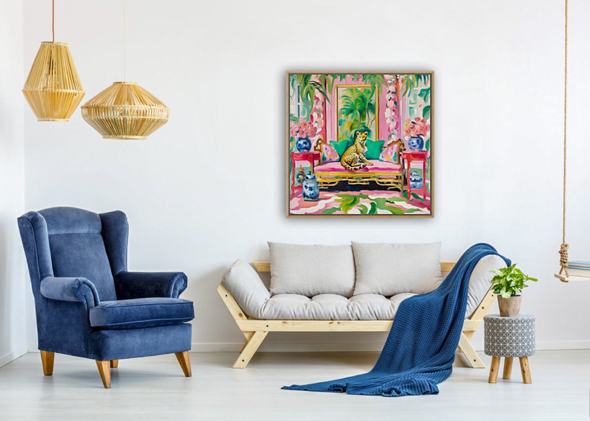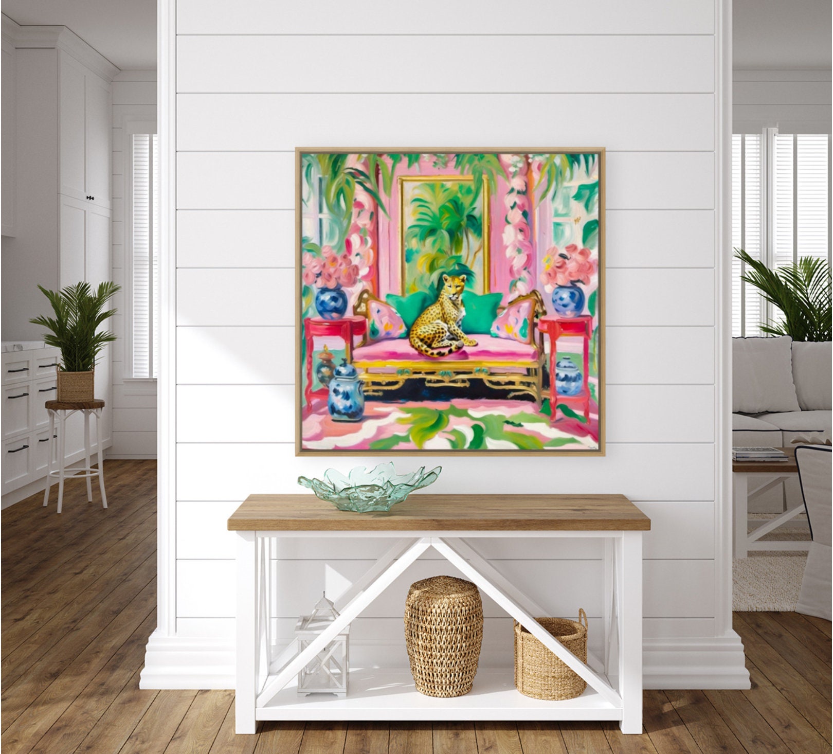 Grandmillennial art, Cheetah and pink flamingo in preppy chinoiserie interior, whimsical watercolor