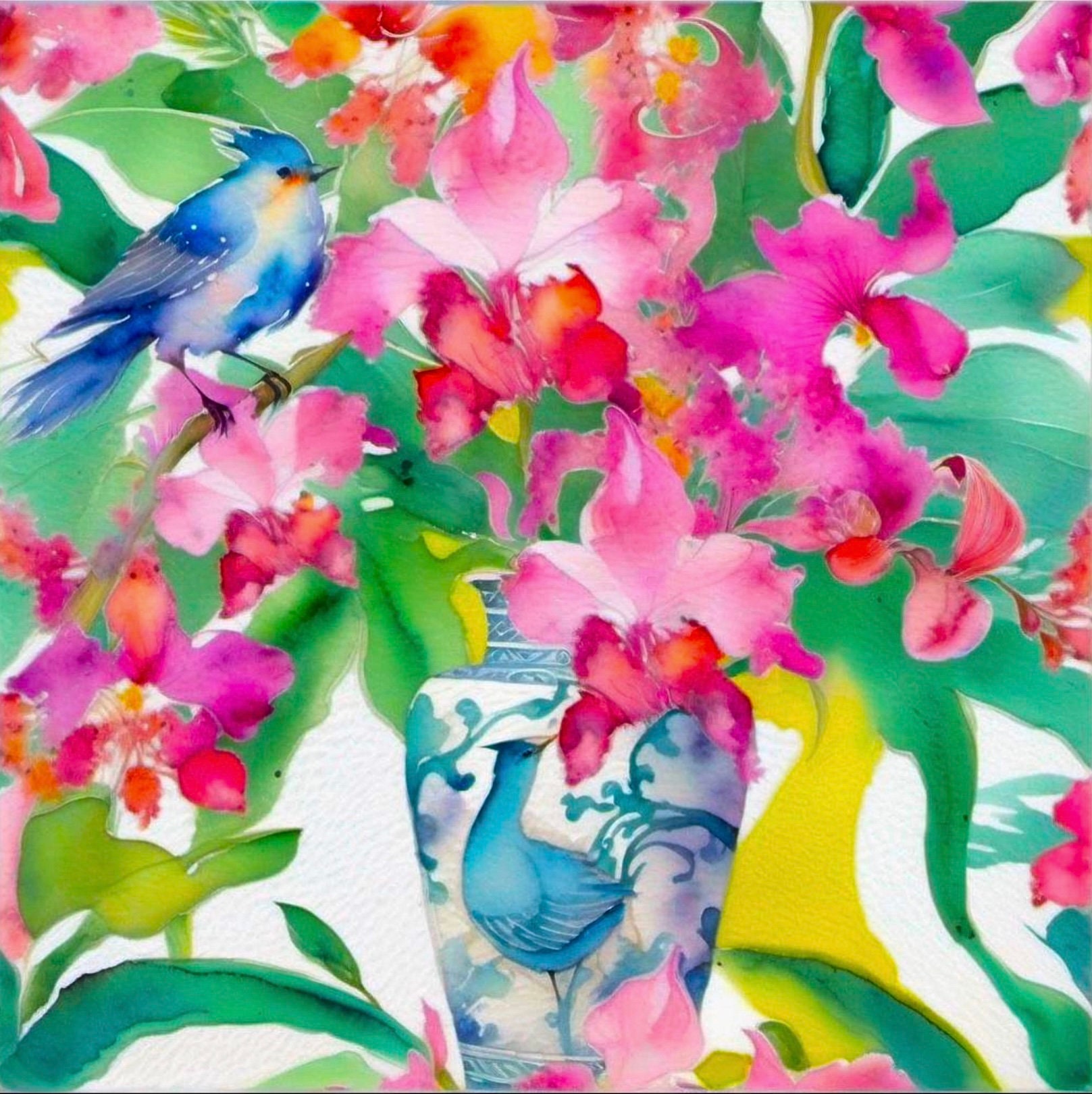 Orchids and Bluebirds Watercolor Painting: Chinoiserie Art Print