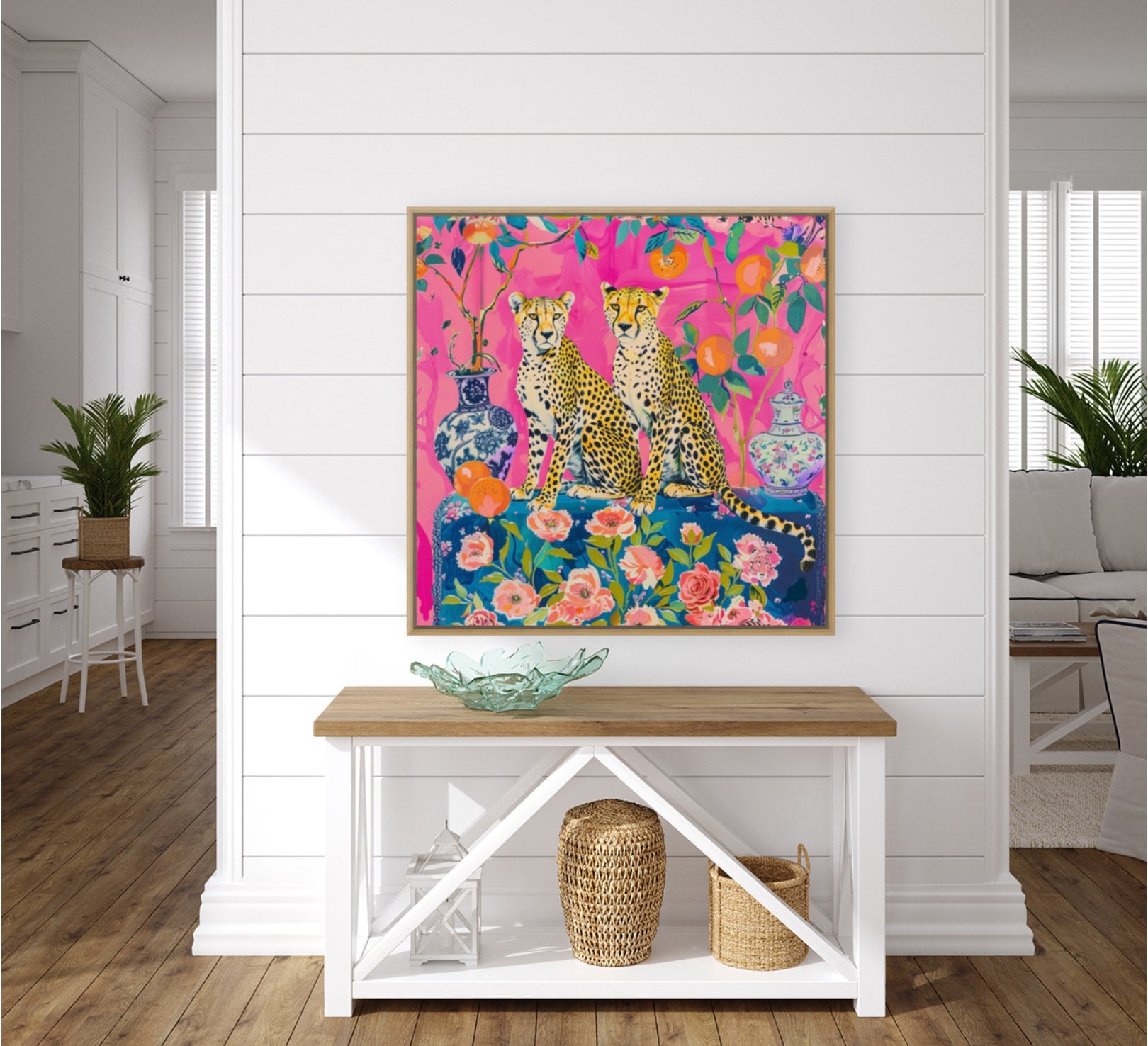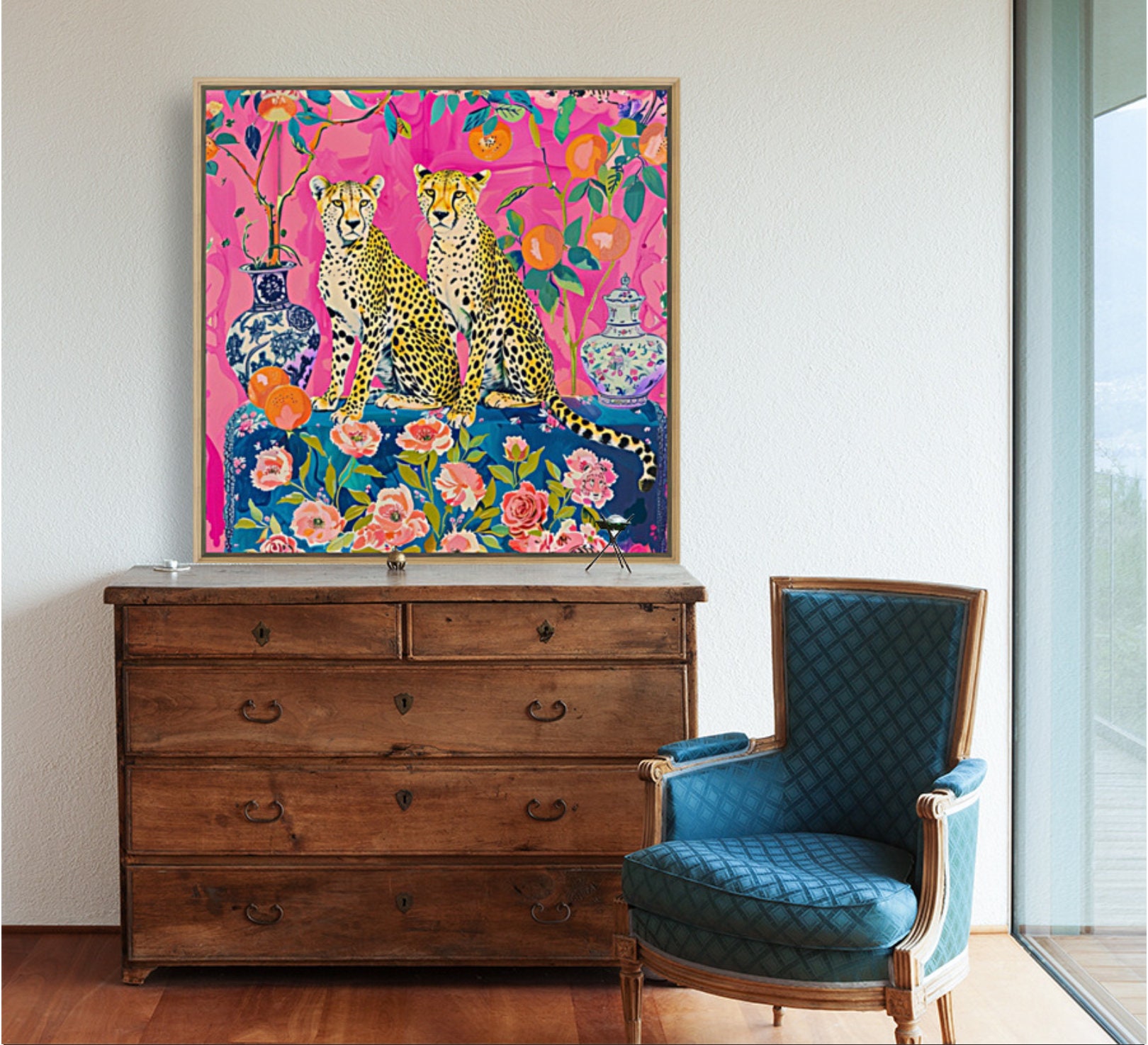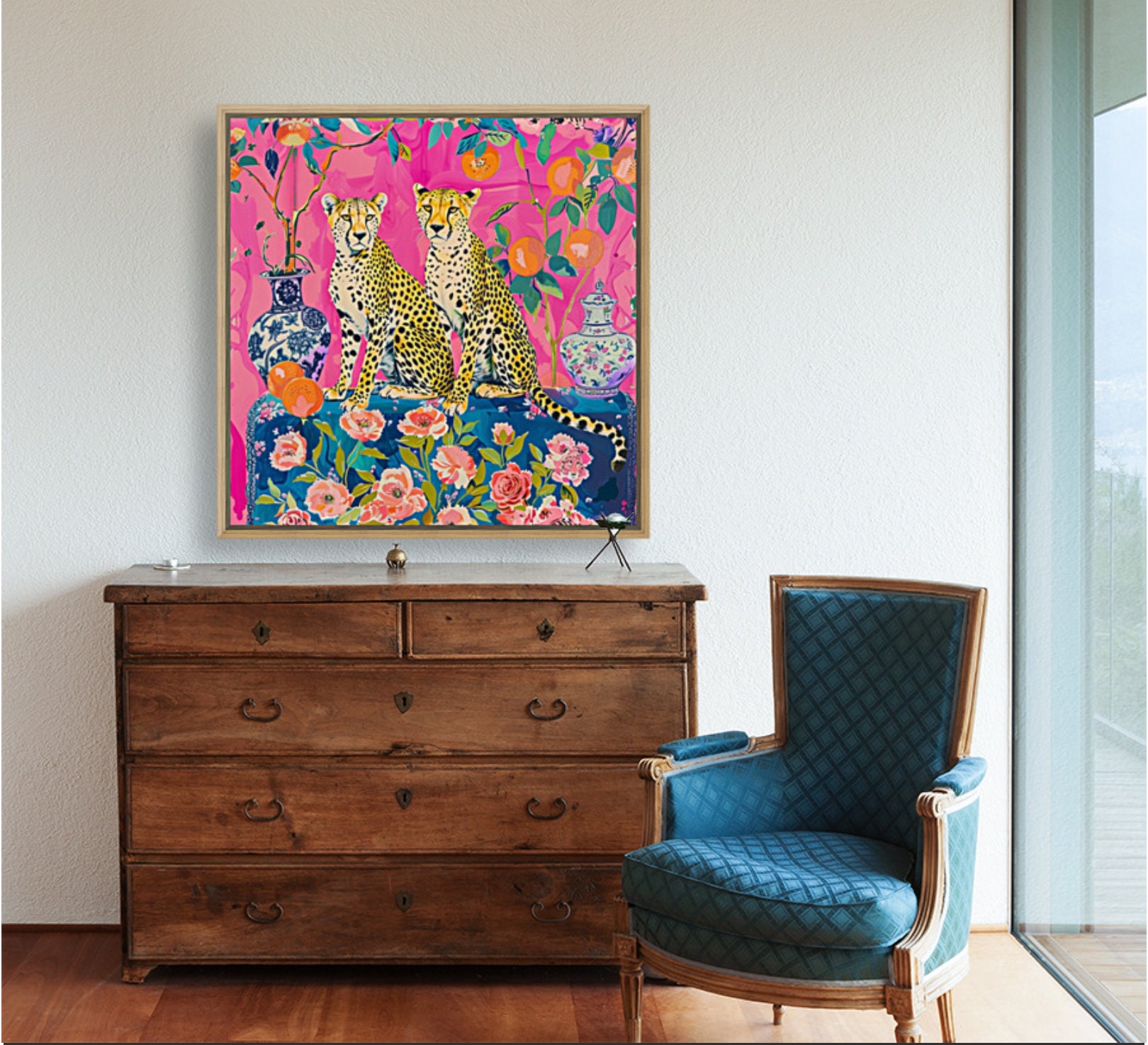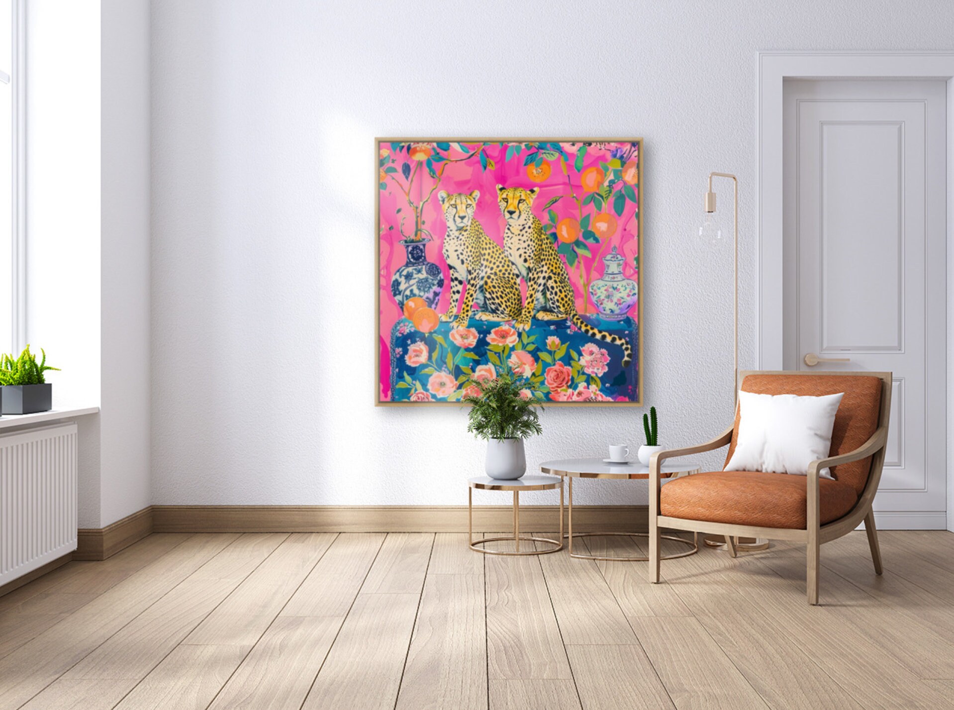 Preppy Cheetahs and ginger jar in pink chinoiserie interior, whimsical painting