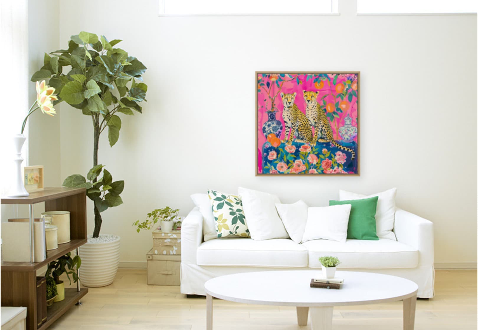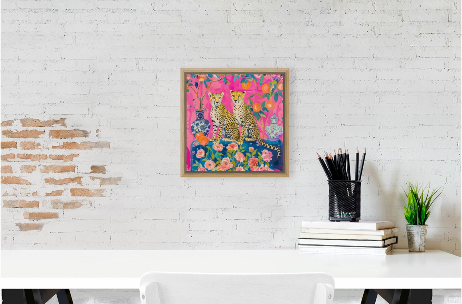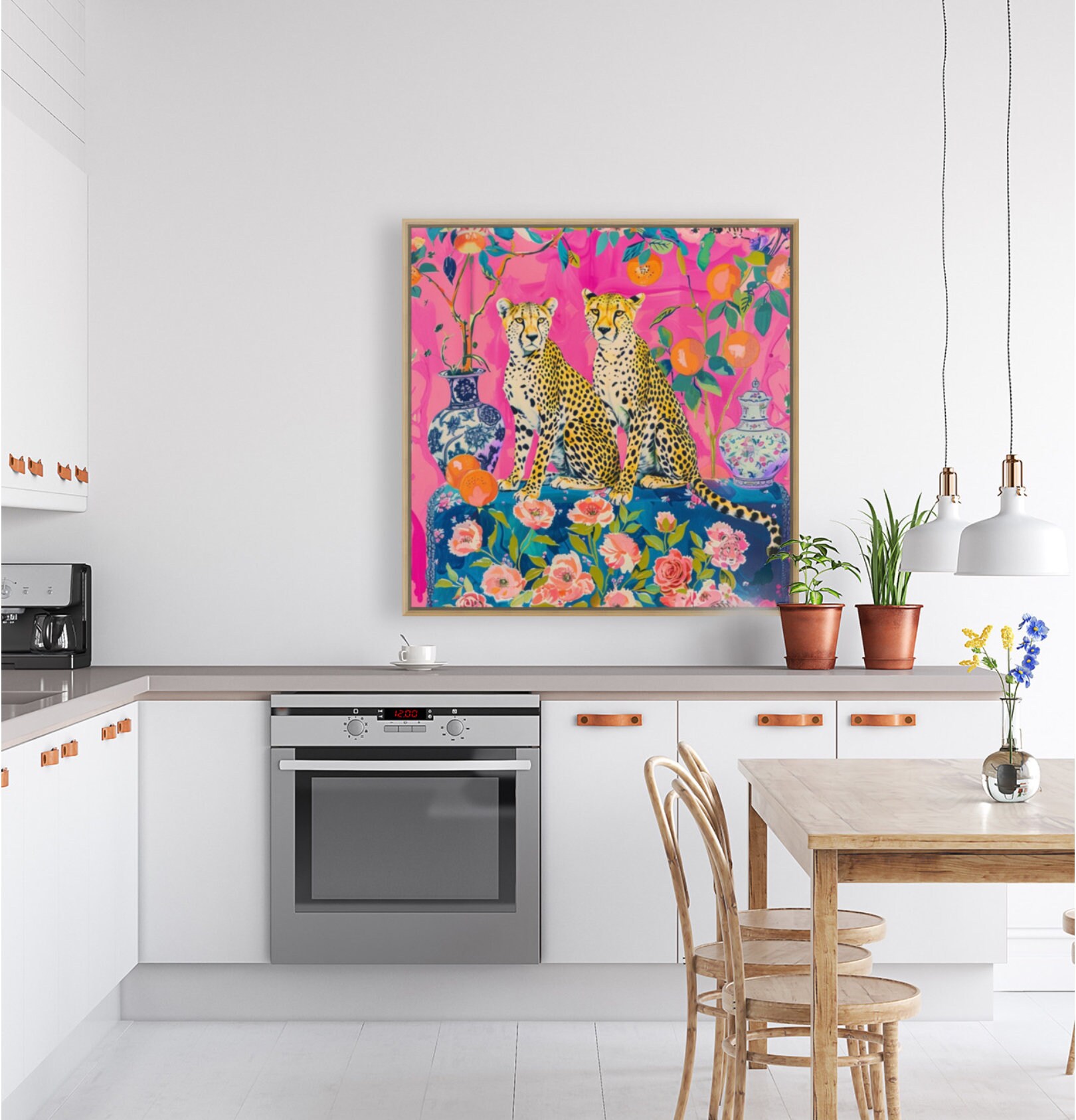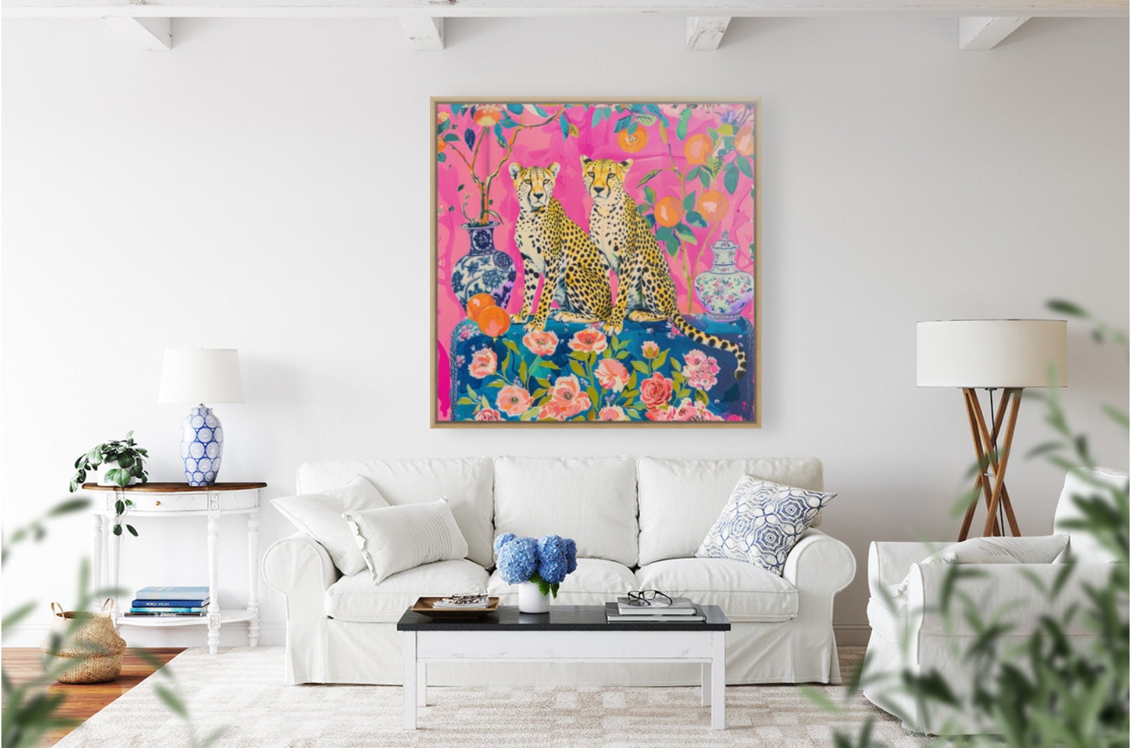 Preppy Cheetahs and ginger jar in pink chinoiserie interior, whimsical painting