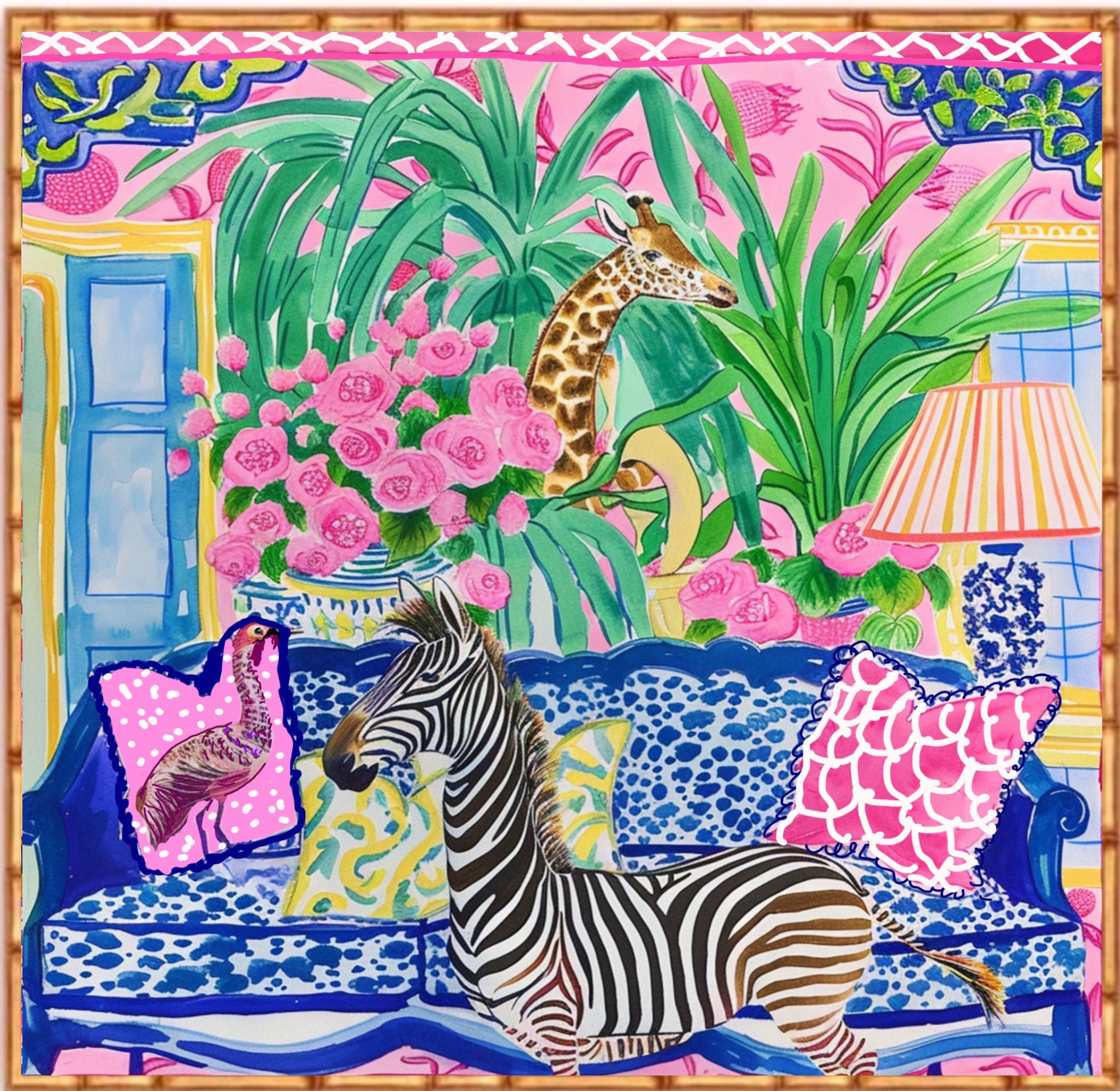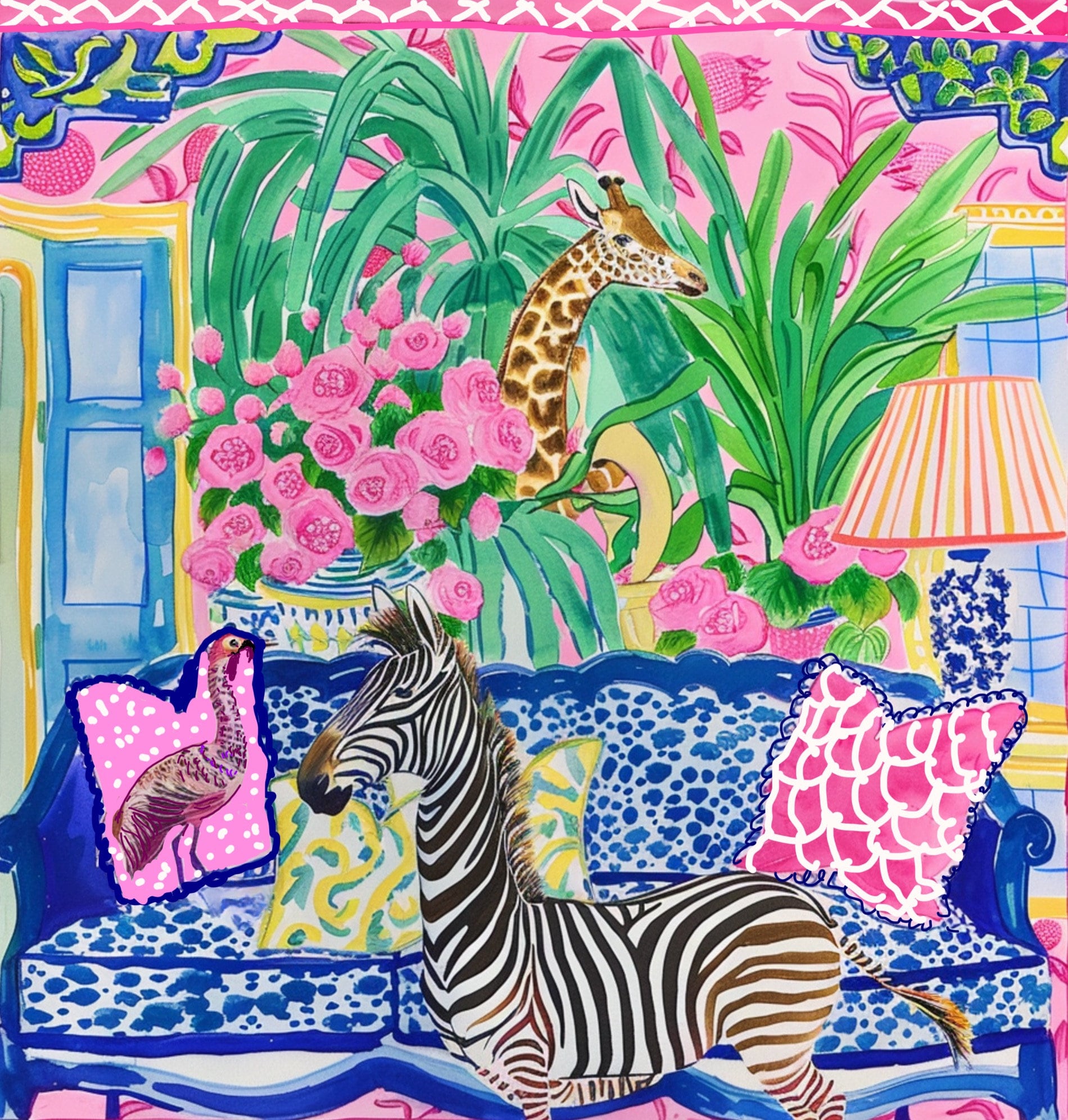 Grandmillennial art, Zebra and Giraffe in preppy chinoiserie interior, whimsical watercolor