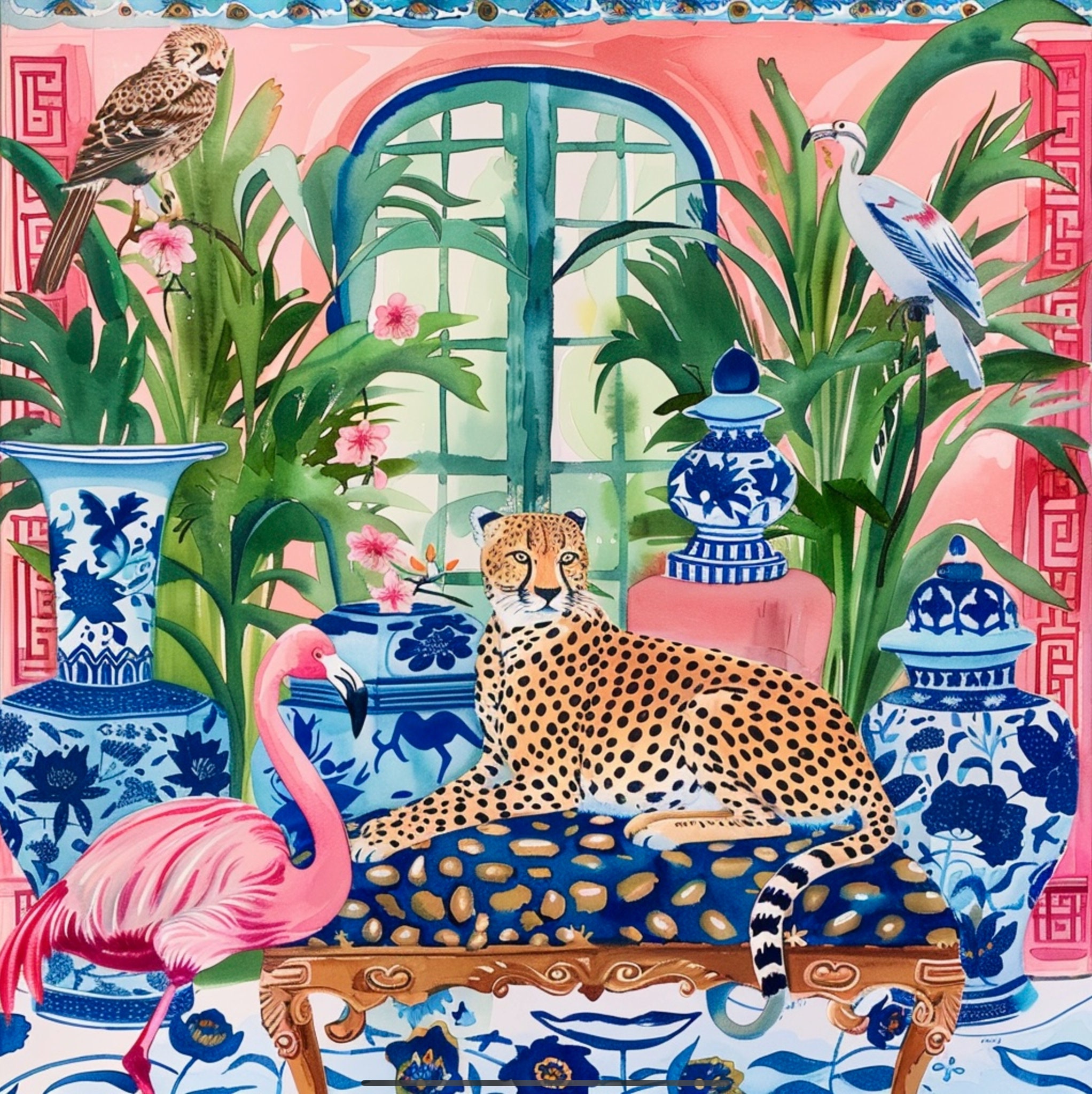 Grandmillennial art, Cheetah and birds in preppy chinoiserie interior, whimsical watercolor