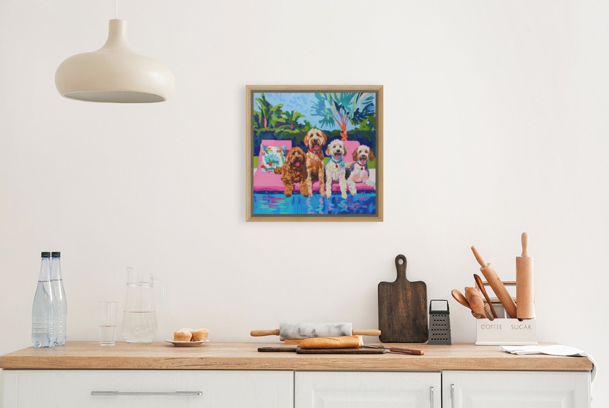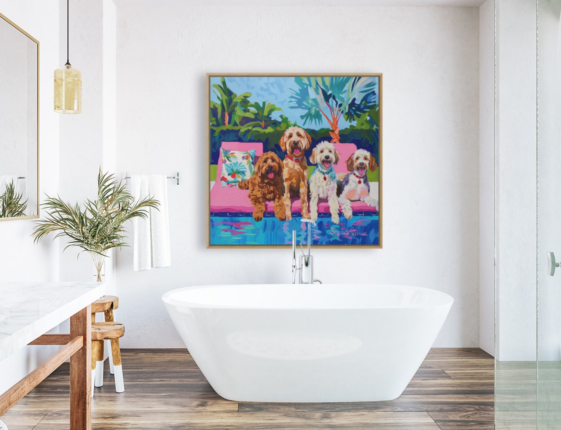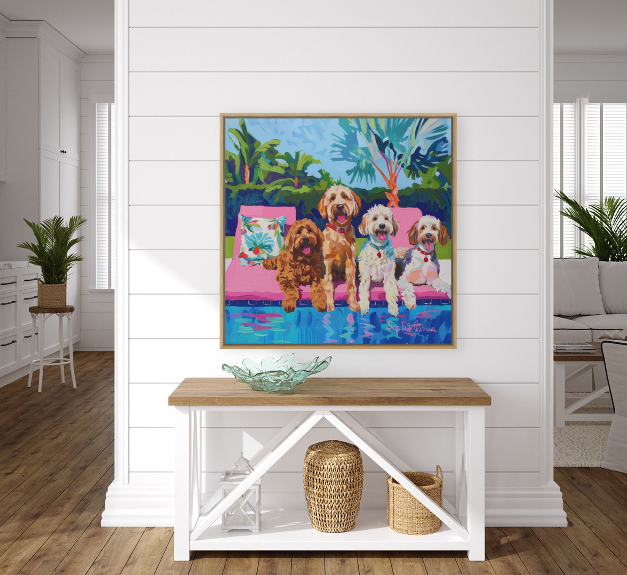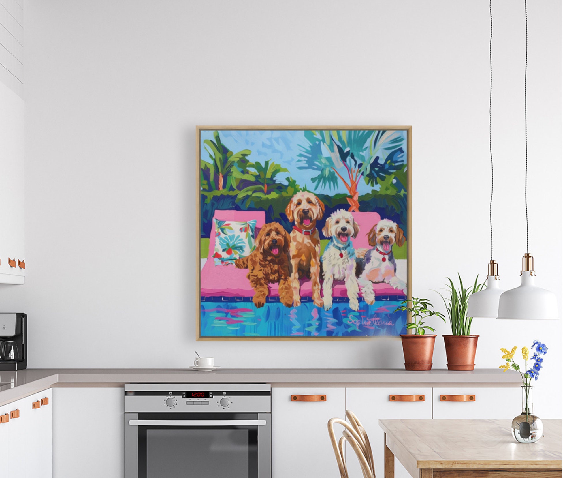 Grandmillennial art, Dogs at the swimming pool, whimsical fine art