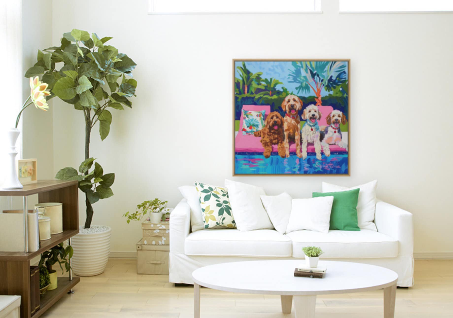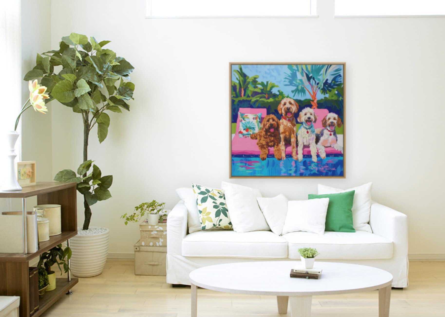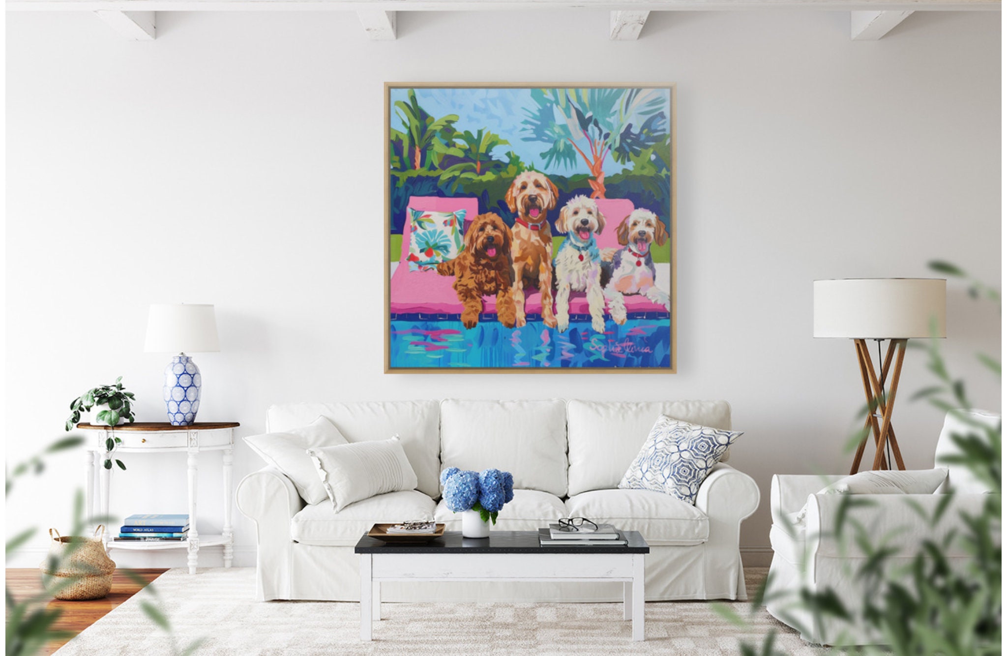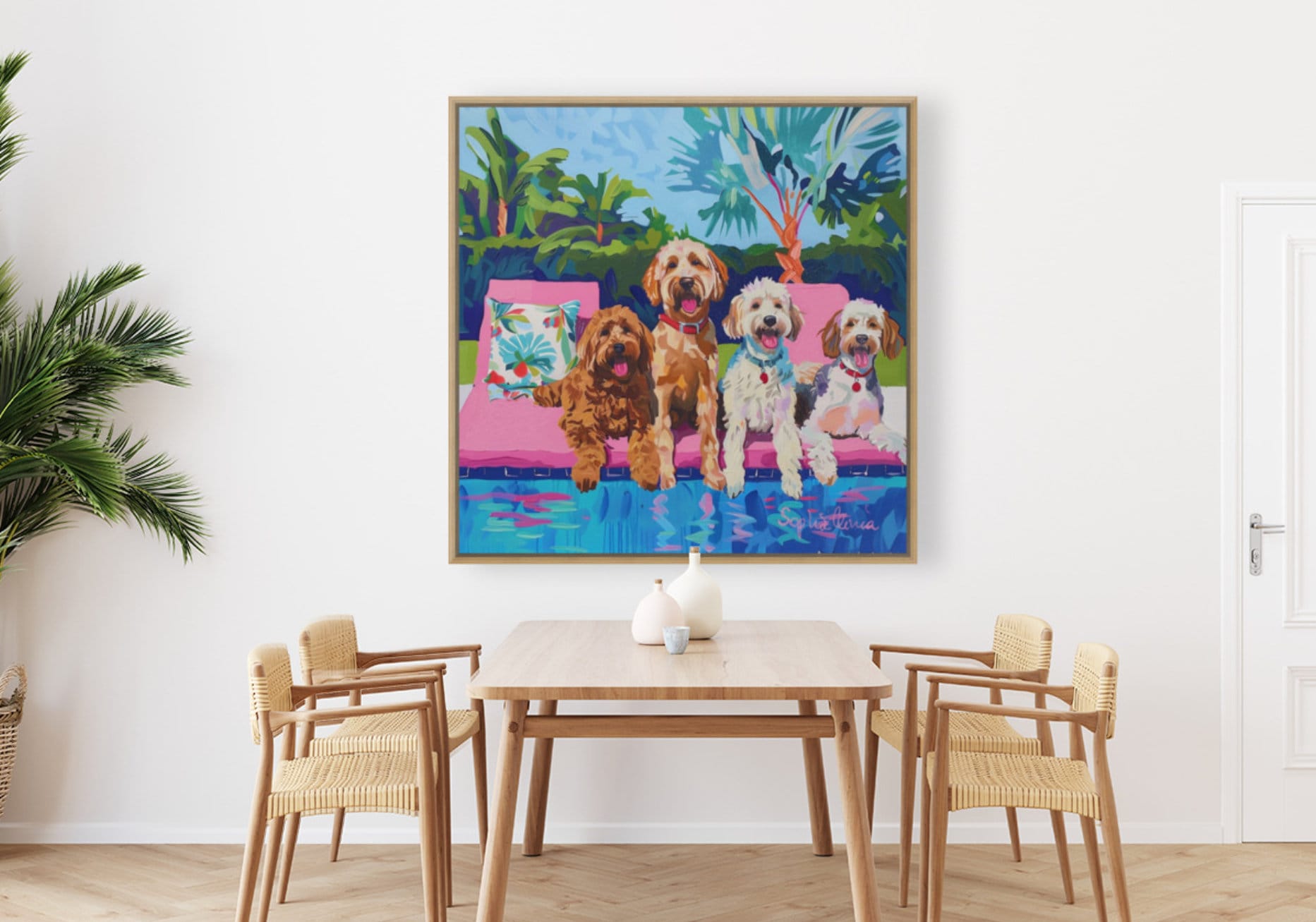 Grandmillennial art, Dogs at the swimming pool, whimsical fine art