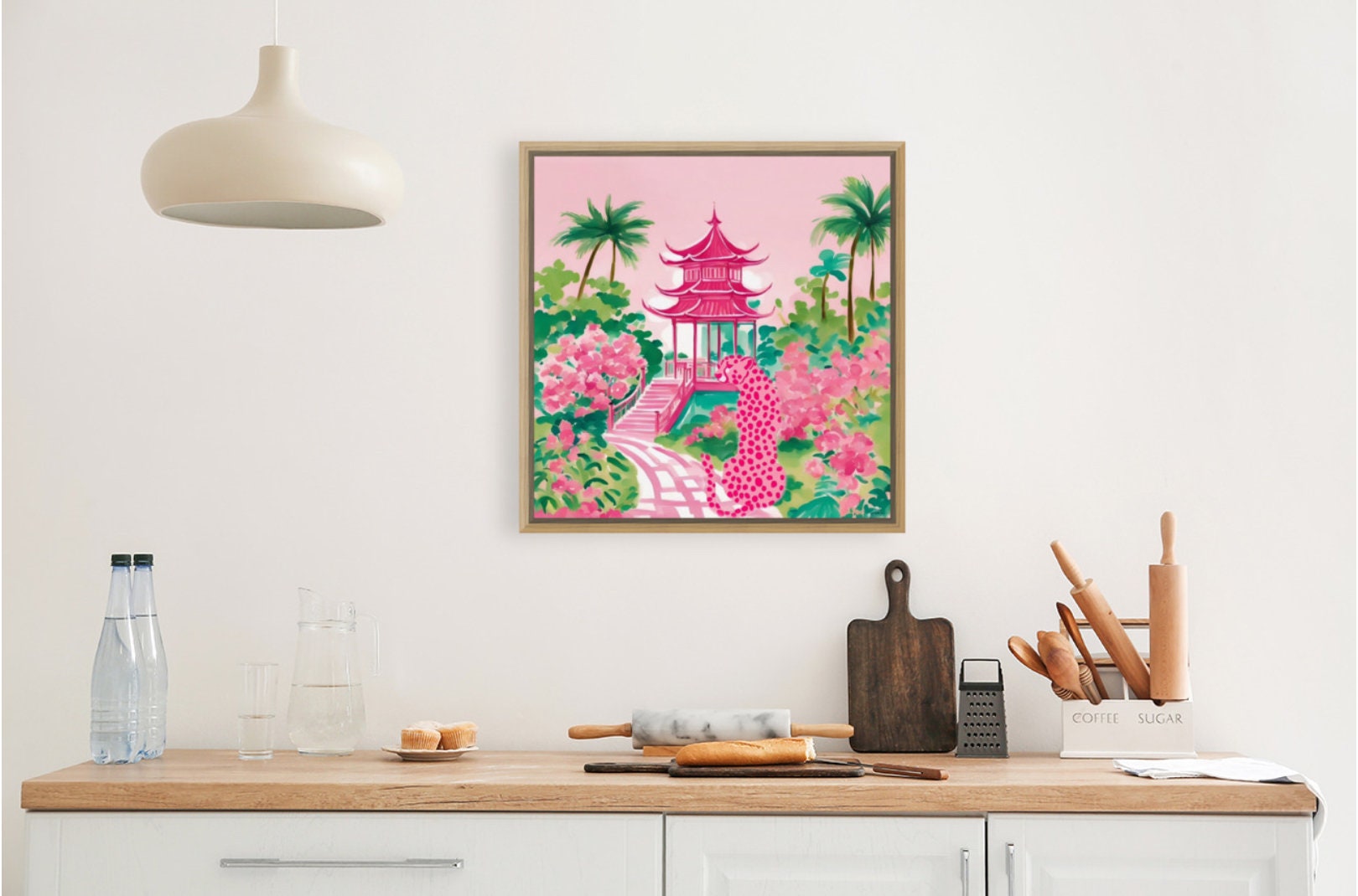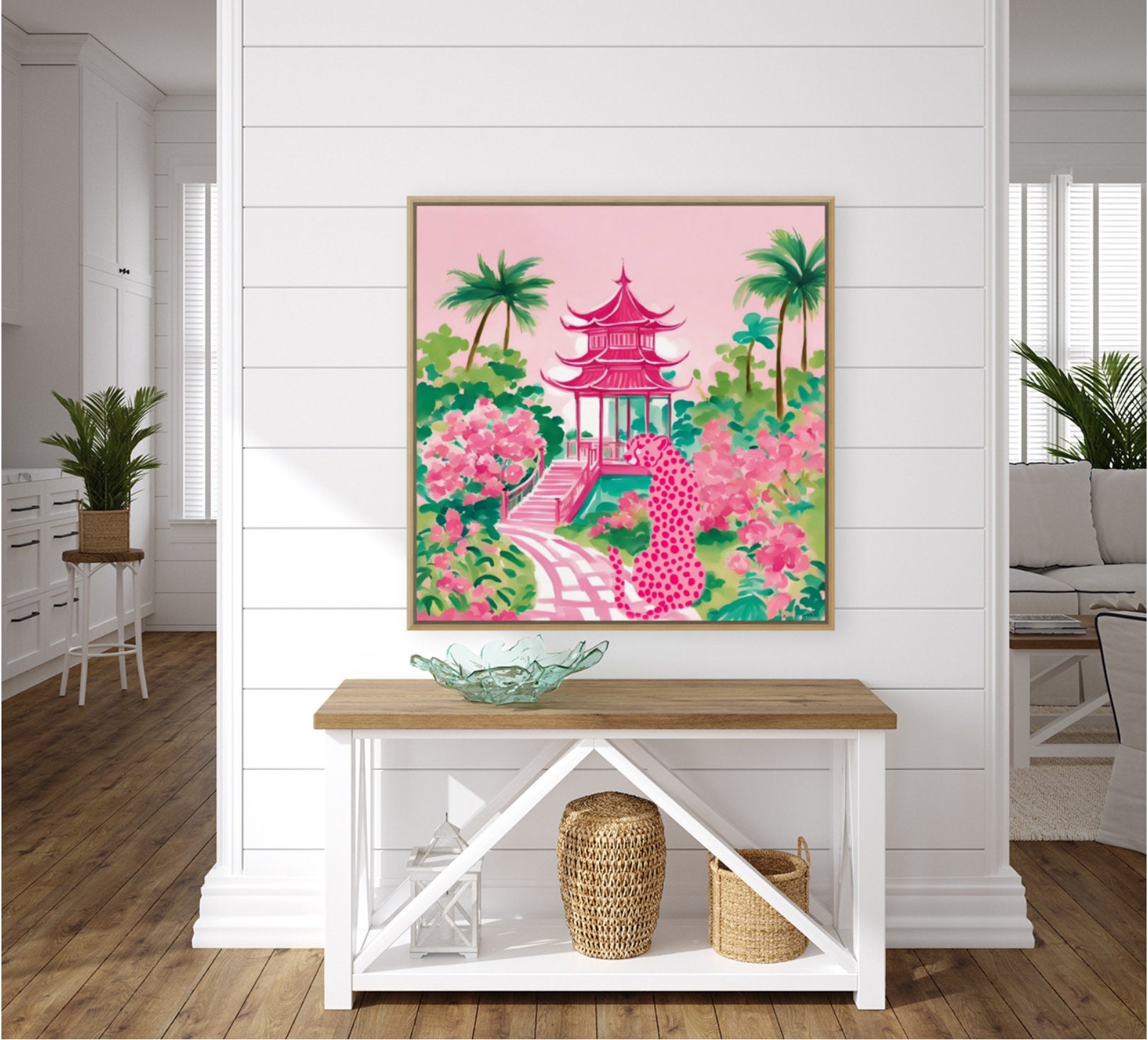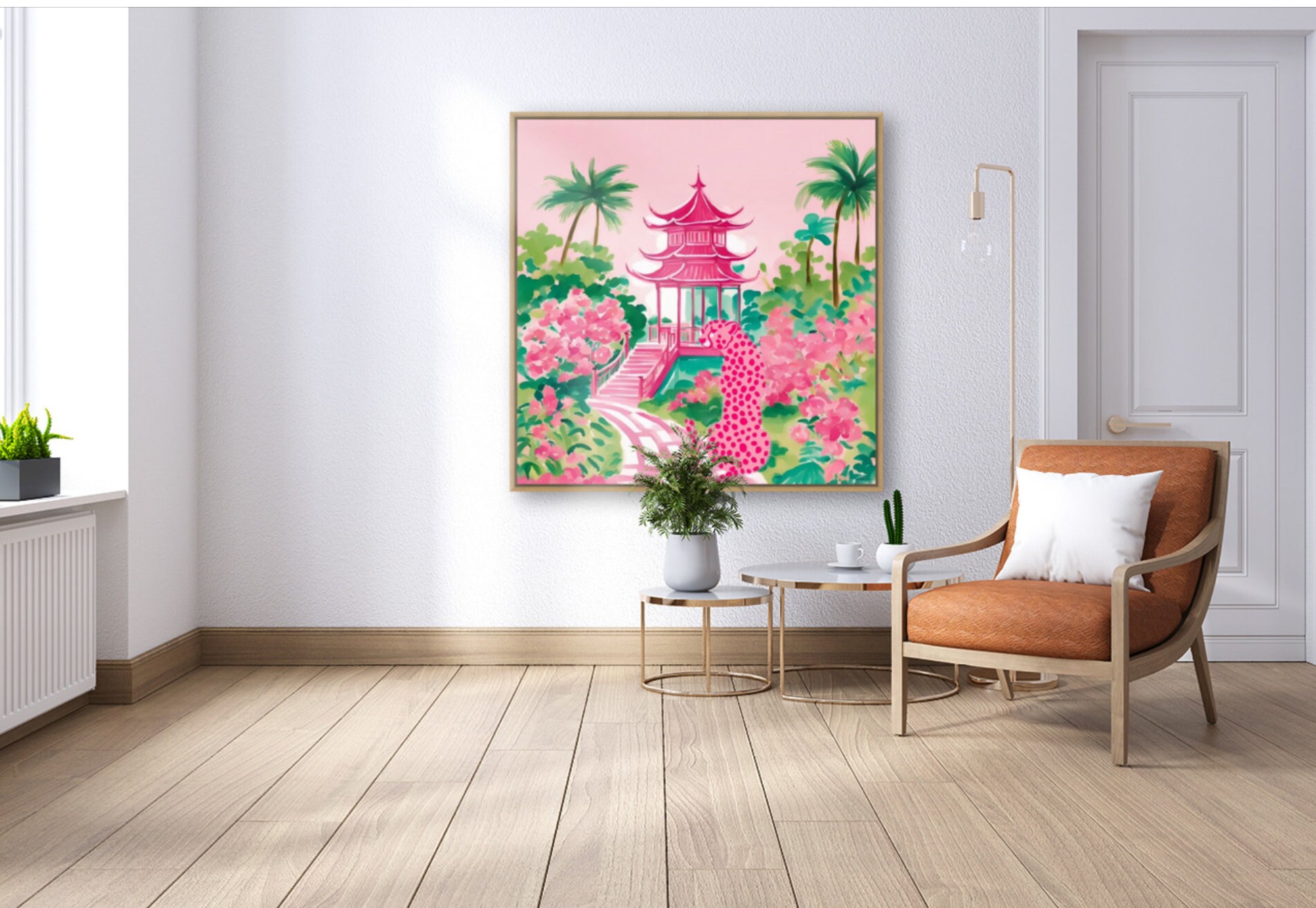 Grandmillennial art, preppy pink Cheetah in pink and green pagoda garden, whimsical watercolor