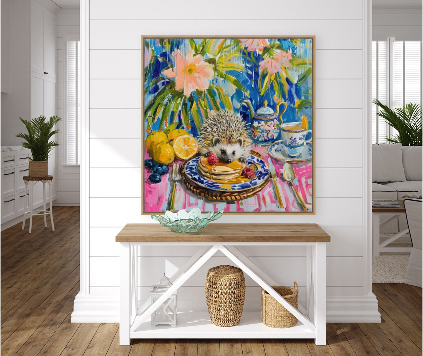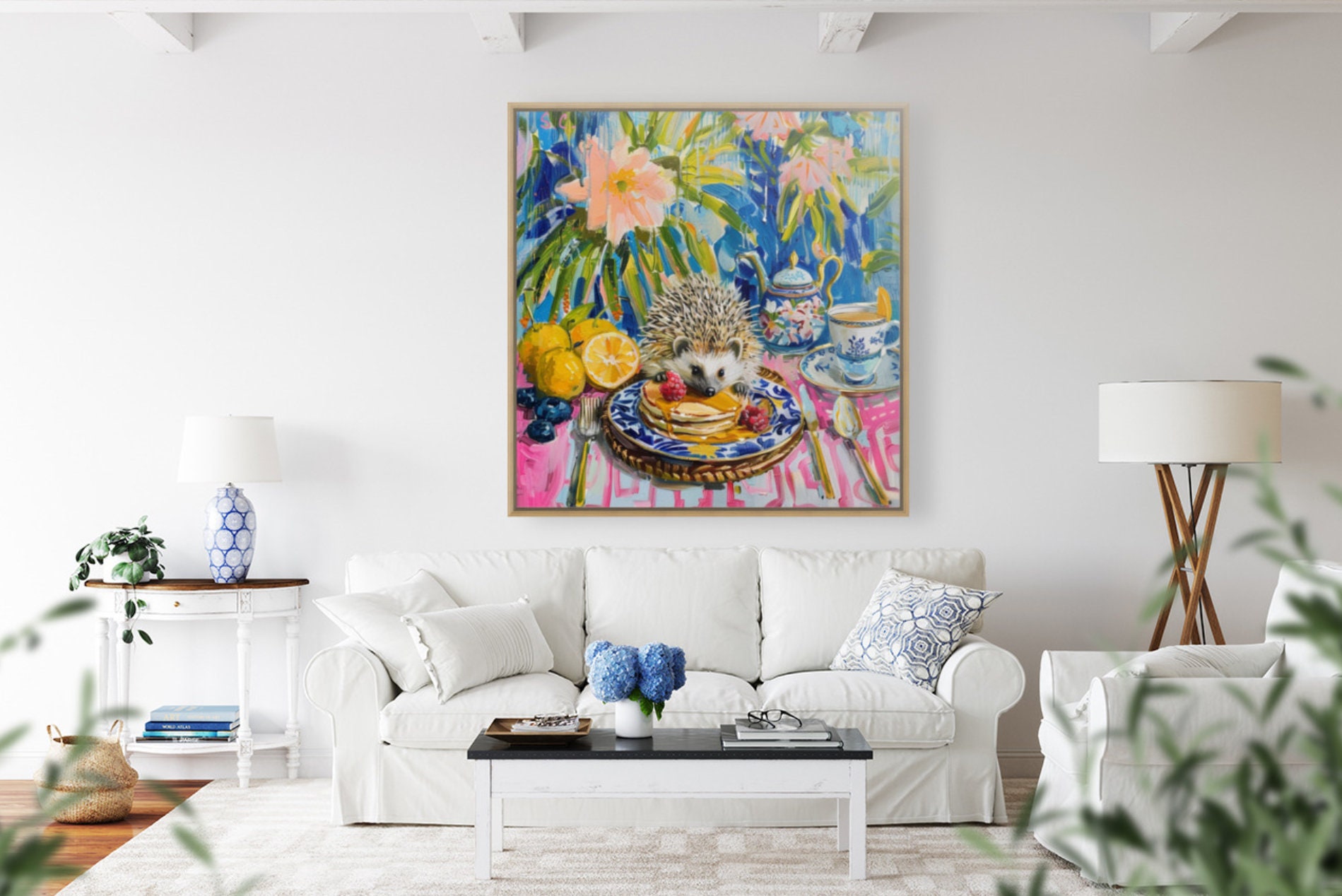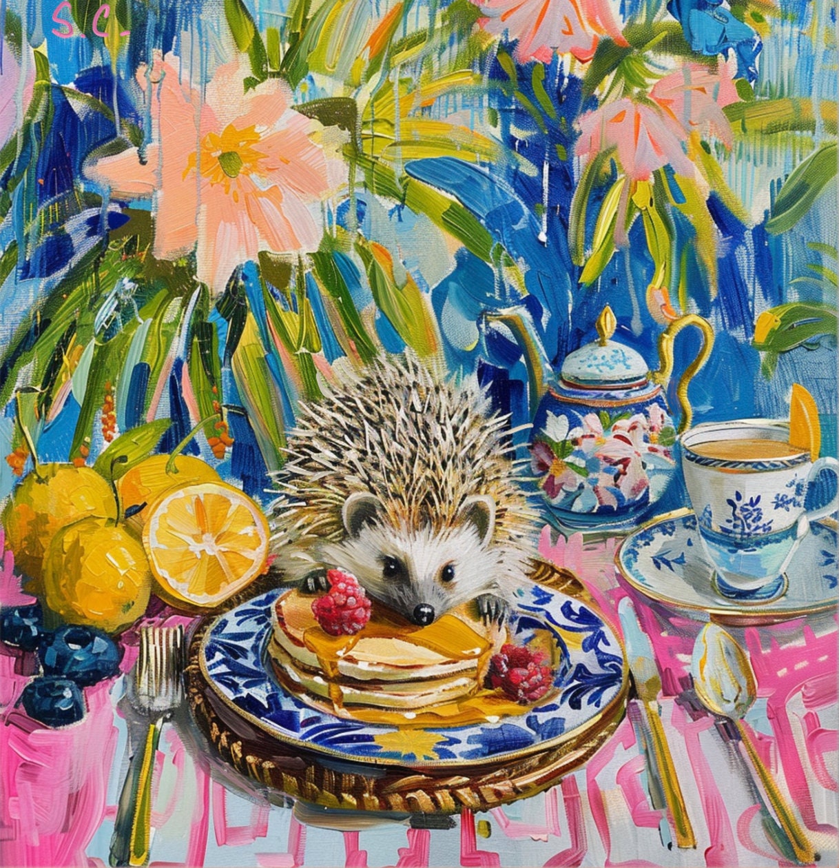 Sophie's art is the modern interpretation of Chinese artistic traditions featuring pagodas, landscapes, blue and white porcelain, ginger jars, pagodas, cheetahs and monkeys. Sophie developed her own recognizable style with bright colors and whimsical details.