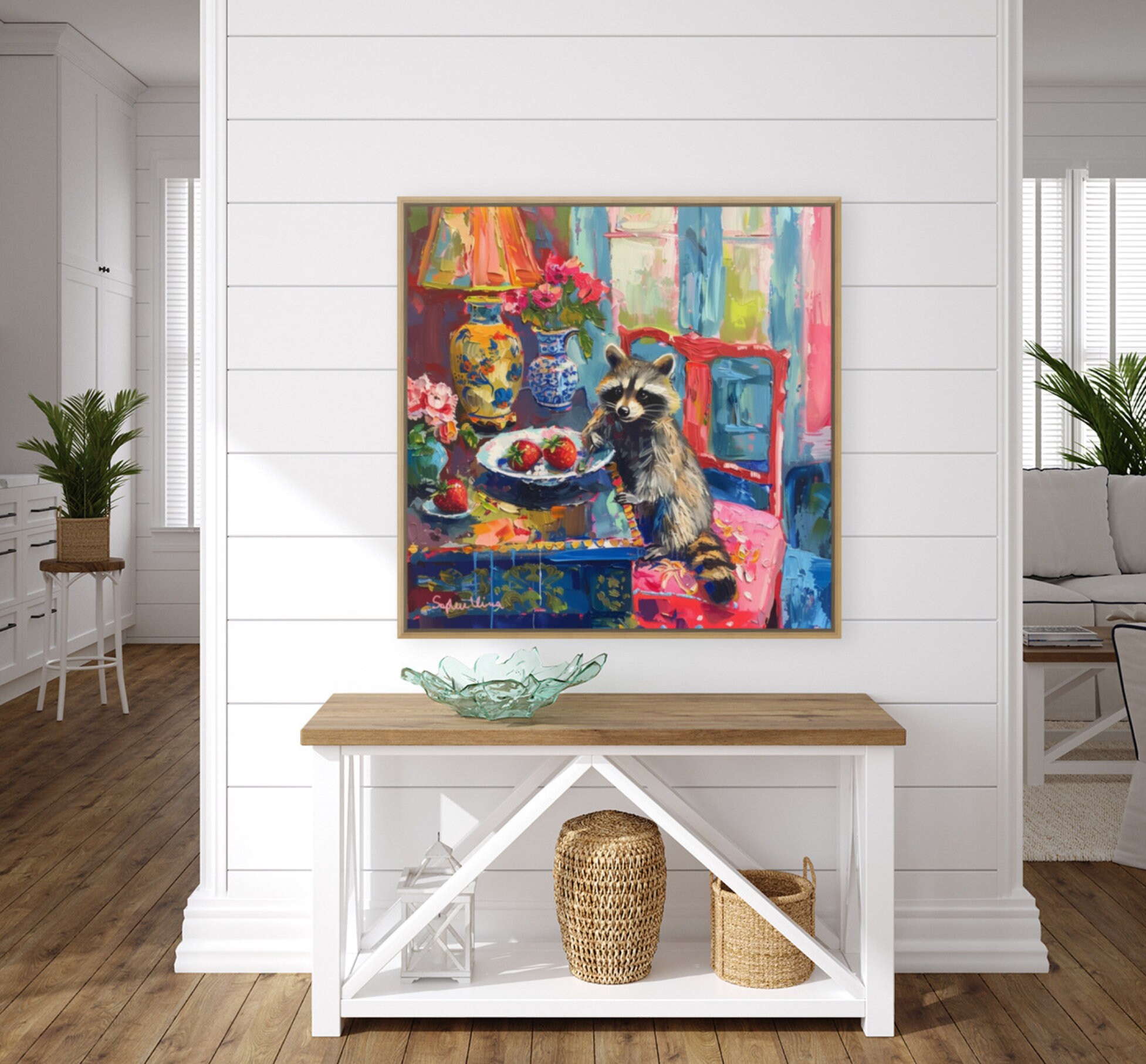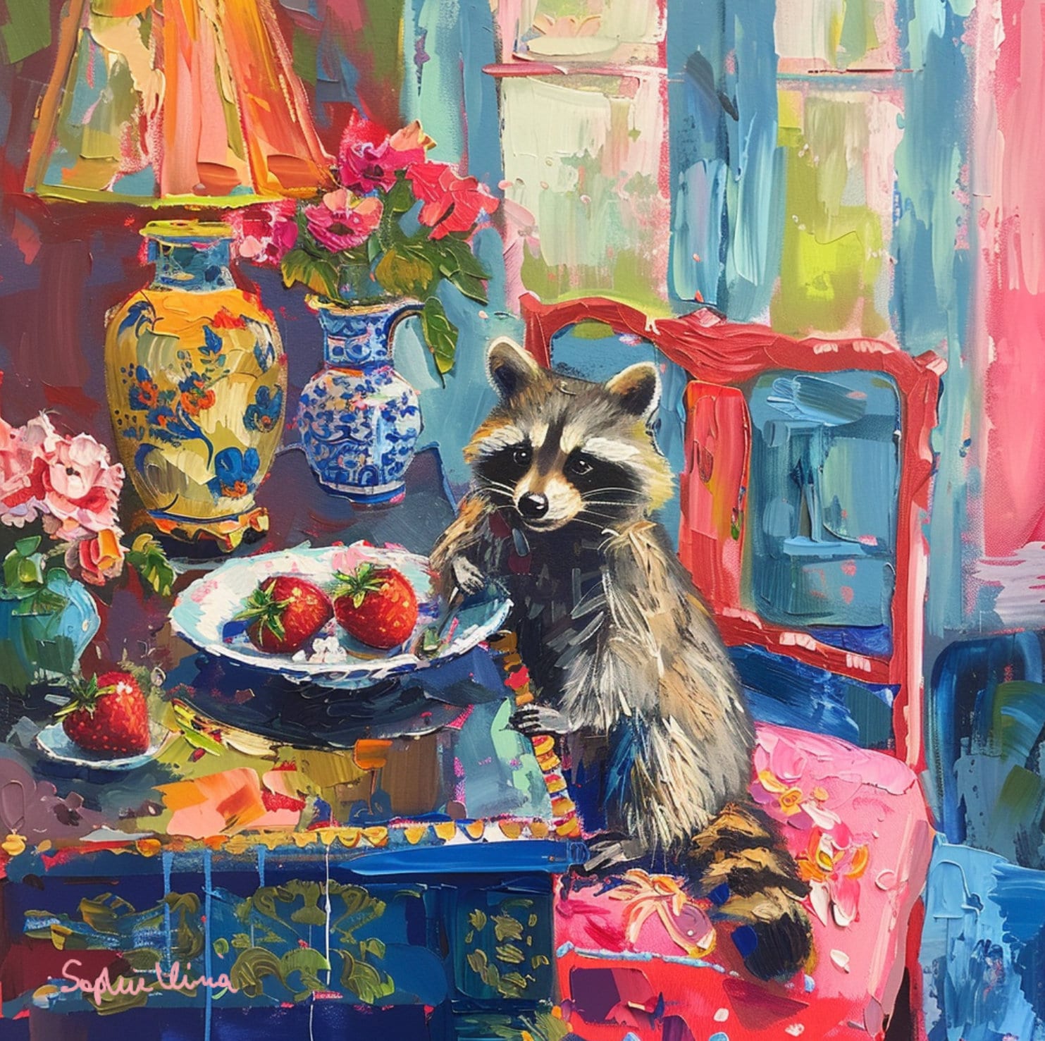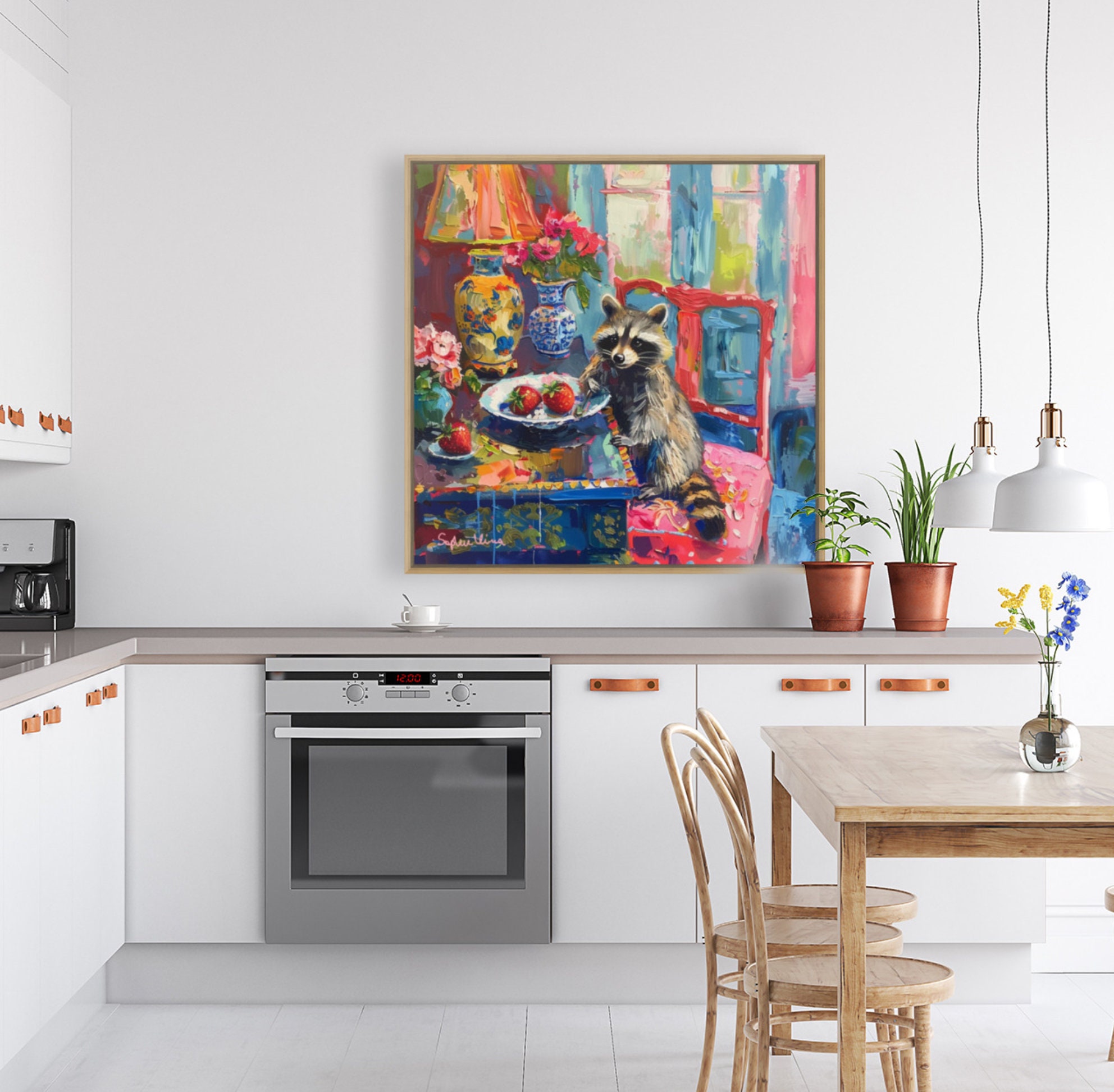 Grandmillennial art, Strawberry Thief, raccoon oil painting