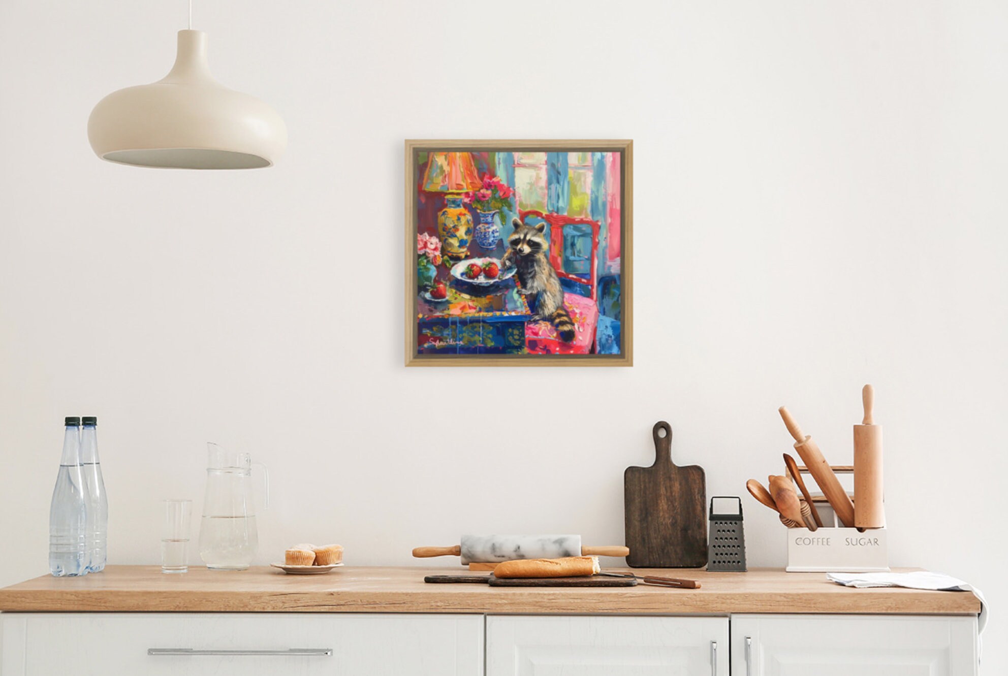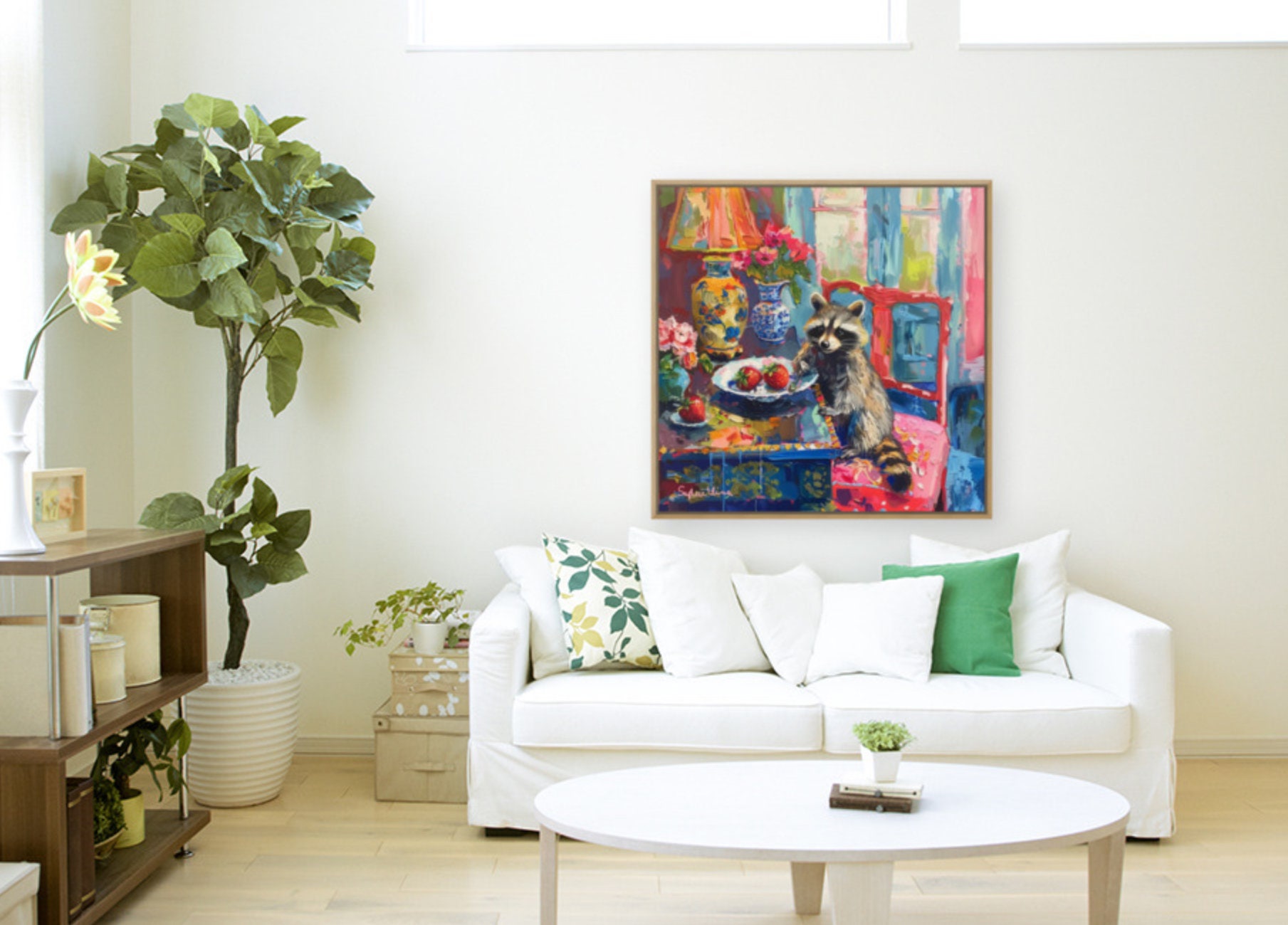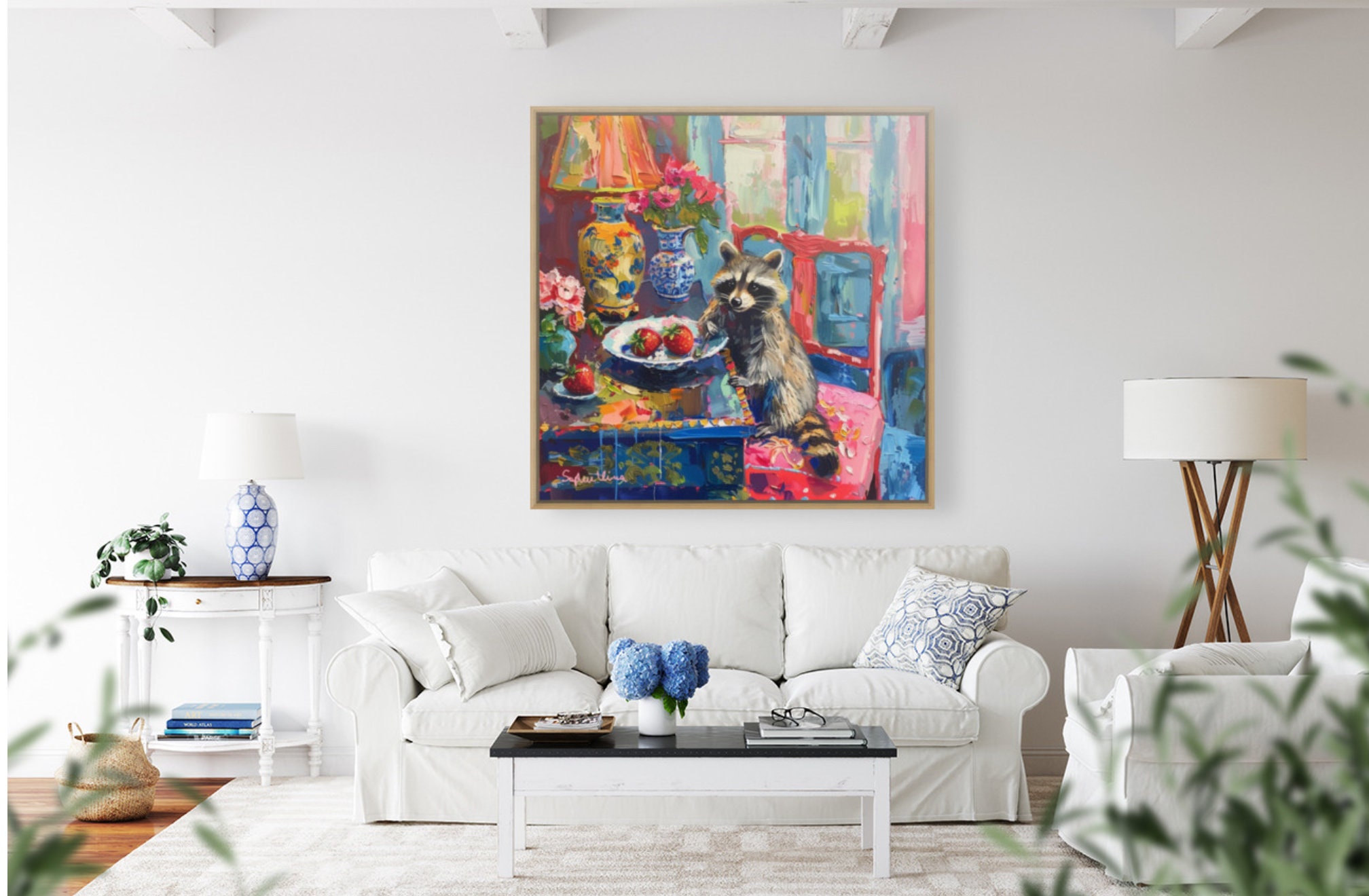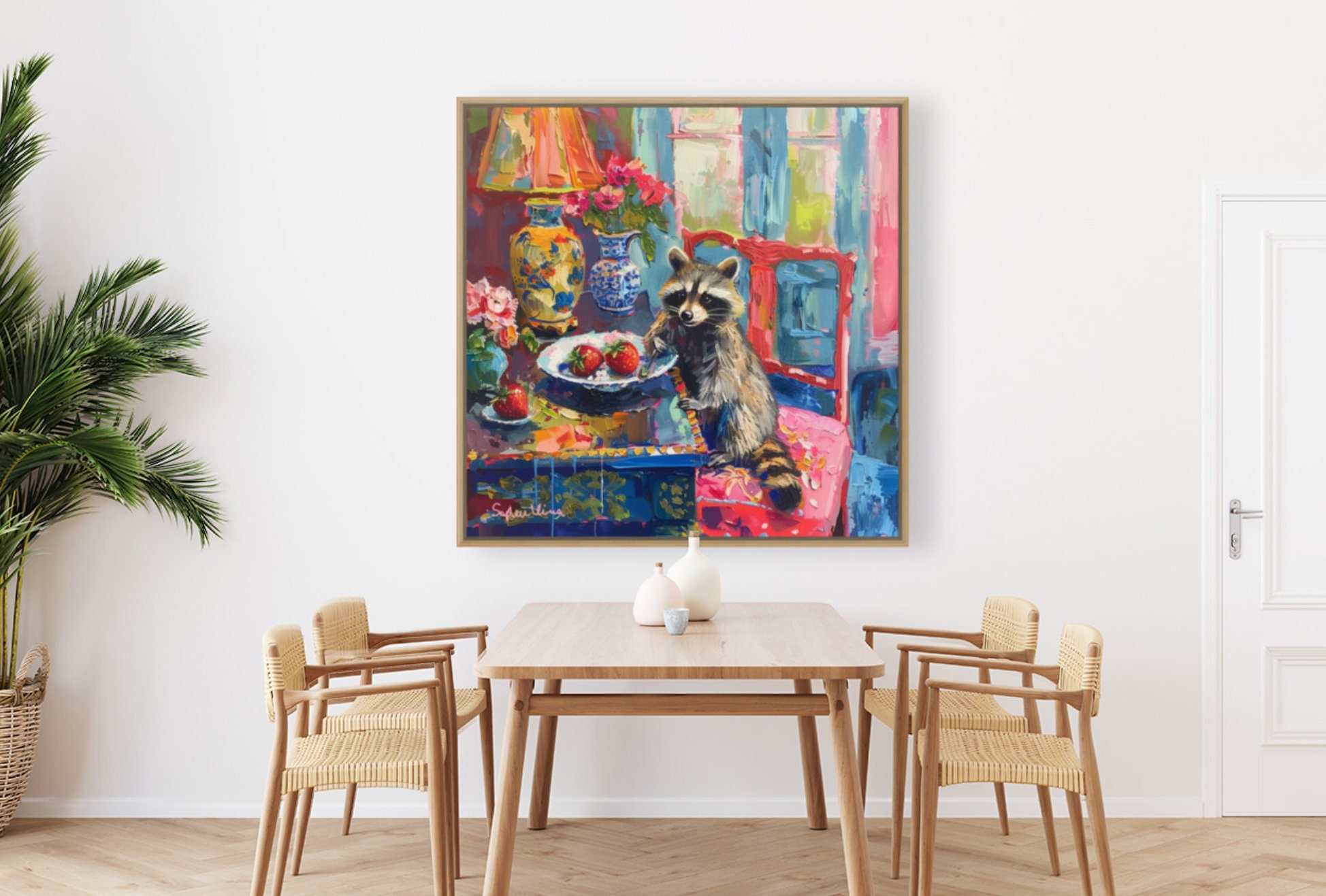 Grandmillennial art, Strawberry Thief, raccoon oil painting